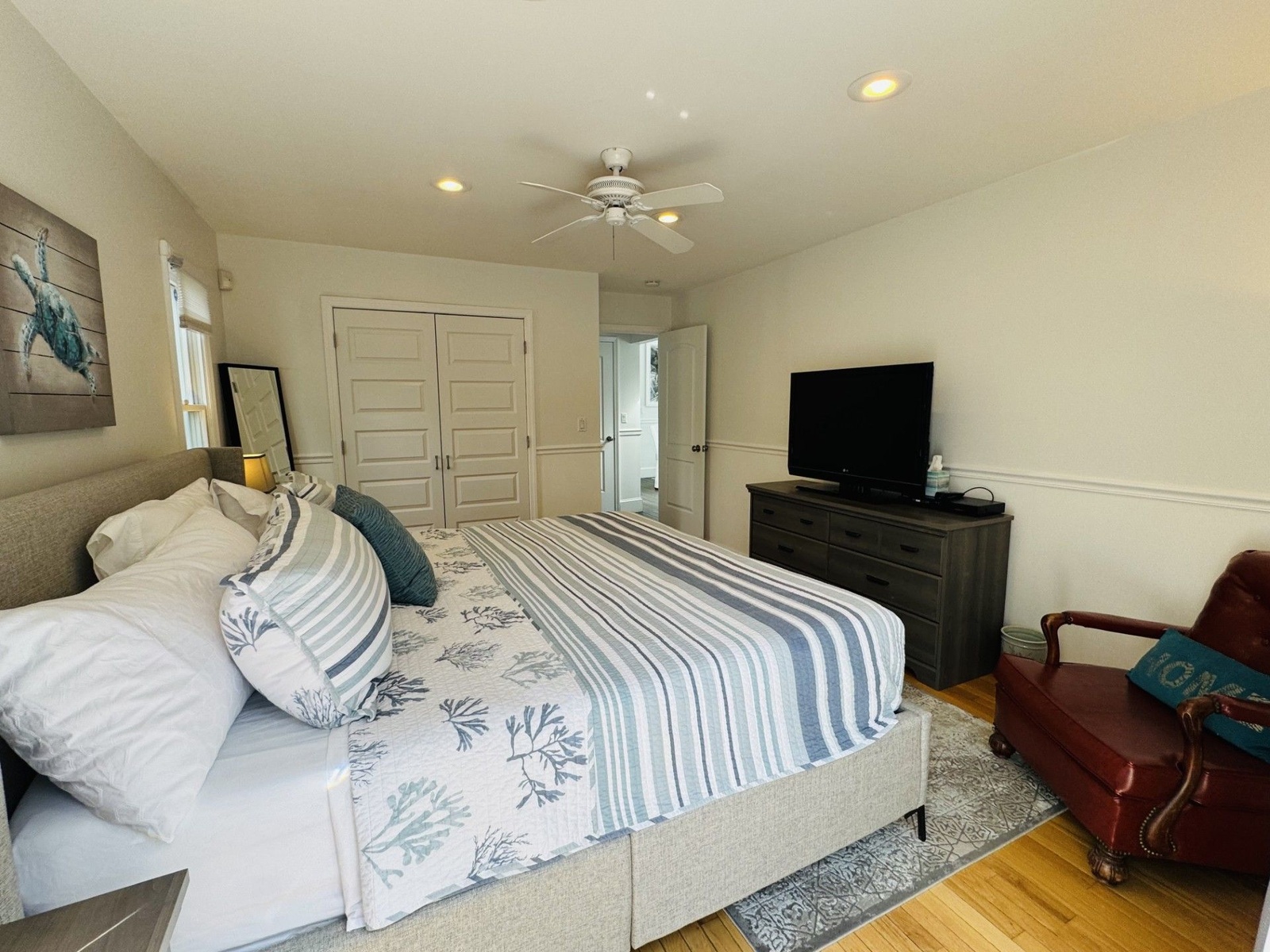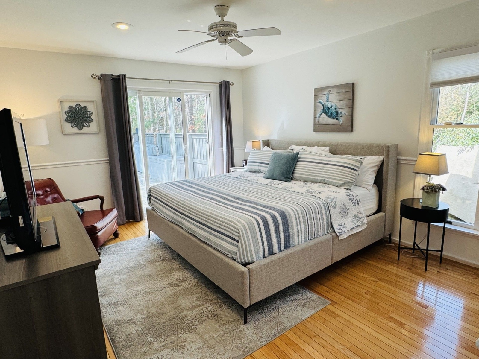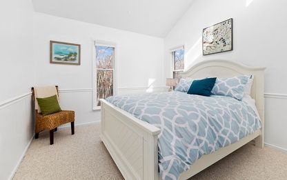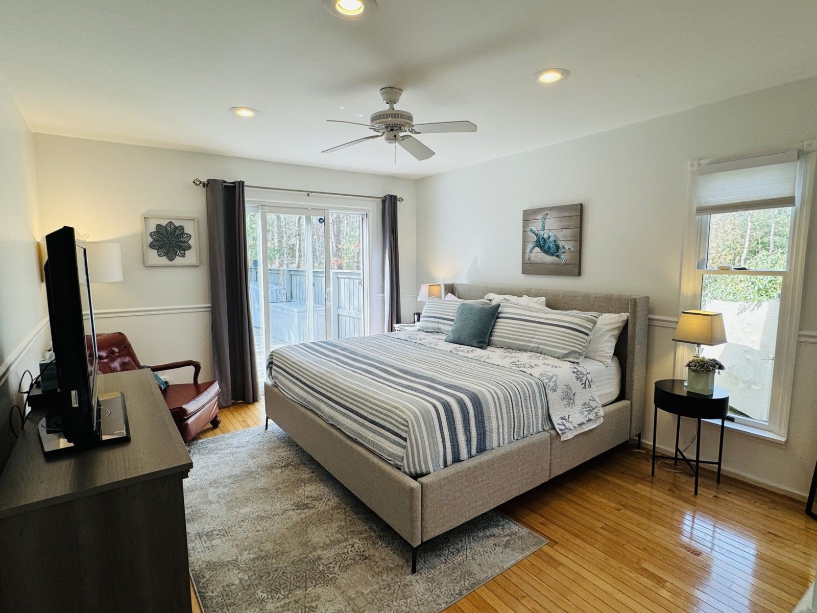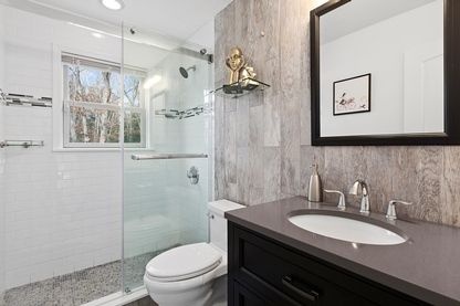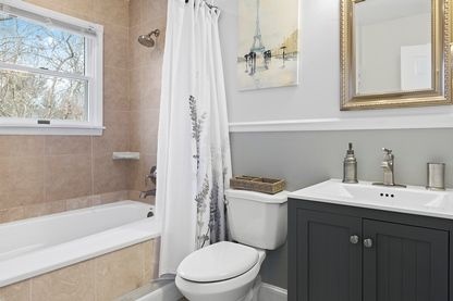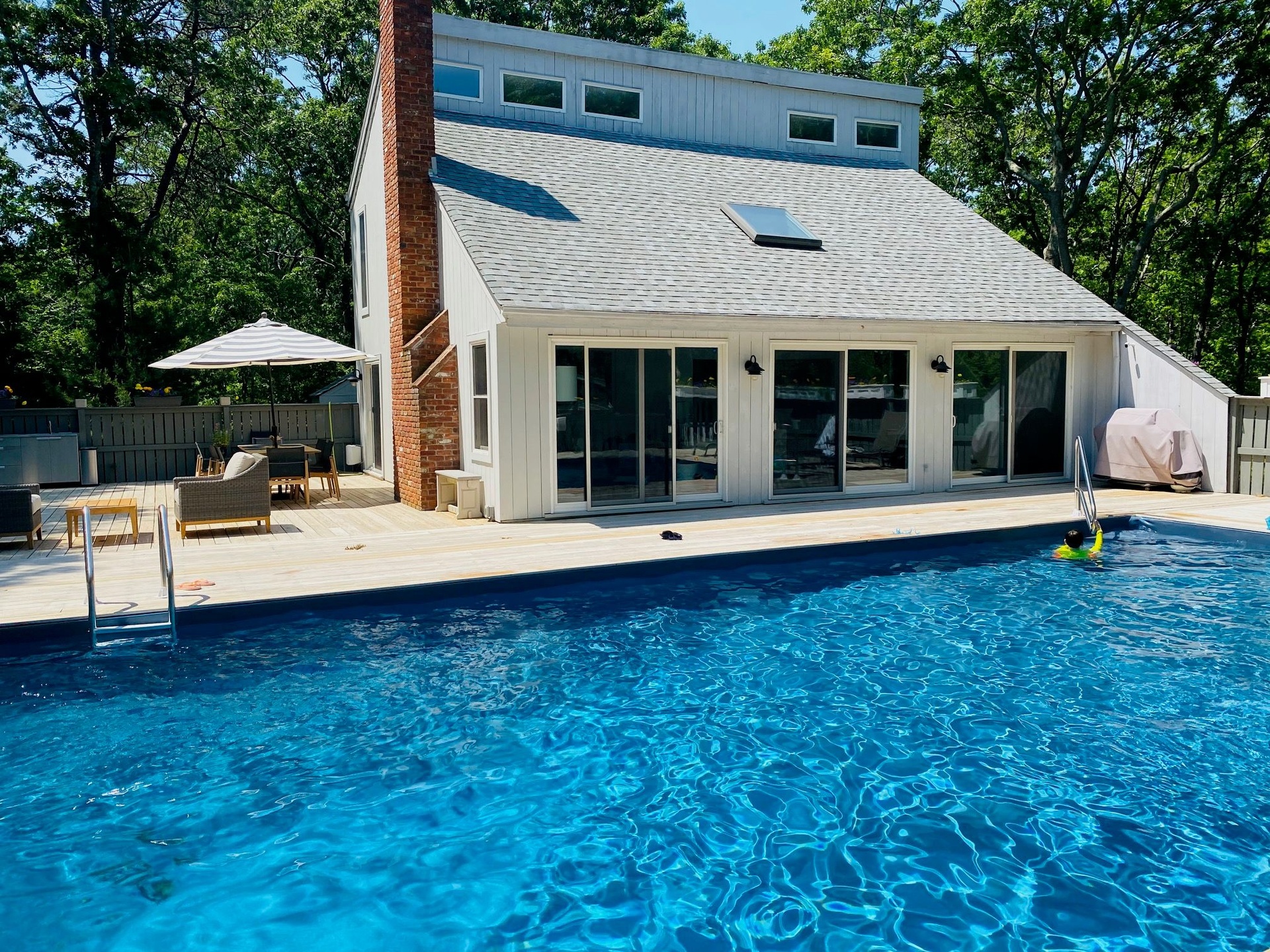 This 4-bedroom, 3-bath home in the East Hampton Village fringe has been recently renovated to offer modern comfort and style. The spacious living and dining area, complete with a cozy fireplace, opens onto a large deck that surrounds a heated saltwater pool, creating an ideal space for relaxation and entertaining.
