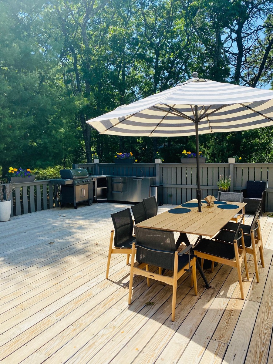 The outdoor area features a newly installed kitchen with an in-line propane grill, a side burner, stainless steel prep space, and a sink with running water. A teak seating area includes two chairs, a sofa, a table, and a large dining table for eight. A heated outdoor shower adds convenience.