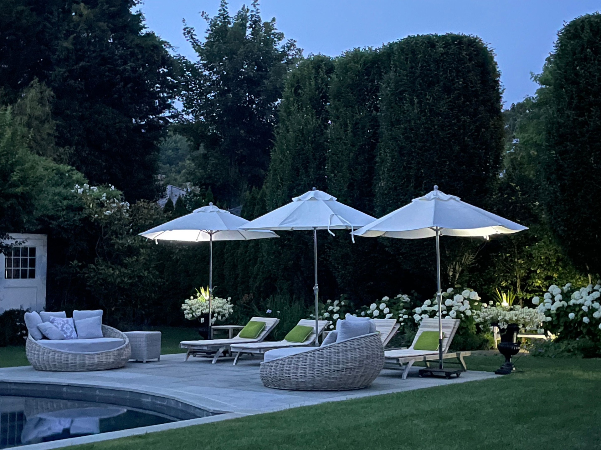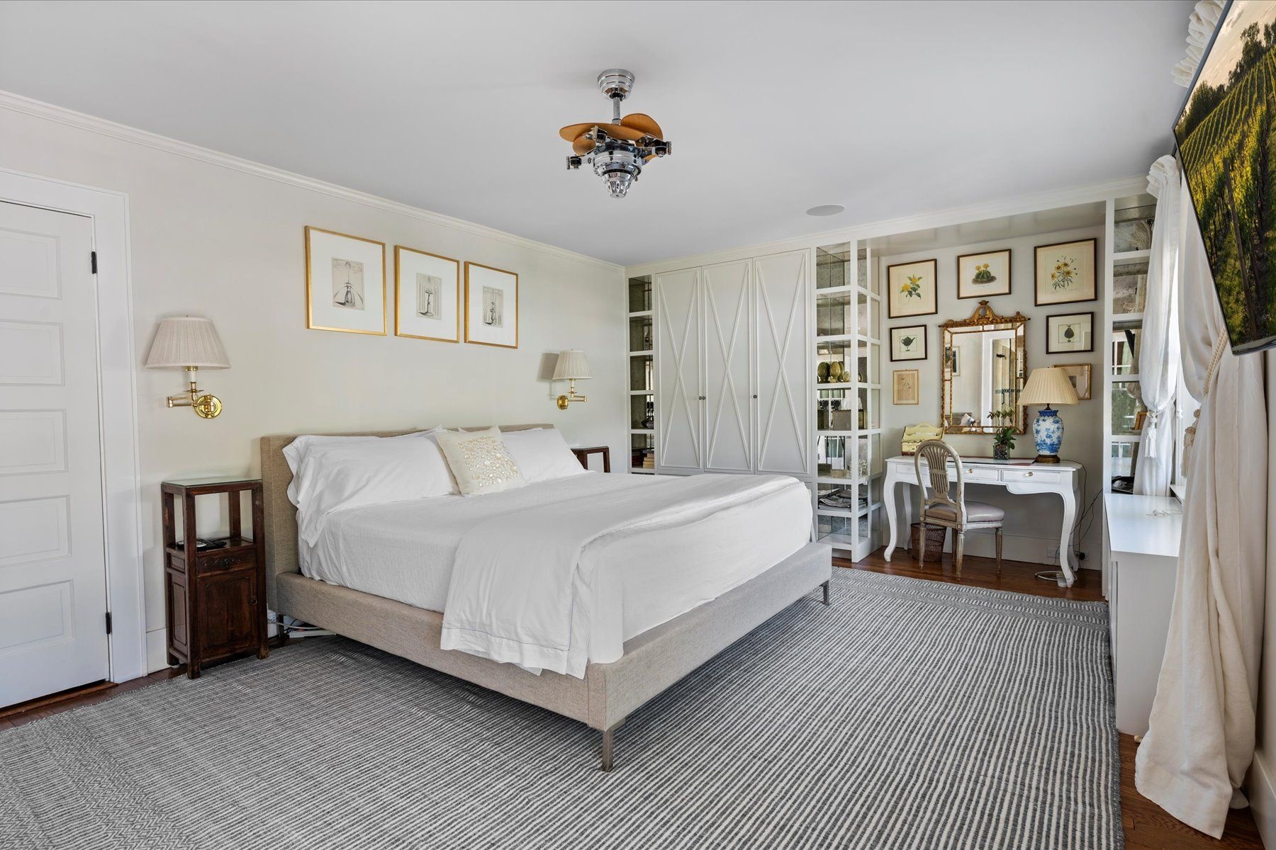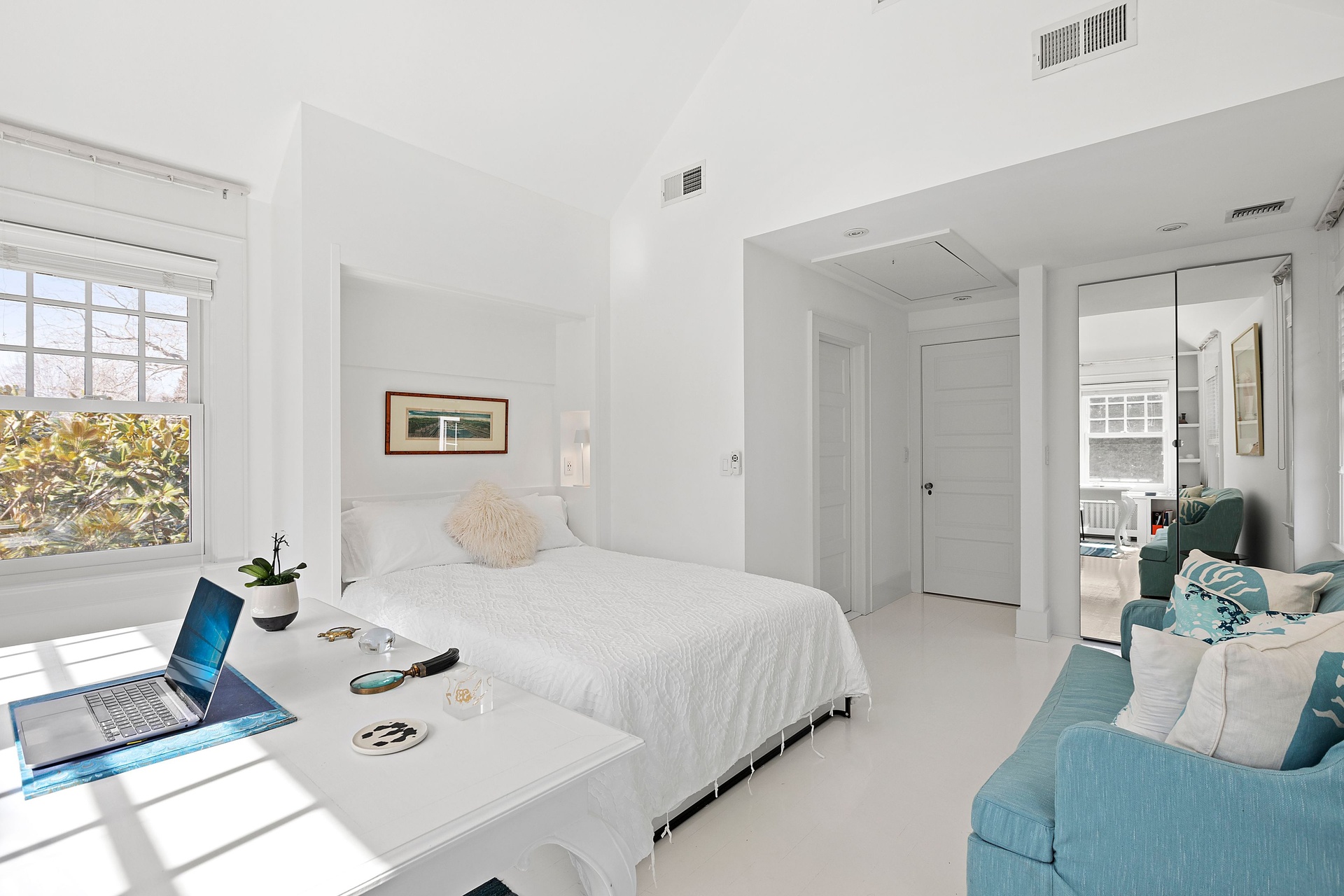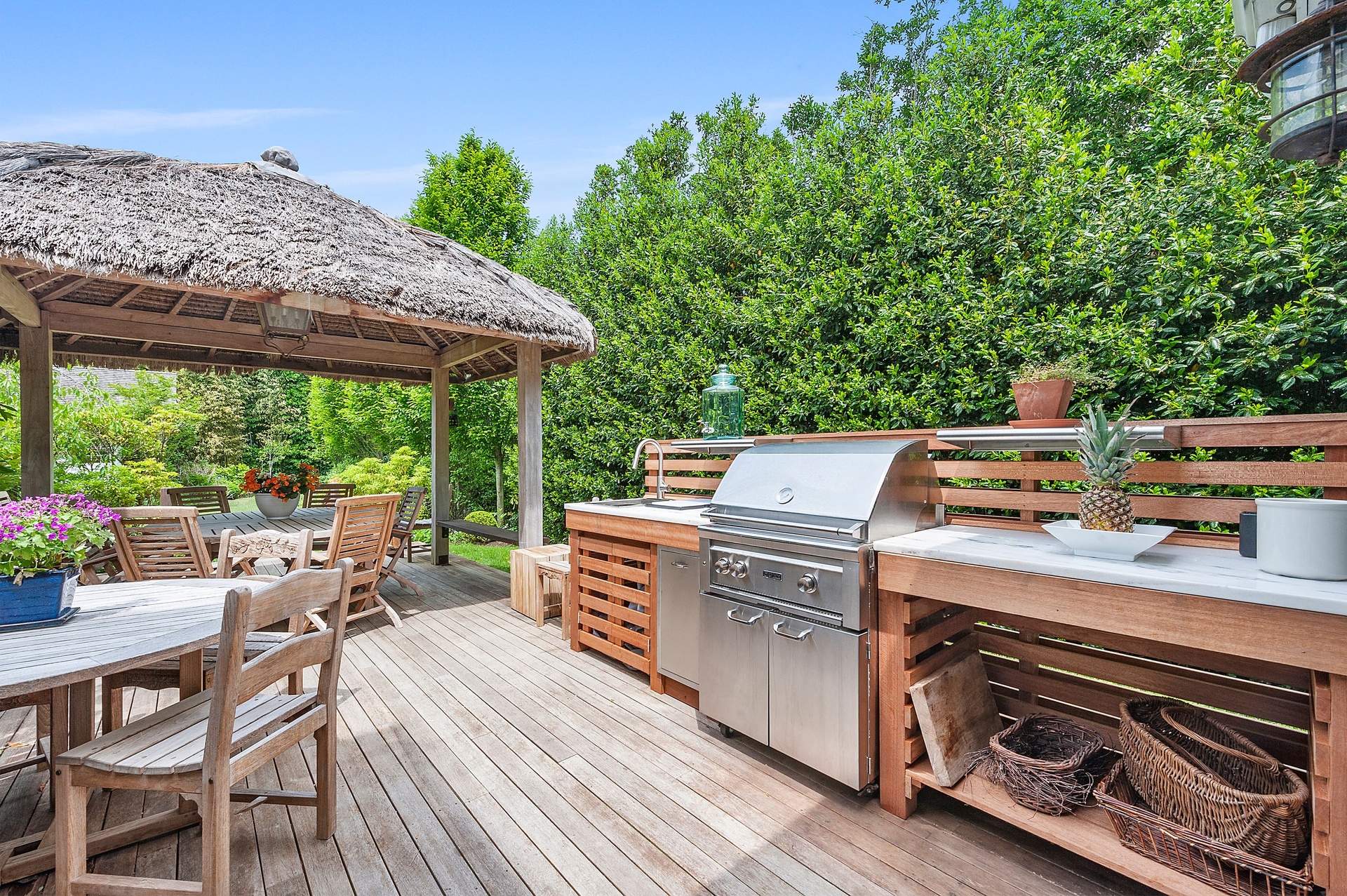 The ground floor has new bright kitchen with Wolf/Sub-zero and miele appliances and an 11 foot center island, and adjoining formal dining room at one end and outdoor dining deck with Lynx BBQ.There is a powder room in entrance hall,a cozy den/livingroom with fireplace, a Master bedroom that opens to zen-like private white perennial garden room with formal pond.The new west-facing Great room opens to large patios for outdoor entertaining. Second floor has Master bedroom with balcony and art-deco inspired black and white marble bathroom, as well as 5 additional guest bedrooms and 4 bathrooms, 2 with 2 twin beds, 2 with queen beds, and 1 with 2 double beds.