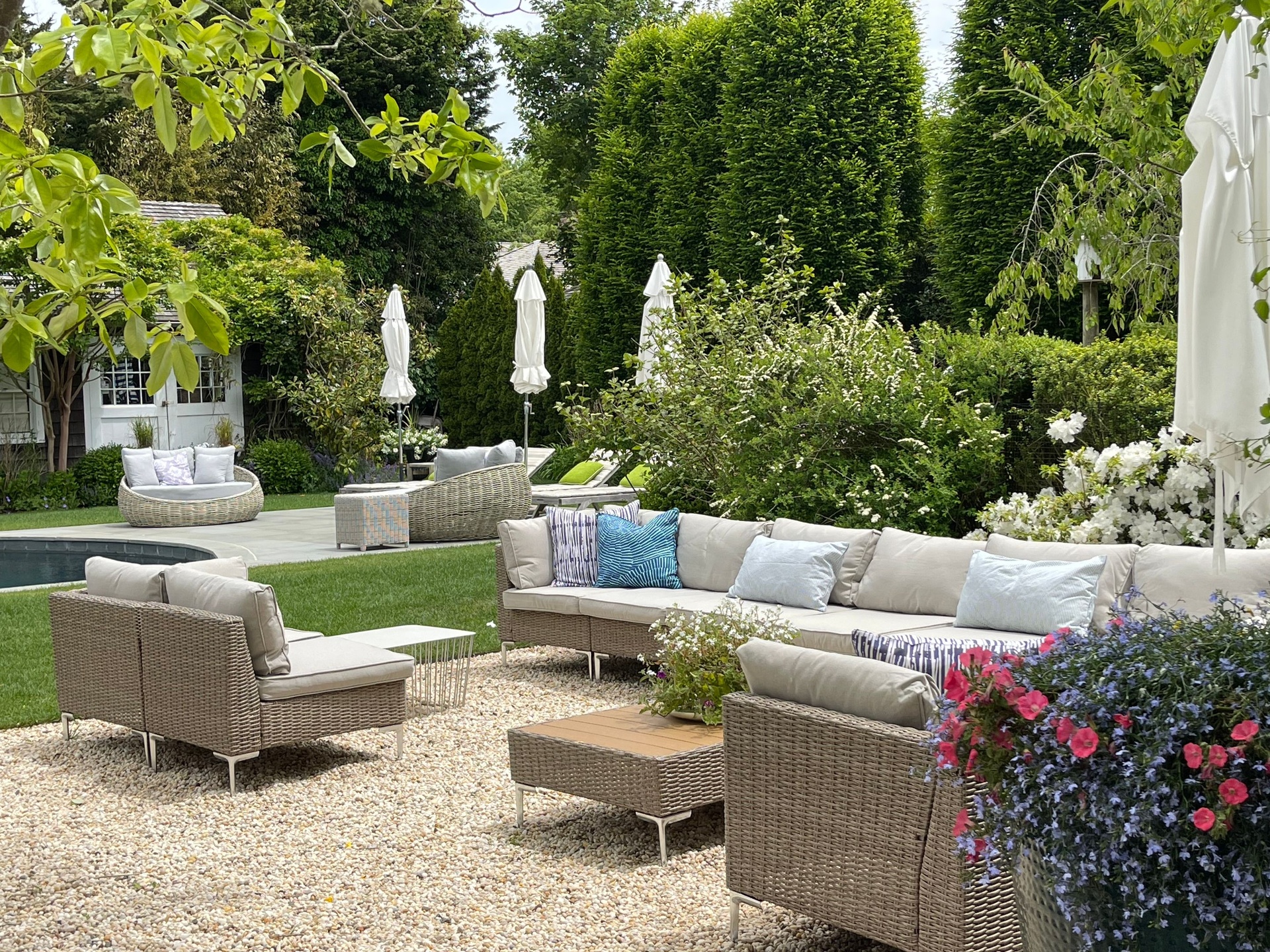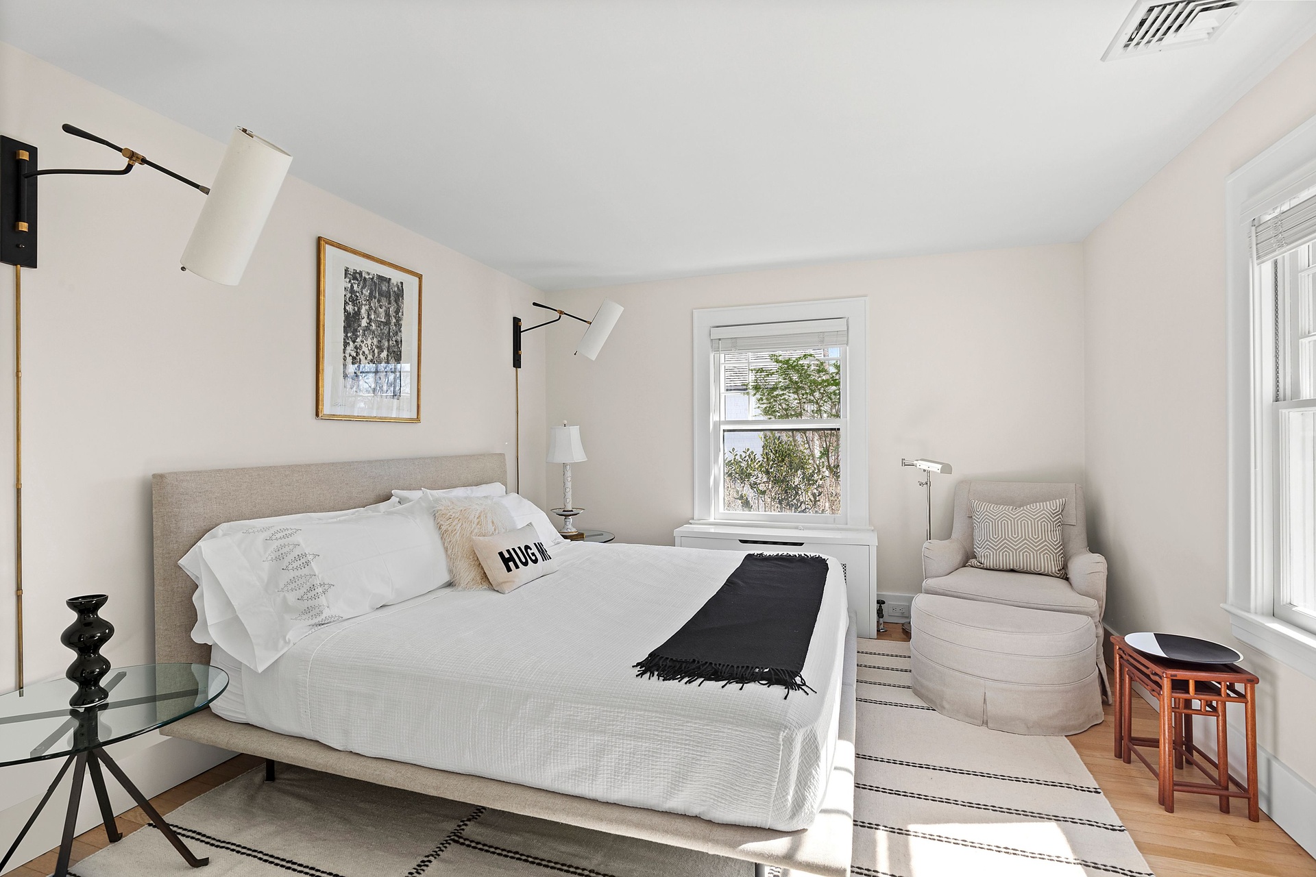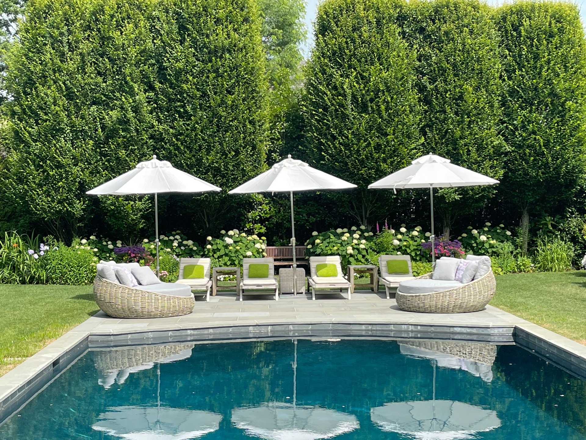 The ground floor has new bright kitchen with Wolf/Sub-zero and miele appliances and an 11 foot center island, and adjoining formal dining room at one end and outdoor dining deck with Lynx BBQ.There is a powder room in entrance hall,a cozy den/livingroom with fireplace, a Master bedroom that opens to zen-like private white perennial garden room with formal pond.The new west-facing Great room opens to large patios for outdoor entertaining. Second floor has Master bedroom with balcony and art-deco inspired black and white marble bathroom, as well as 5 additional guest bedrooms and 4 bathrooms, 2 with 2 twin beds, 2 with queen beds, and 1 with 2 double beds.