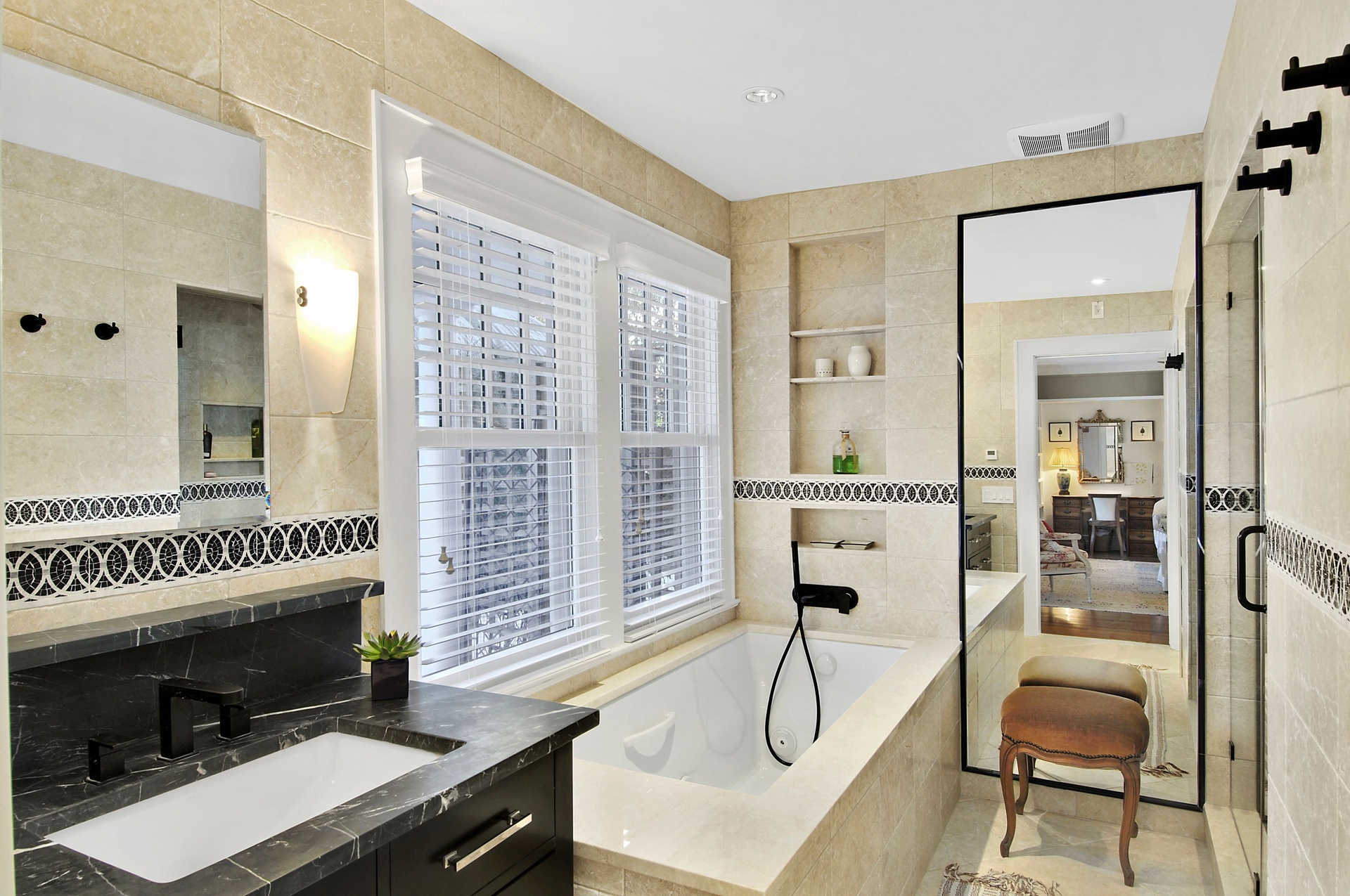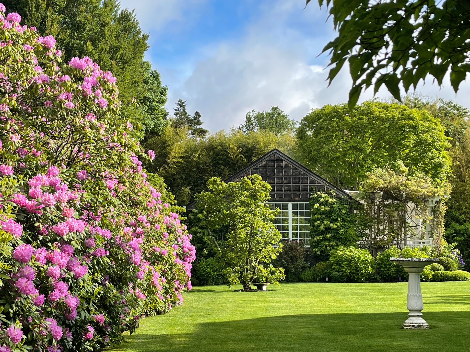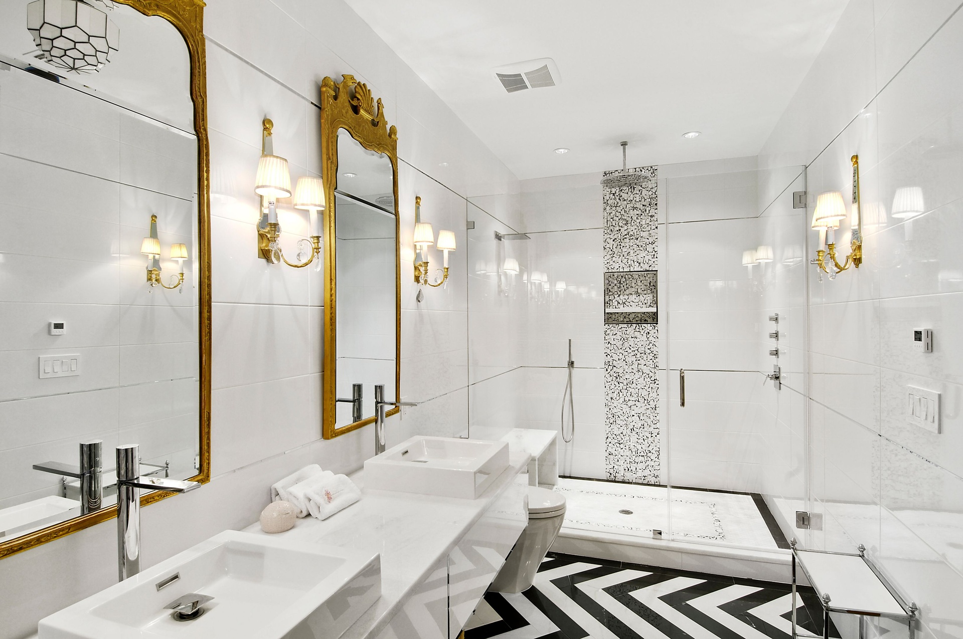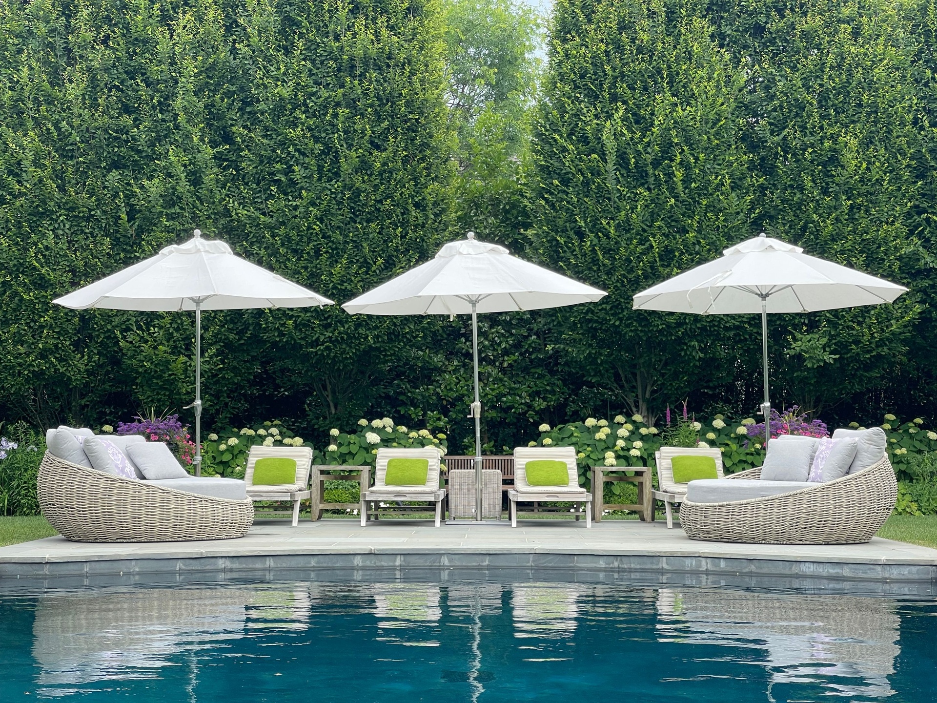 The ground floor has new bright kitchen with Wolf/Sub-zero and miele appliances and an 11 foot center island, and adjoining formal dining room at one end and outdoor dining deck with Lynx BBQ.There is a powder room in entrance hall,a cozy den/livingroom with fireplace, a Master bedroom that opens to zen-like private white perennial garden room with formal pond.The new west-facing Great room opens to large patios for outdoor entertaining. Second floor has Master bedroom with balcony and art-deco inspired black and white marble bathroom, as well as 5 additional guest bedrooms and 4 bathrooms, 2 with 2 twin beds, 2 with queen beds, and 1 with 2 double beds.