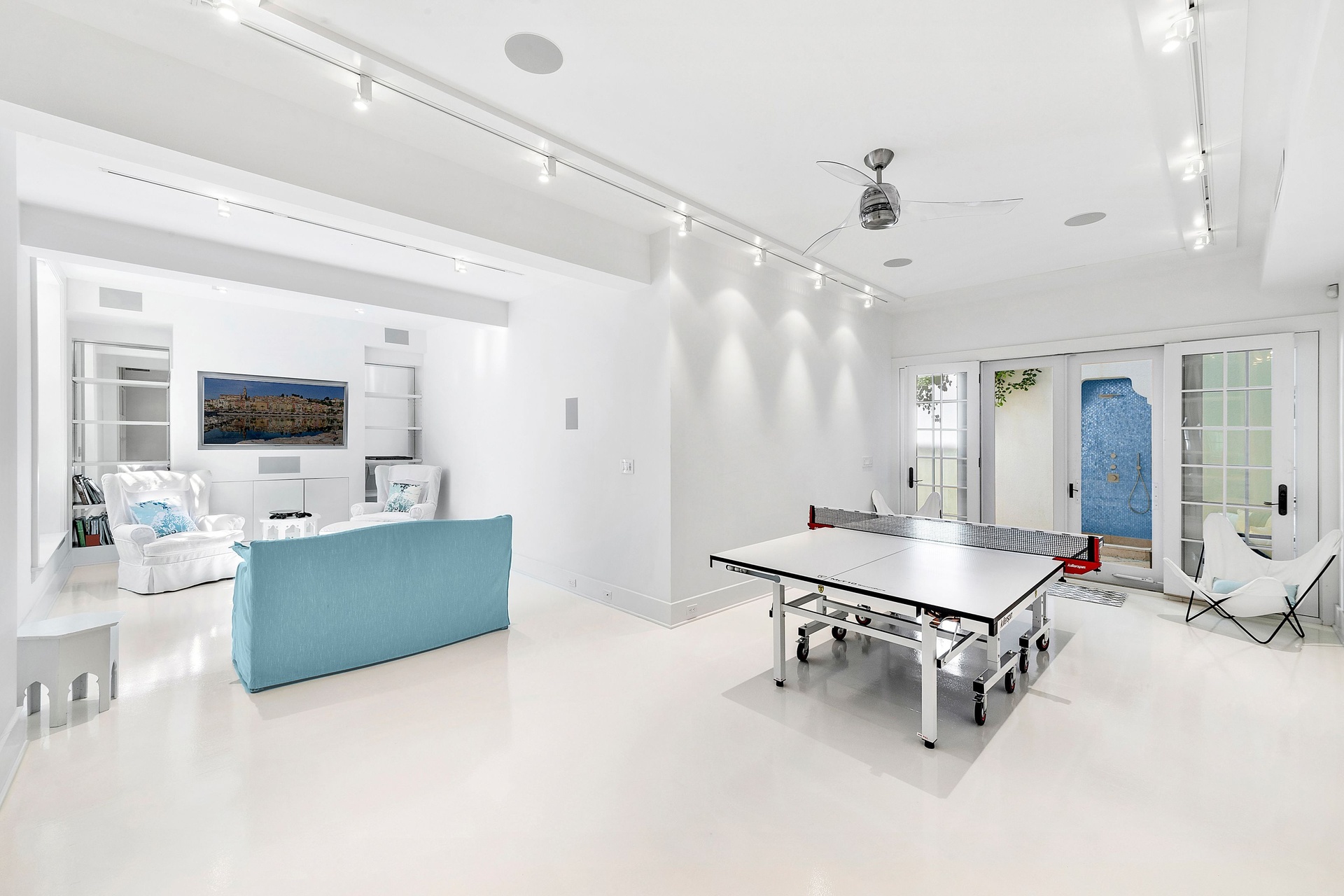 The finished lower level has media area with 60" tv, Killerspin pingpong table, and access point from exterior stairwell and sunken patio.