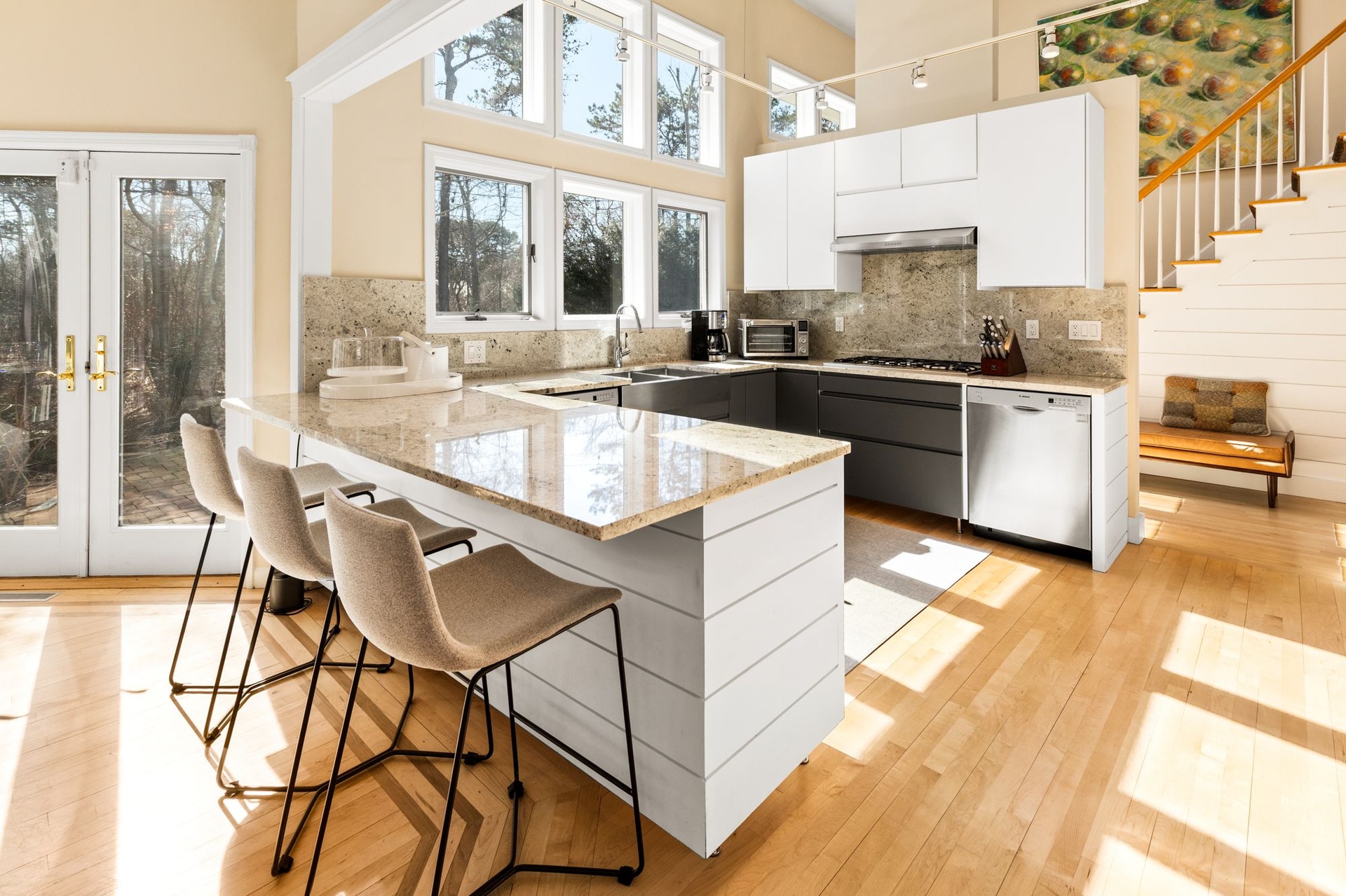 This Contemporary has a Gated Drive on 1 acre of beautifully landscaped grounds located just 2 miles from East Hampton Village. Walk into a Great Open Living Area. Spacious Living Room, Gorgeous Dining, and Gourmet Kitchen. There are 2 large bedrooms with Queen beds and Ensuite Bathrooms. Upstairs boasts a King Size Master Bedroom with a Large Ensuite Bath. Including Loft on the landing upstairs. The exterior features include a Large Brick Patio surrounding an 18 X 38 Heated Swimming Pool, an Indoor Jacuzzi Bathtub, an Outdoor Shower, a steam shower, and a Circular Drive. Very Clean and Serene and Creates a Great Summer Oasis.