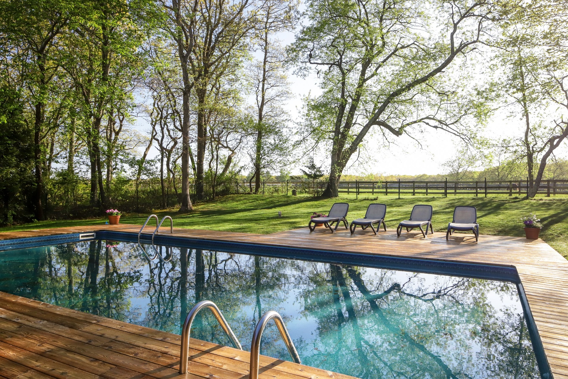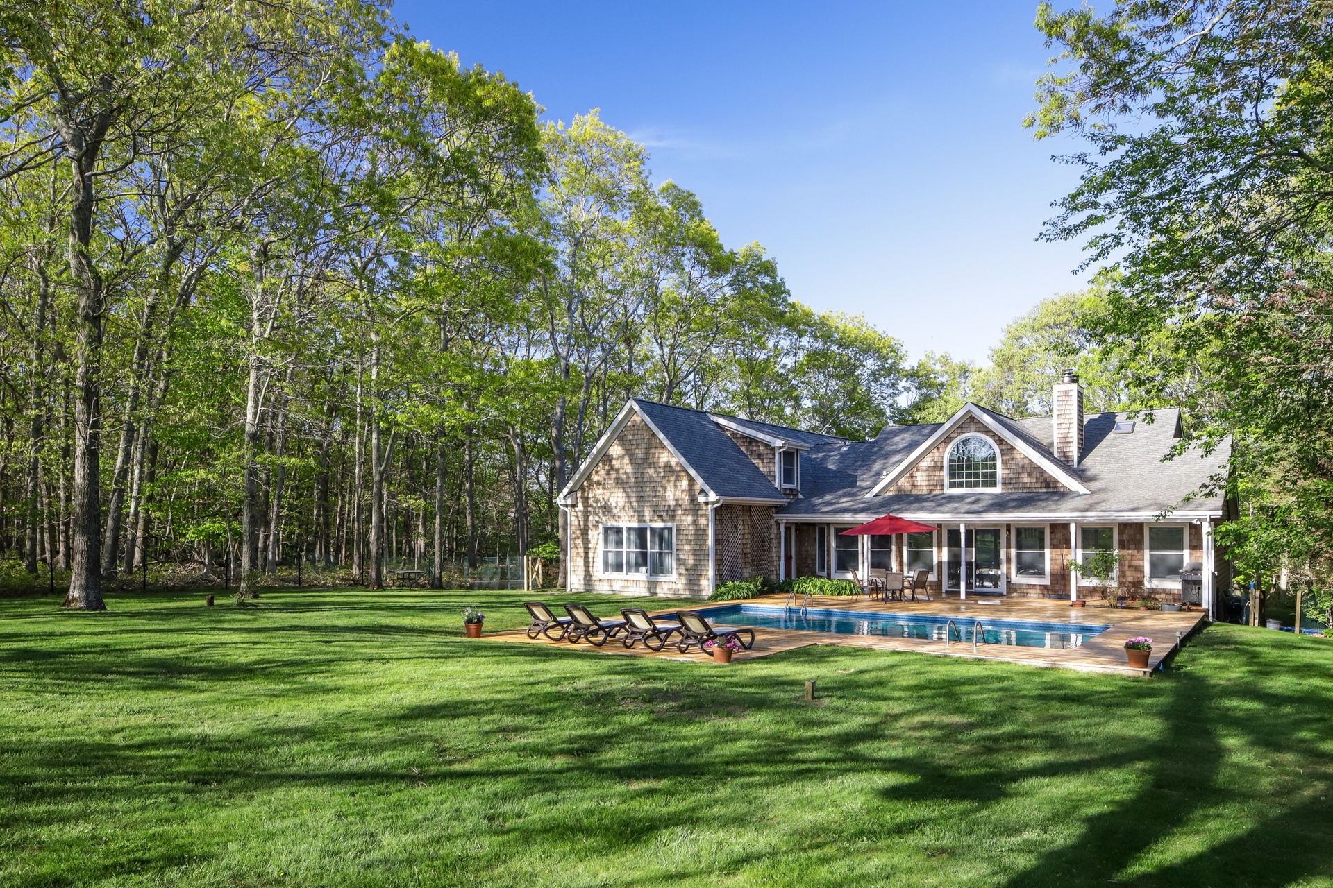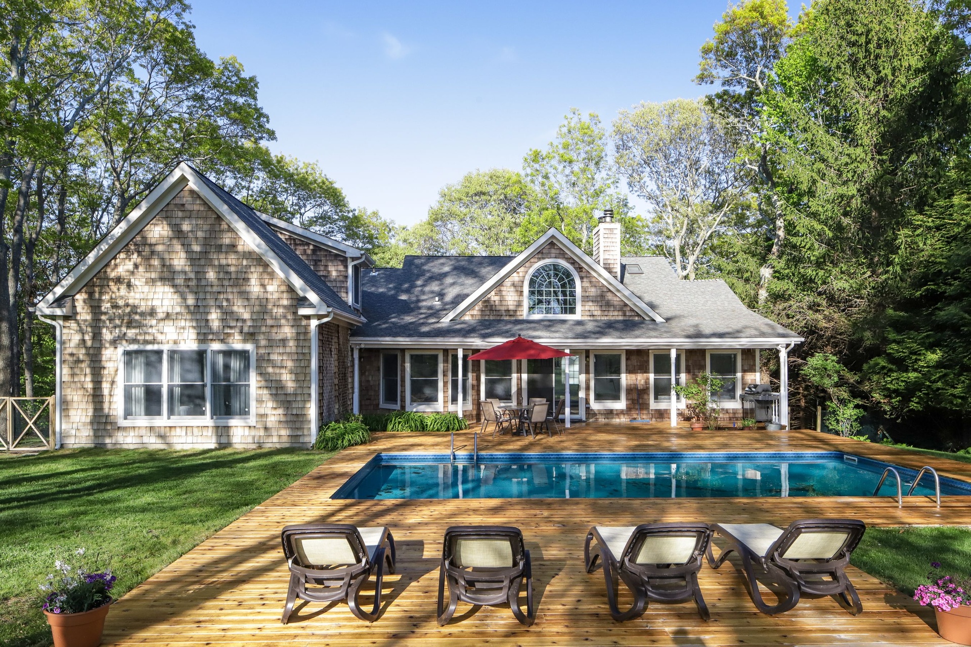 Delightful 3200 sq. ft. home with horse farm views featuring 6 bedrooms, 5 baths, central air-conditioning, full finished basement including a pool table and wet bar. Relax outside and enjoy the 1400 sq. ft deck and heated pool. 10-minute ride to the ocean.