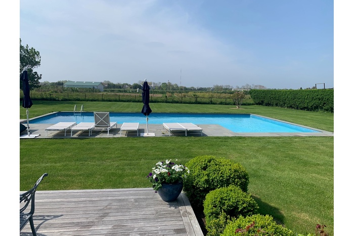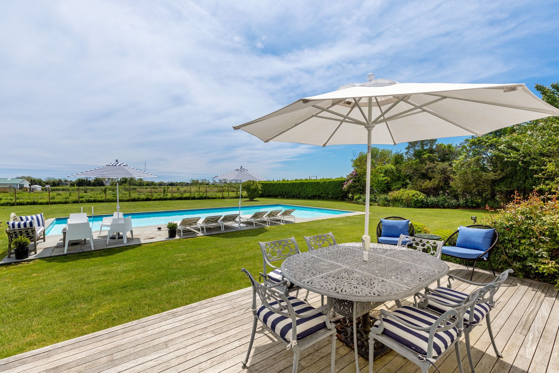 Exceptional 4 bedroom, 2 1/2 bath Water Mill home with unobstructed views to 33 acre agricultural reserve. Eat-in kitchen with white marble countertops and profesional appliances, including Wolf stove, SubZero fridge and Miele dishwasher. South facing lawn with open views to agricultural reserve, The oversized 50 x 20' heated pool has an 8 x 16' "L" shallow end ideal for both swimmers and young children. View spectacular sunsets over the adjacent farm field from the bluestone pool patio or the 27' x 12' newly built mahogany deck. The home has been freshly repainted and hardwood wood floors refinished in 2022. A new master bath with double vanity sinks and 6 x4 "rainmaker" shower has also been added in 2022. The home's impecable condition, beautiful flowering garden, mature plantings and gated entry make it a private retreat. Close to Southampton Jitney, just north of Southampton Village and ocean beaches. Town of Southampton rental permit RP 230667.