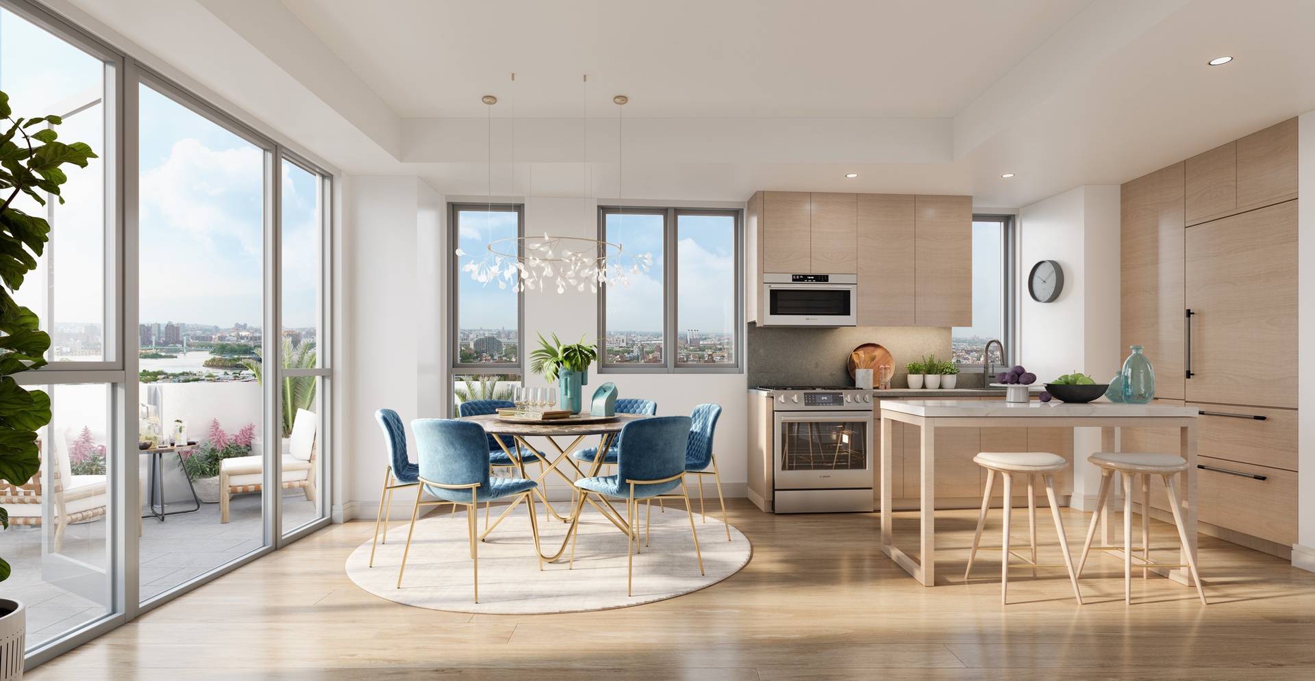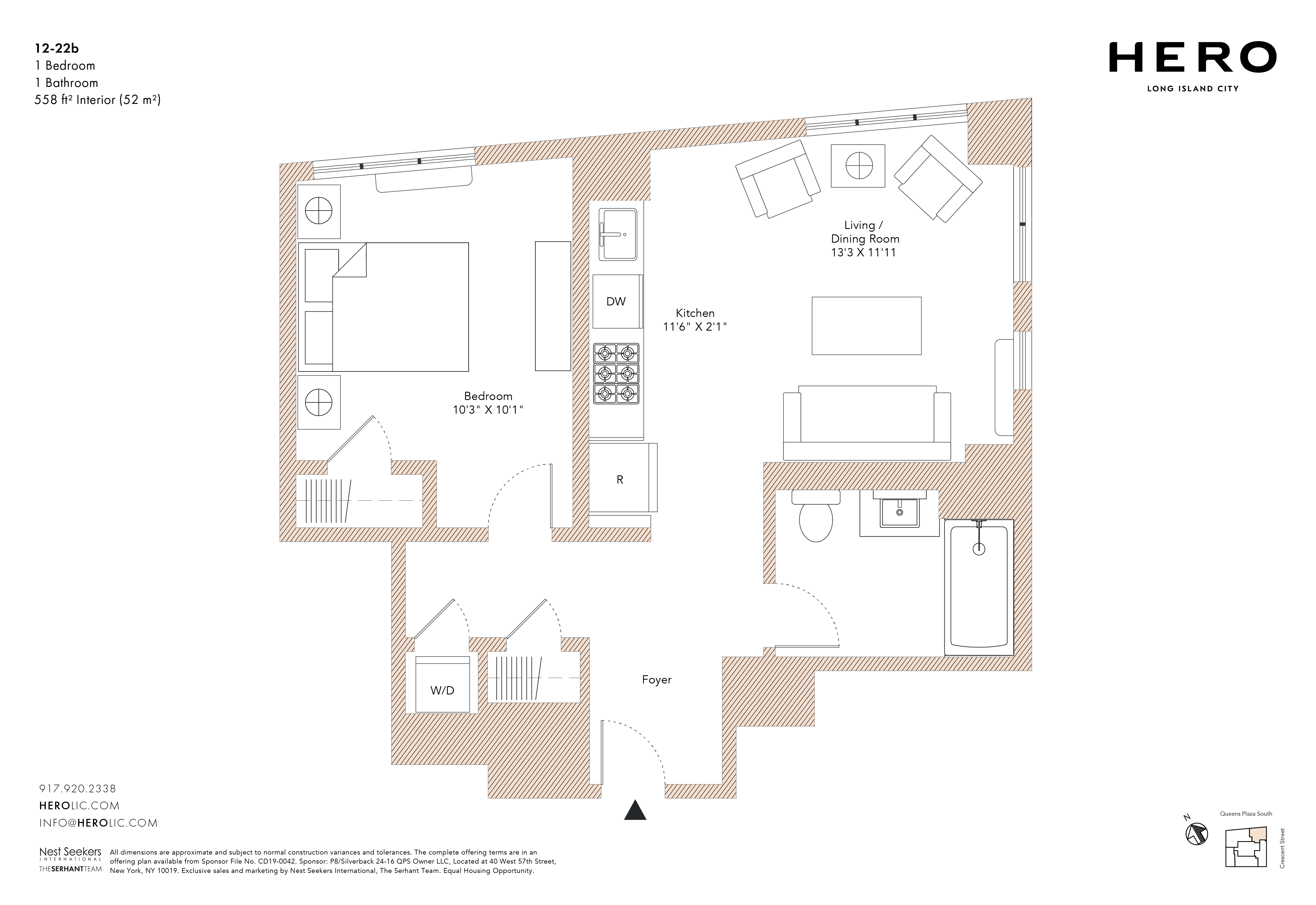 A collaboration between Silverback Development and Woods Bagot, Hero, is a full service building with attended lobby, and offers residents 15,000 sq ft of thoughtful amenities. These include an incredible rooftop deck with BBQ grills along with an integrated sky lounge and breathtaking city views, a state-of-the-art wellness center, a yoga studio with a 3,000 sq ft veranda featuring dramatic 30-ft ceilings, a multipurpose dining space, a package room, bicycle storage, a relaxing lounge, a pet spa, and a Zen garden. The building is surrounded by restaurants, cafes, bars, and shops with easy access to the stunning Long Island City waterfront. The 7/N/W/R/E/M/G subway lines are just seconds away and multiple Citi Bike locations surround the building.
