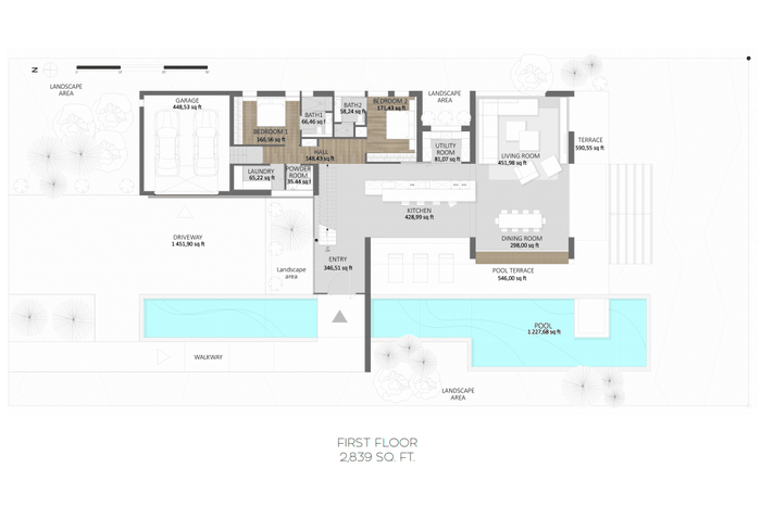 Spanning 5,121 square feet spread across two floors of openly designed space, the villa includes 5 bedrooms, 5 full bathrooms and 1 powder room.