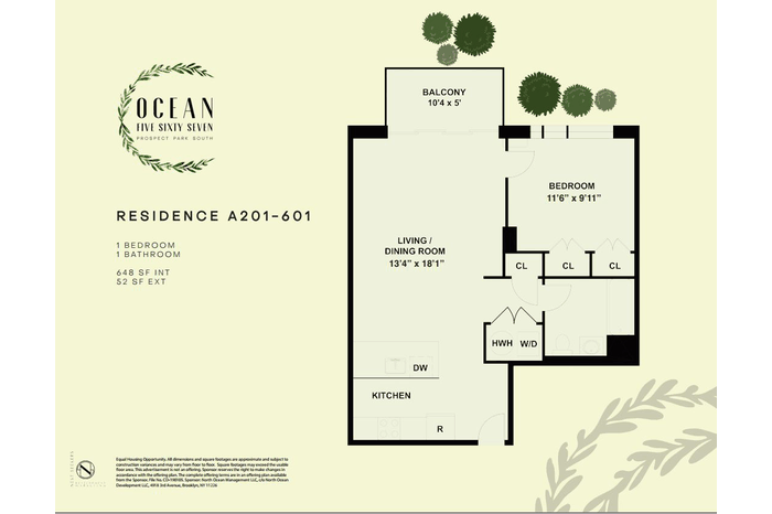 Graced with a prime Prospect Park South location and an abundance of natural light, this pristine 1-bedroom, 1-bathroom home is an exemplar of contemporary Brooklyn living. Features of this 648 sq. ft. apartment include beautiful wide plank white oak floors, floor-to-ceiling triple-pane windows, a Smart-Lock door, built-in USB outlets, multi-zone energy-saving heating and cooling, plenty of closet space, a private balcony, and a washer/dryer hook-up.