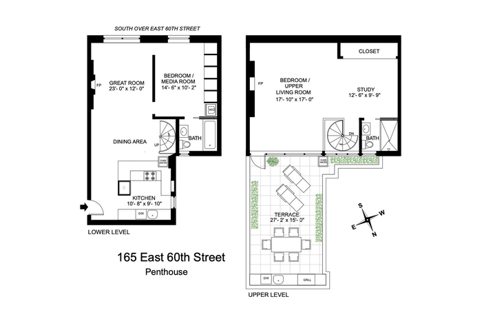 This pied-a-terre friendly mint apartment is a one-of-a-kind, beautifully designed and modern duplex Penthouse with an expansive private landscaped terrace and extraordinary natural south sunlight. The captivating Great Room with a wood-burning fireplace, 13’ ceilings and a wall of sun-drenched beautiful windows gives this elegant home a bright and airy feel. The kitchen is state-of-the-art with Corian counters, Sub-Zero refrigerator, Viking range and a built-in Miele espresso machine. There is even a hidden dumb waiter for added convenience when entertaining on the upstairs terrace. The 2nd bedroom/media room/library with wall of storage and meticulous windowed bath complete the first floor. A chic architectural staircase leads to the second floor, which is designed as a large open loft/ master suite with a 10 ft. ceiling, second full windowed bath, wood burning fireplace, two skylights and an enormous wall of glass that folds completely open to transform the second floor and terrace into one seamless space. The planted terrace has a stone floor and an outdoor kitchen with sink. This rare modern duplex penthouse is complete with central air-conditioning, radiant heated floors, laundry with vented dryer, custom lighting and abundant storage space.