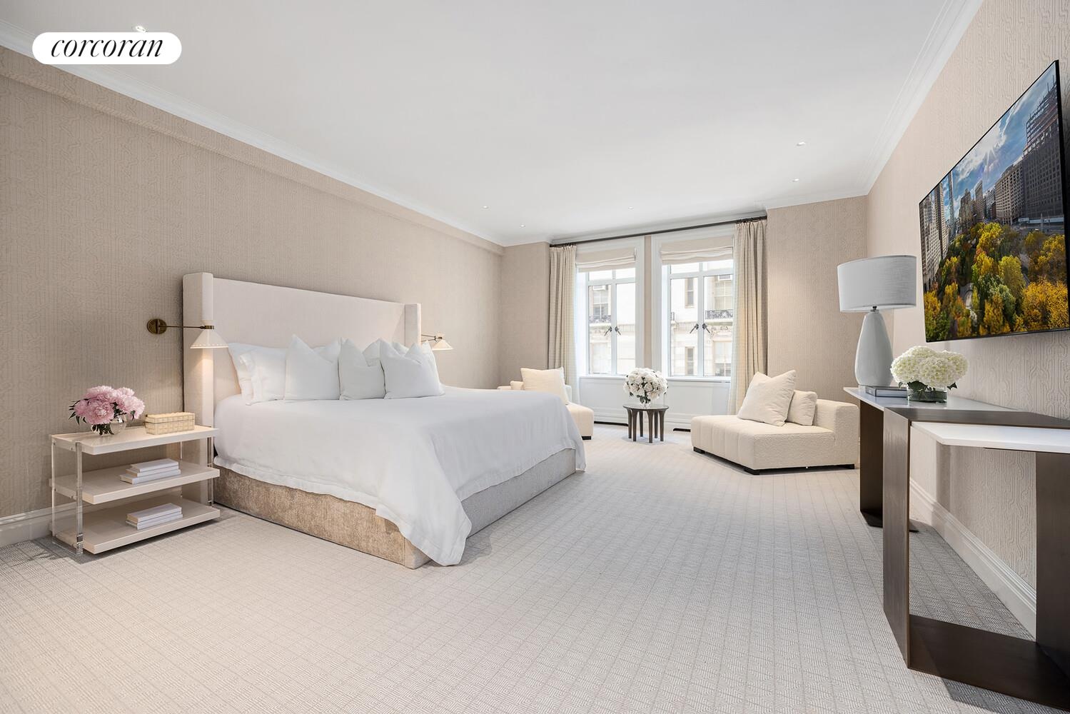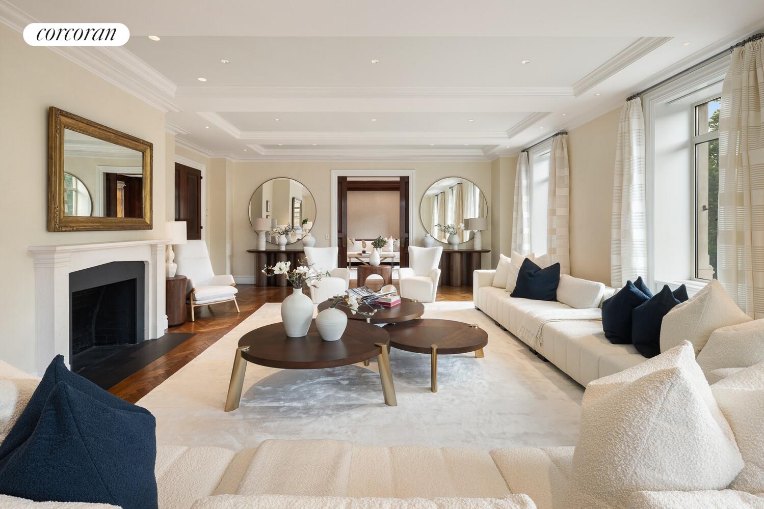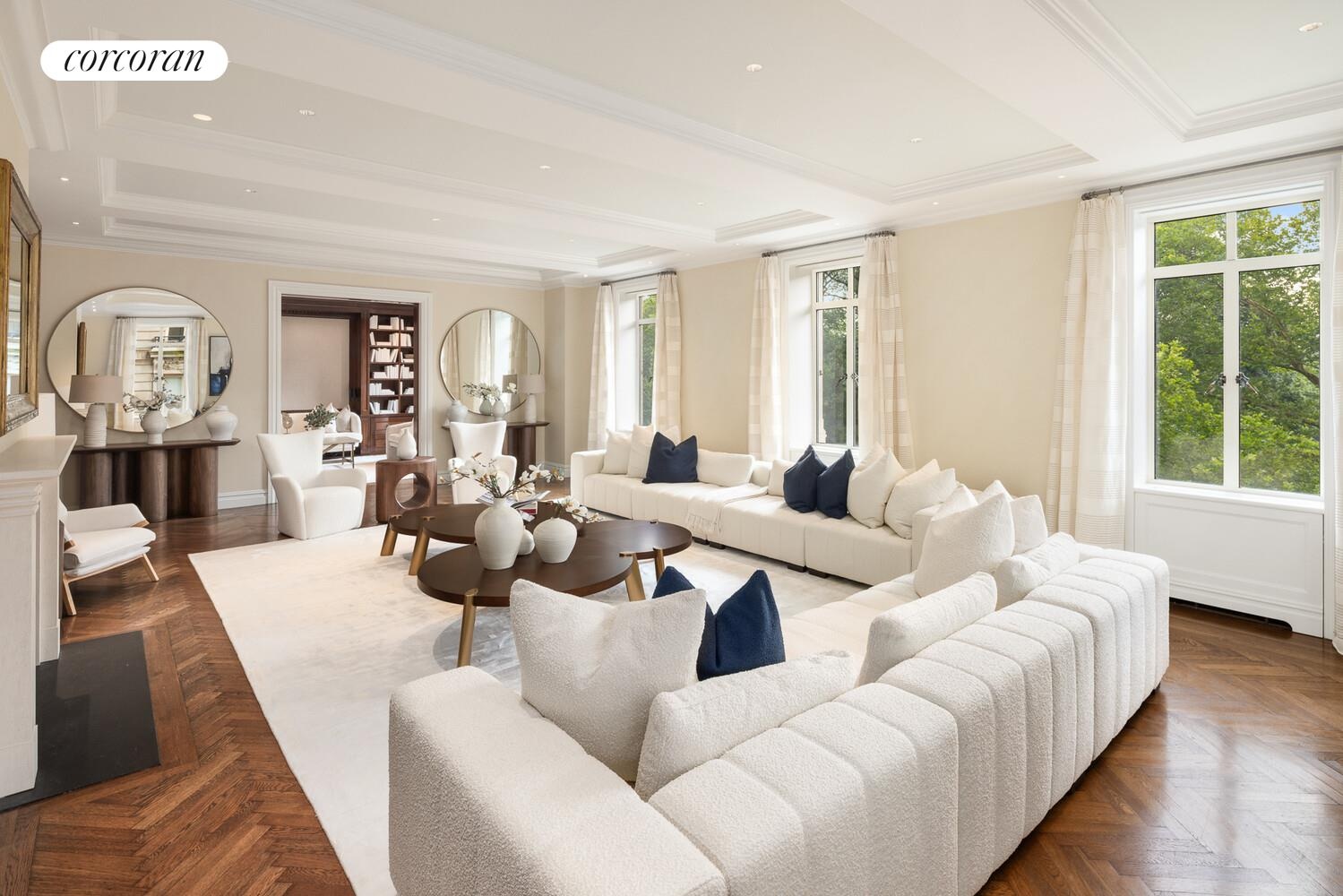 Off a private elevator landing, one enters into the entrance foyer as well as a 20'10" long gallery, from which beautiful Central Park views are framed through oversized casement windows. The regal formal dining room is 22'5" long and has a set of French Doors leading to a Juliette balcony overlooking Central Park, providing the ideal vantage point for the Thanksgiving Day Parade. Adjacent is the handsome library which is finished in mahogany, and has pocket doors to the living room. In the corner is the palatial living room with dimensions measuring 30'8" long by 20'2" wide; it has both eastern views towards Central Park and southern views of the iconic Manhattan skyline. This room is luxury defined.