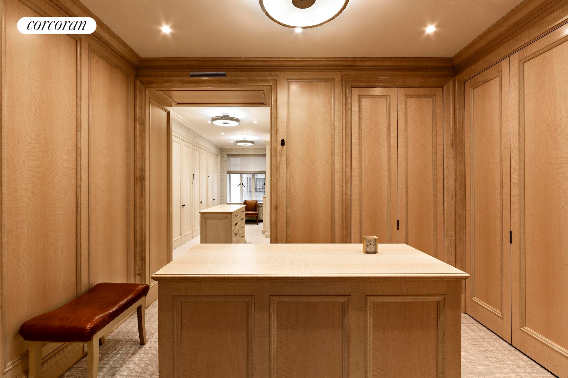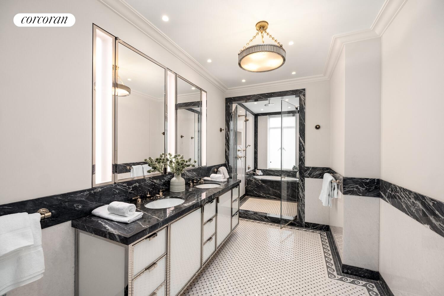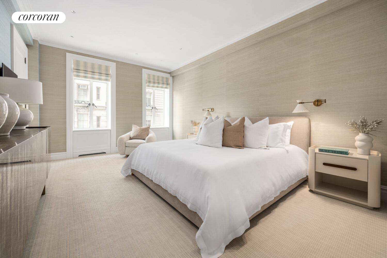 The bedrooms begin with a luxurious primary suite that faces south onto 74th Street. It has two custom dressing rooms; one of which was the fourth bedroom that has been made into an incredible windowed dressing room with a center island and walls of custom hanging and built-in storage, as well as a separate walk-in closet. The lavish en-suite windowed primary bathroom is clad in marble and has Bendheim glass and polished nickel details and is outfitted with two sinks, a wet room with an oversized shower area and a deep soaking bathtub as well as a separate water closet. There are two additional bedroom suites both with en-suite renovated bathrooms and large closets. The building allows up to 50% financing and there is a 3.5% flip tax paid by the purchaser.