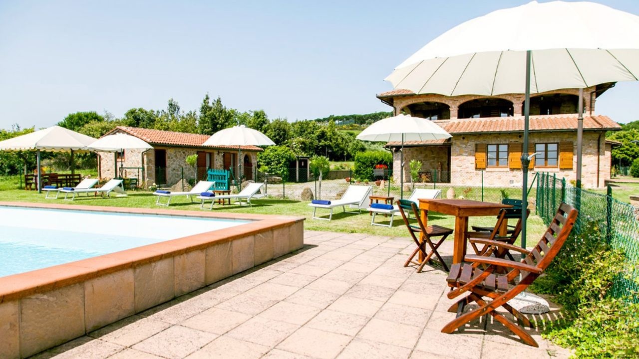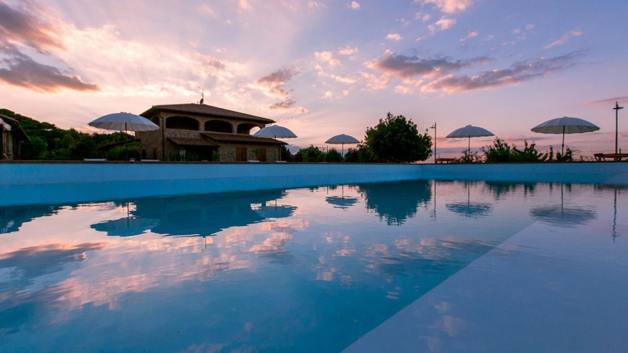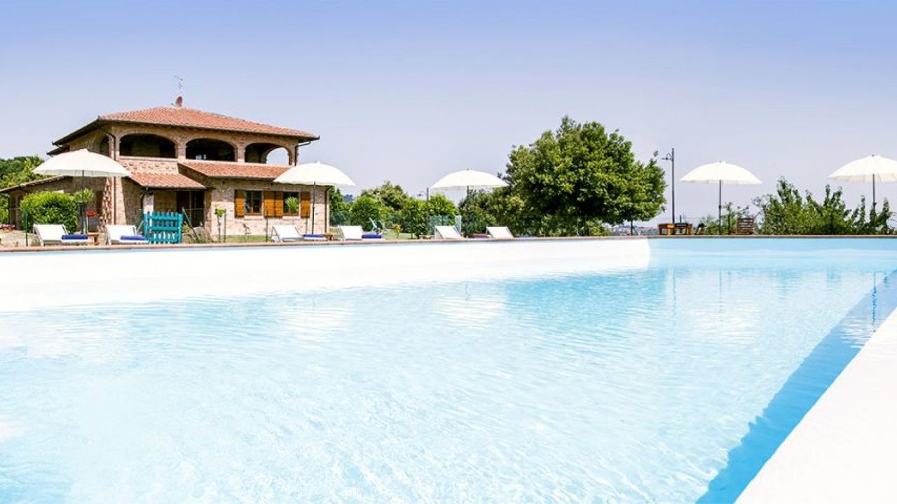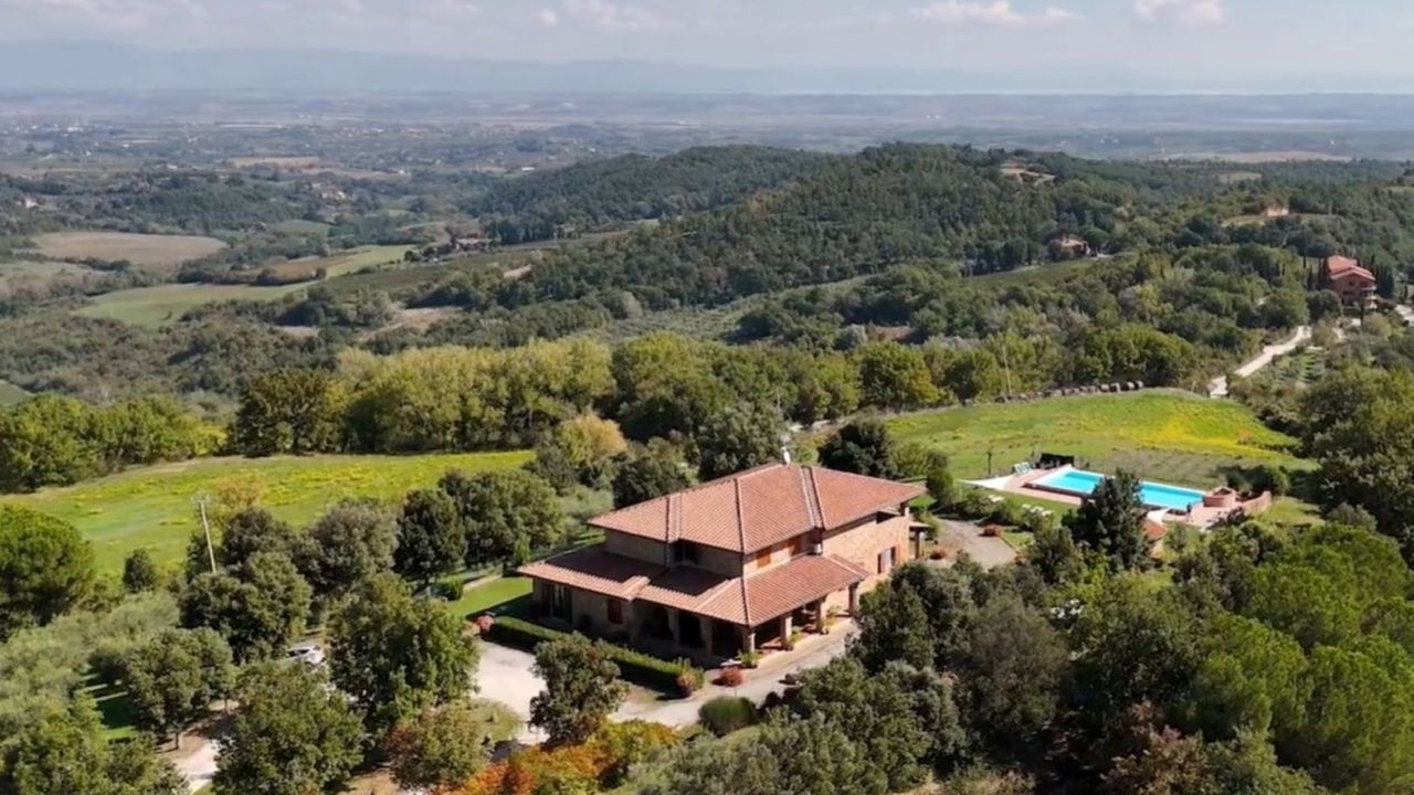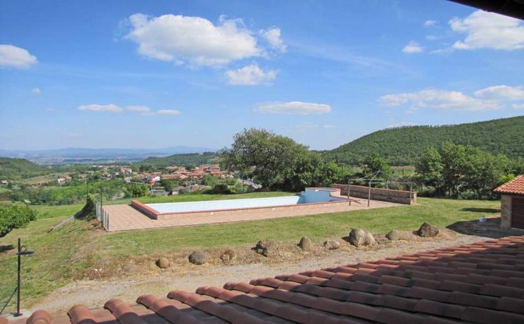 For sale in Montepulciano restored land house with large panoramic terraces, gardens and olive grove. Swimming pool and beautiful views.