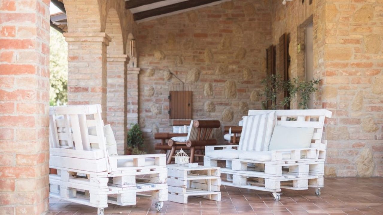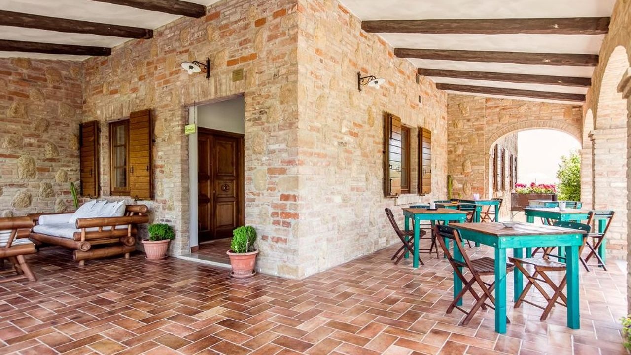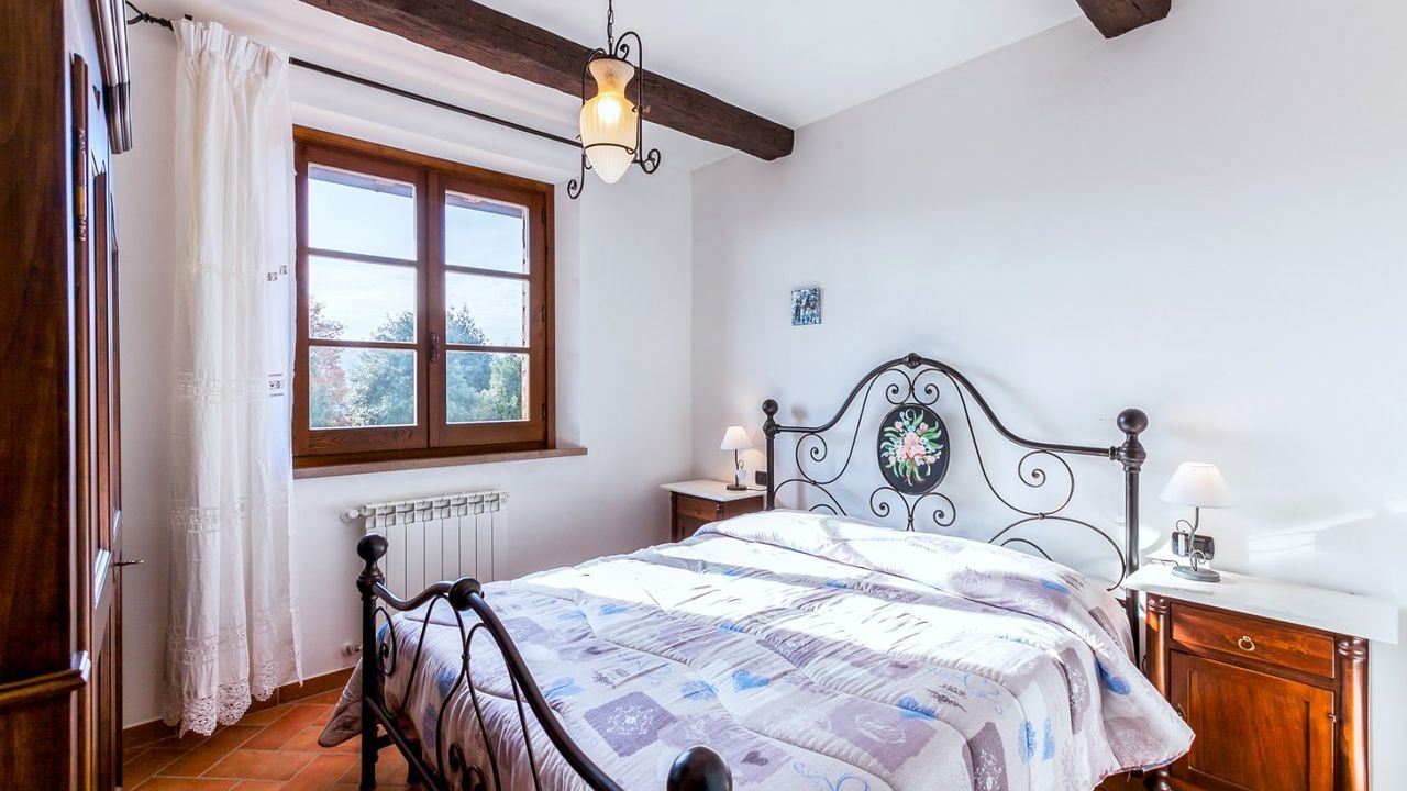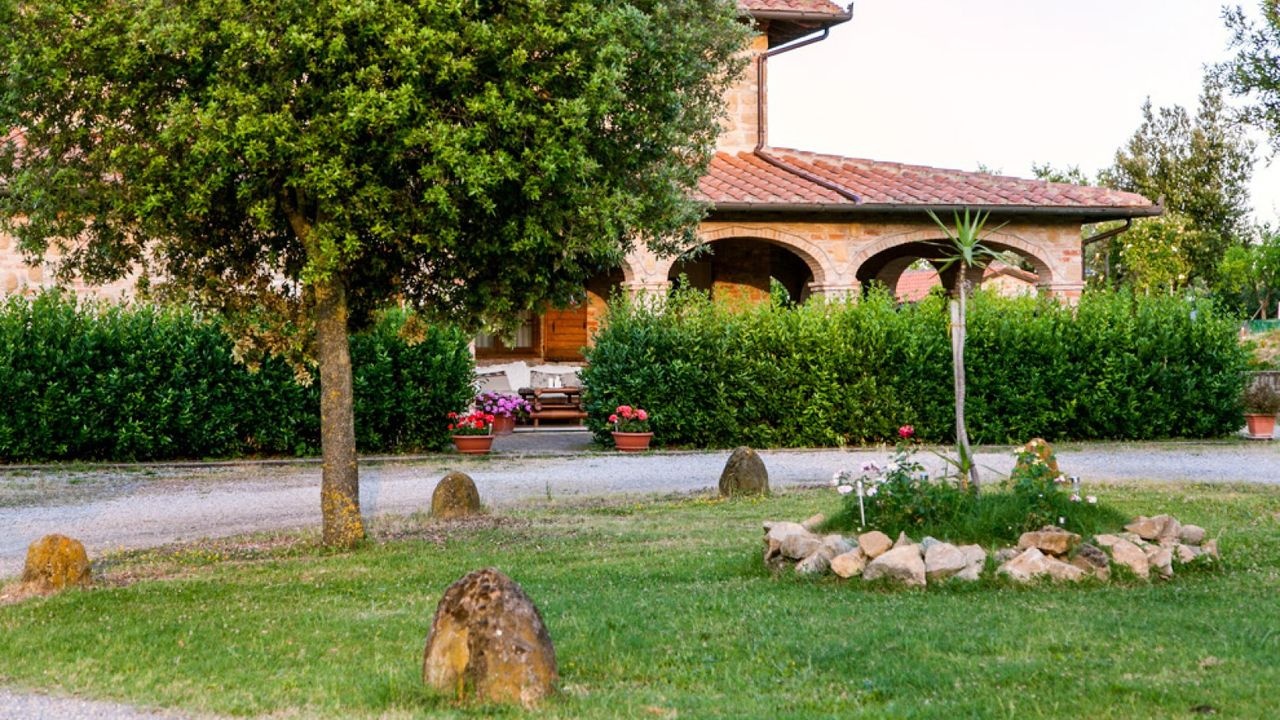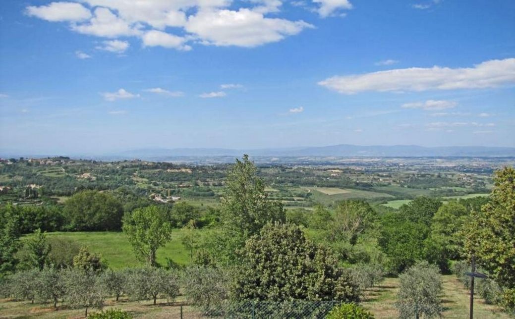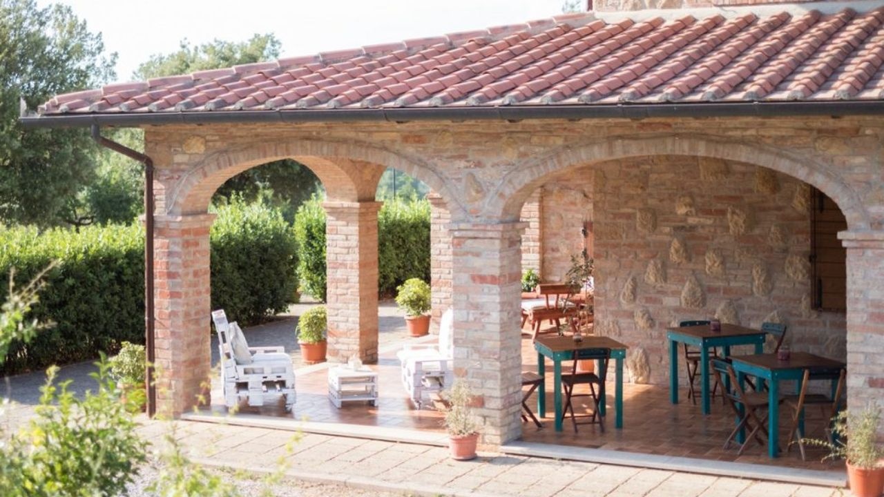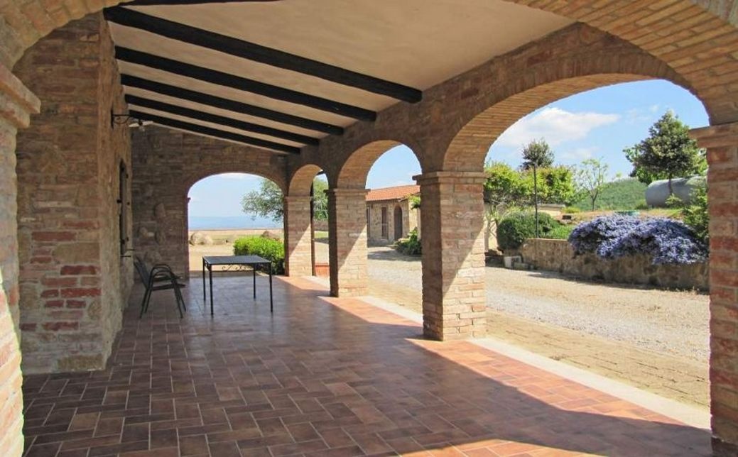 Montepulciano: Immersed in the countryside surrounding the town of Montepulciano, for sale a large stone and brick country house, with exposed arches and a large terrace with a splendid panoramic view over the entire Val di Chiana. All surrounded by a large private garden with flowers and plants.