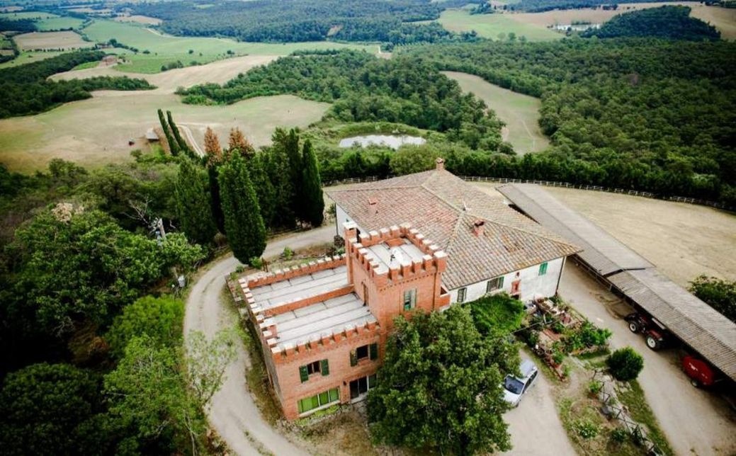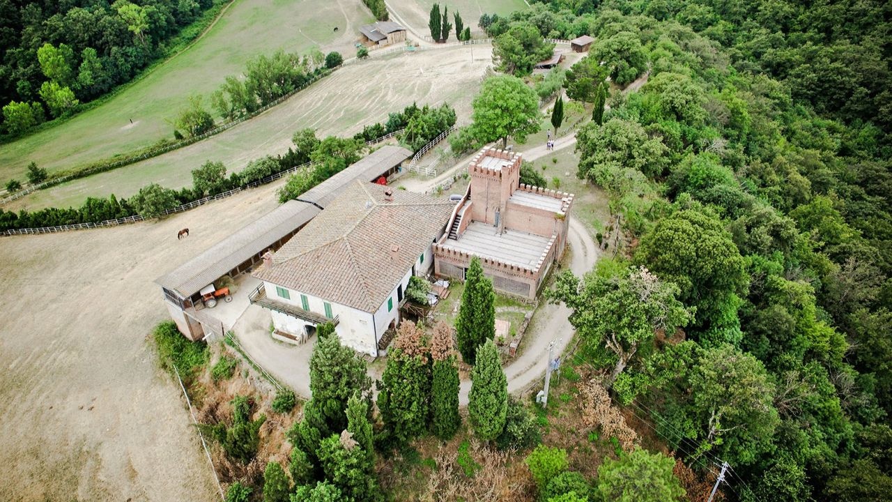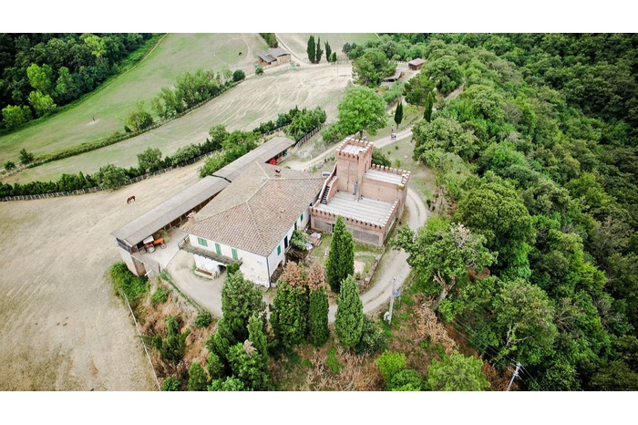 Farm with castle, hunting reserve and 105 ha of land with olive grove, arable land and woodland for sale in the province of Siena, Tuscany.