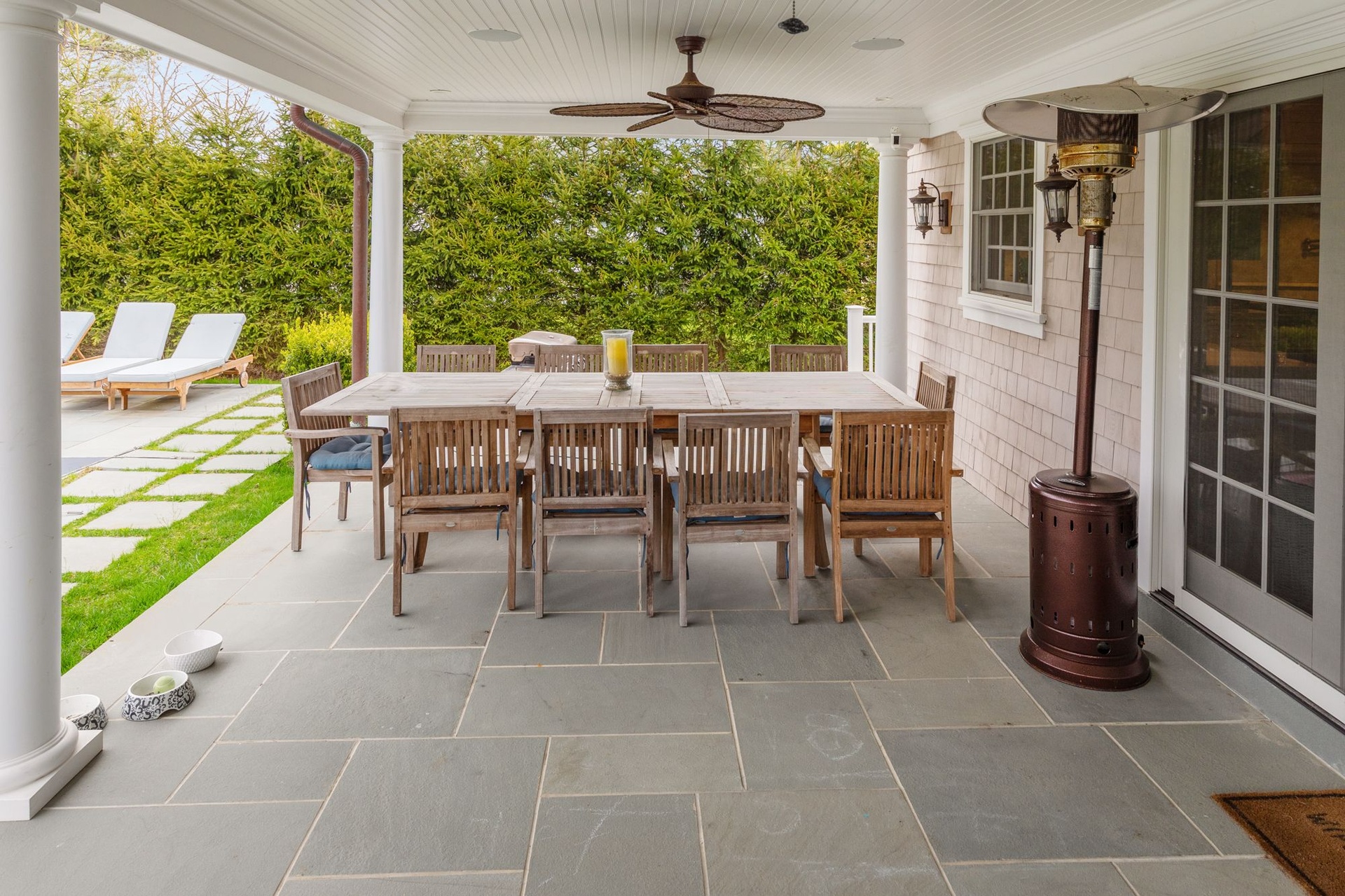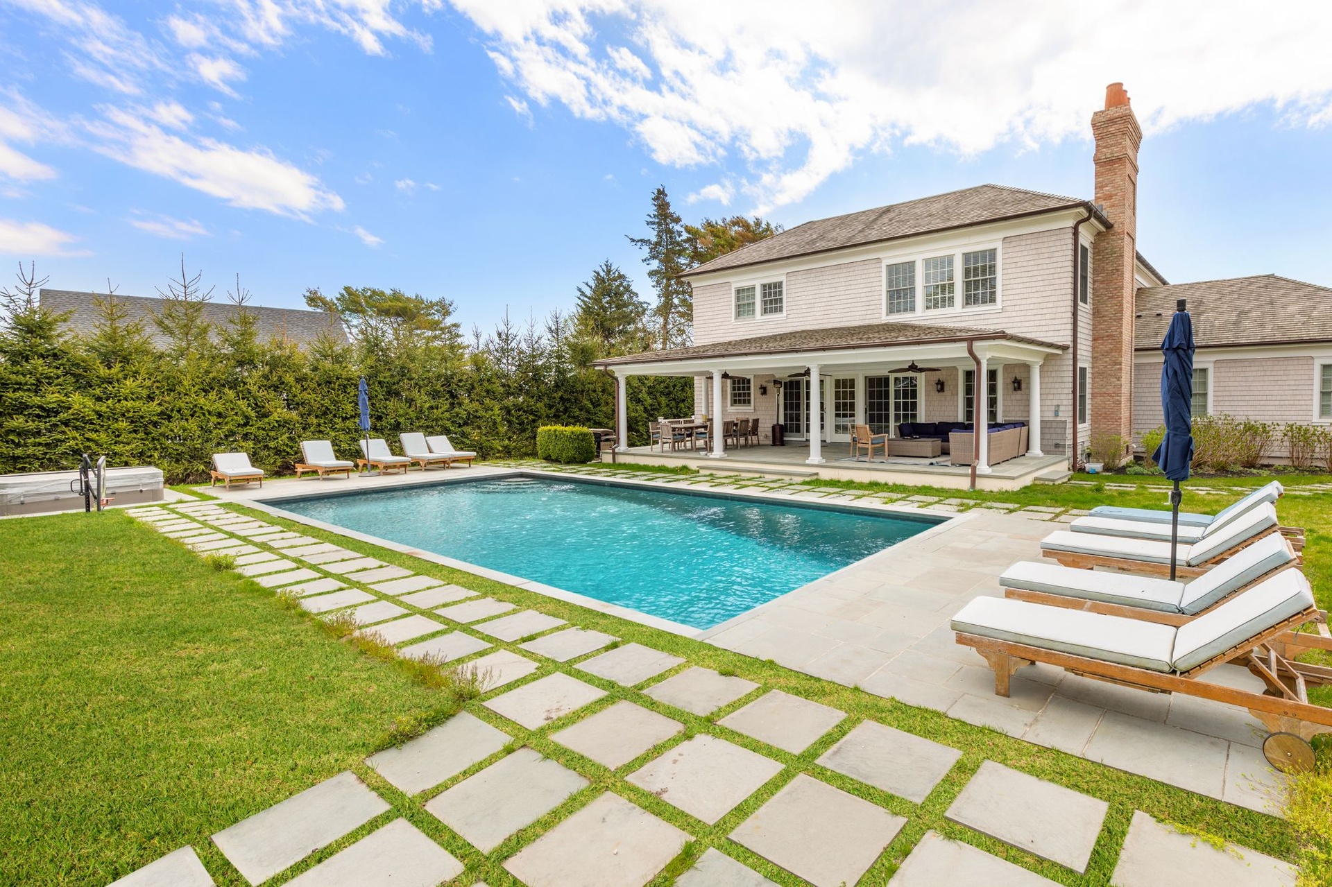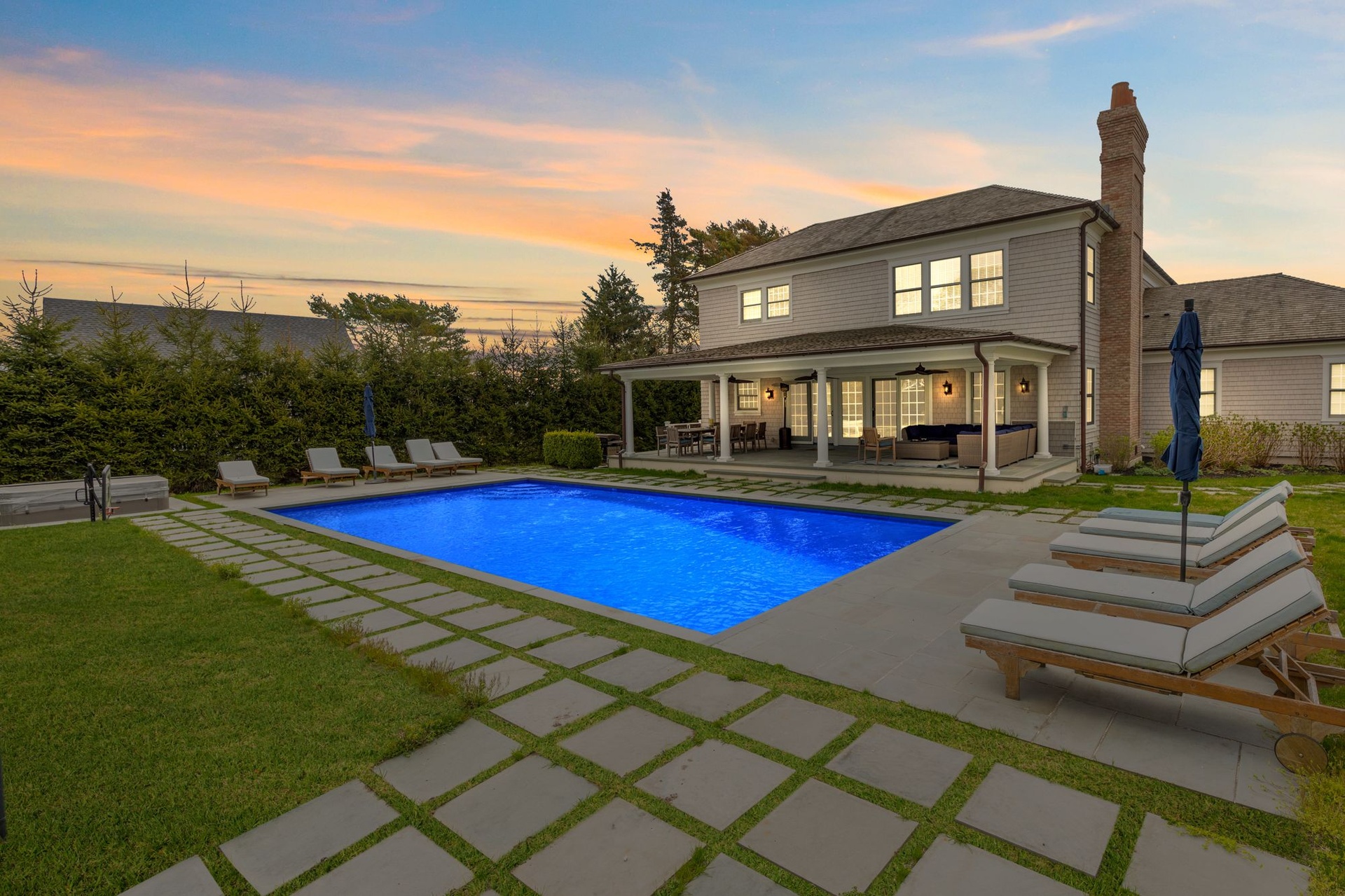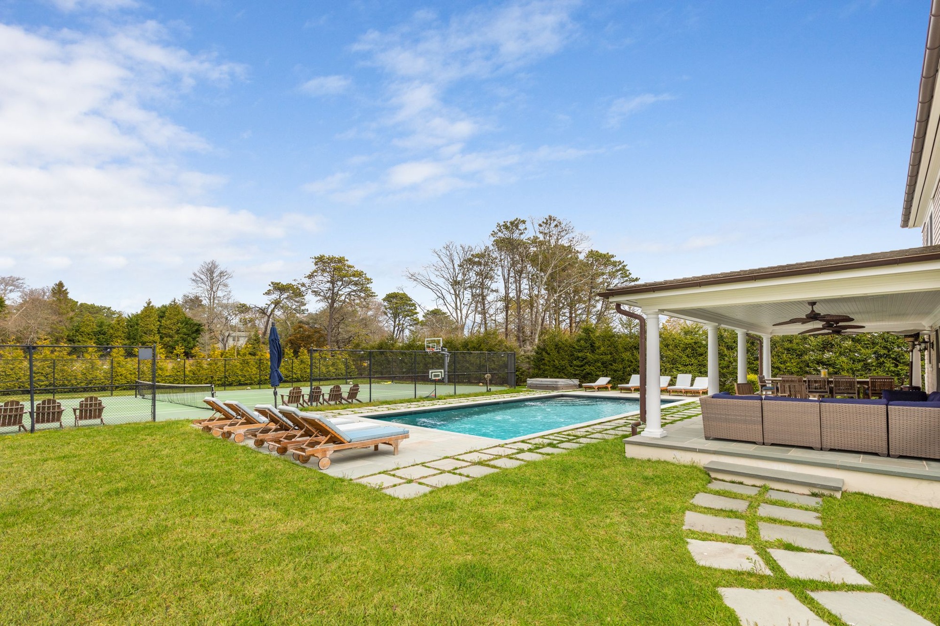 This spectacular 6,000 sqft shingle-style home is nestled on a stunning and extremely quiet and shy 1-acre site protected between tall trees and specimen plants and just minutes from Main Street and world-renowned Coopers Beach. This superb Hamptons summer getaway and property, perfectly sited on a corner lot, provide you with all of today's sophisticated and elegant features while keeping the elegance of expansive Hamptons living. Exquisitely built with an exquisite interior including never-ending hardwood flooring and fantastic ceiling heights with vaulted and coffered ceilings found throughout. Overall, there are 7 ensuite bedrooms, including a separate and luxurious Primary and Jr. Each level has a primary suite with an oversized bath, providing adequate space for many people to enjoy. The first level of this outstanding property contains formal dining, a butler's pantry and wine bar, and a stone and marble-themed chef's kitchen with professional-grade stainless steel appliances. The big living room has vaulted ceilings and a stone fireplace in the middle. French doors with plenty of natural light lead to your outdoor summer playground, which opens up onto a spectacular bluestone patio with views of your sun-soaked heated gunite pool and a private full-sized tennis court surrounded by sprawling lush green lawns and specimen plantings for maximum privacy. The fully completed lower level, which includes a private cinema room, an additional living room with a stone fireplace, a wine cellar, additional guest bedrooms with luxury baths, an outdoor entry to your own private yard, and a 2-car garage, adds even more to this spectacular new construction.
