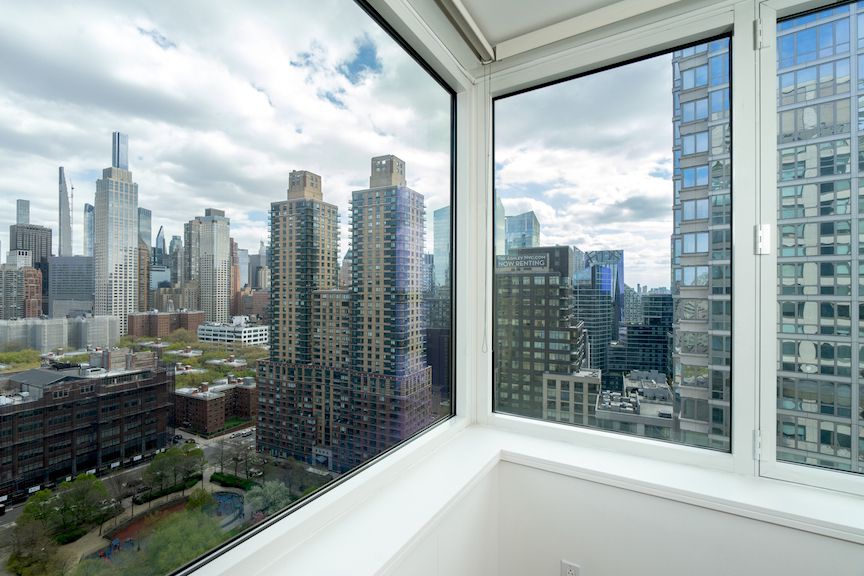 Bright and quiet 2 bedroom corner apartment with split-layout floor plan, featuring double-exposure views of the Hudson River and Manhattan skyline. With Brazilian hardwood floors throughout, the living and dining room areas are flanked by oversized wall-to-wall corner windows, offering up both impressive southern river views and sunny eastern skyline views. The windowed kitchen has a pass-through to the living room area, and has generous counter and storage space, with stone countertops, glass backsplash, and custom cabinetry. Outfitted with top-of-the-line appliances— a SubZero fridge and Miele cooktop, oven, and dishwasher. The two bedrooms are afforded great closet space, and enjoy that same spectacular eastern skyline view. The limestone bath has Waterworks fixtures, with a washer & dryer in unit and an additional storage closet in the entrance foyer.