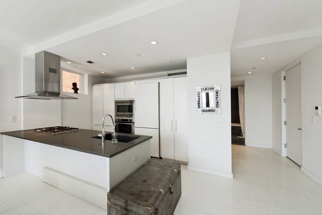 An abundance of light welcomes you upon entering this chic 1 bedroom corner loft apartment at The Allan Building in Williamsburg, Brooklyn . Approximately 880 sqft, this updated home’s triple exposures and open floor plan allows for a bright, clean, and modern feel. The spacious living room features high gloss white cabinets, hardwood floors, matching white HVAC units, and oversized floor-to-ceiling windows. The open kitchen is furnished with Caeserstone countertops, Liebherr integrated fridge as well as Bosch oven, dishwasher, microwave & washer/dryer.