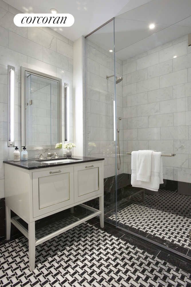 The Townhouse enjoys a private street entrance off of tree-lined 81st Street, with separate and discreet access to the lobby and amenity spaces. Marble floors adorn the formal entry foyer and gallery of the Parlor level, leading to an oversized living/formal dining room which overlooks the private garden. The adjacent Butler's pantry boasts a wine refrigerator, ice maker, sink, a Gaggenau dishwasher and a dumbwaiter connecting the pantry and kitchen one floor below. This floor also houses a guest bedroom/library with en-suite bath.