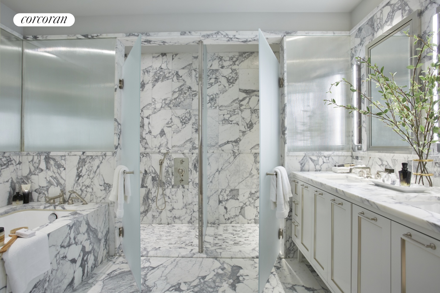 The generous master bedroom suite on the second floor faces the garden and features two large walk-in closets. The en-suite master bathroom features hand selected Arabescato Cervaiole marble, fluted mirrored glass panels, and a custom Italian vanity with Waterworks Henry collection fixtures, finished in polished nickel. The master bathroom also features a deep, 6-foot soaking tub, over-sized shower, private water closet, and radiant heated floors. Two additional bedrooms and a separate laundry room complete this level.
