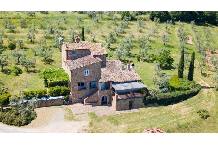 Luxury farmhouse, renovated to minimise its environmental impact, with olive grove and outbuilding for sale in the province of Arezzo, Tuscany.