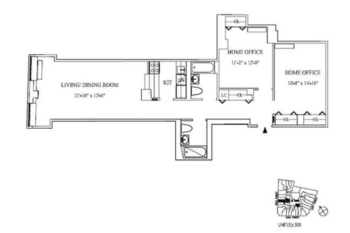 This spacious lofty Two Home Office Studio has 11 foot ceilings, with abundant square footage, and an expansive layout. These features allow for a flexible utilization of space with a large living area that can serve as both a living room and full dining room. The kitchen is adorned with Electrolux stainless steel appliances. The deep gray Caesar Stone counter tops compliment the white lacquer cabinets that feature state-of-the-art soft closed drawers. Eachone of the home offices can serve as a bedroom and features its own closet. Both bathrooms are finished with Calcutta Marble tiled floors, counter tops, and back splash, offering a chic, clean back drop. There is ample closet space half outfitted with rods and shelving so organization is never an issue. Realizing the importance of space in New York City living; the layout is used to the utmost.