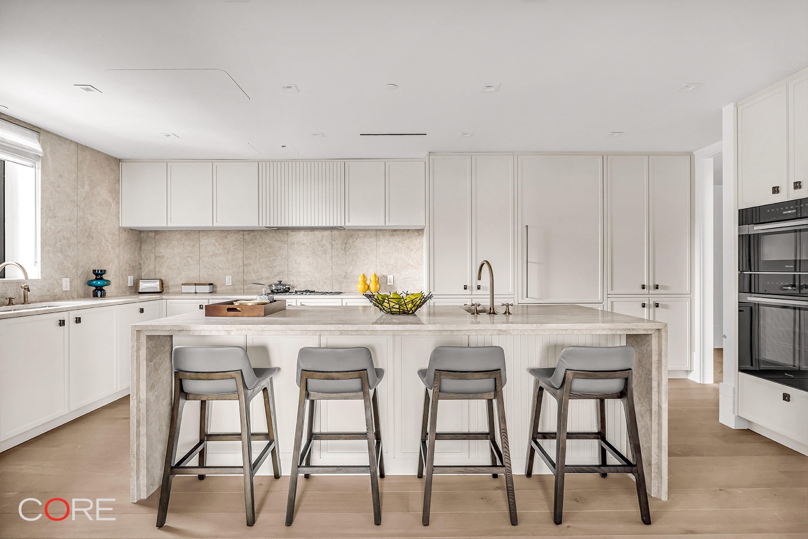 Spanning 2,650 square feet, Residence 11C at The Harper is a grand four-bedroom, four-and-a-half-bathroom home that is sure to impress with its scale and proportion. Immediately upon entering the home you are greeted by a gracious gallery and foyer lined with five-inch white oak herringbone floors. The partially closed kitchen and living room anchor the home. The extra wide living space perfectly frames the open and expansive south exposure with your own private balcony. Custom-designed by Poliform in collaboration with ODA, the kitchen boasts warm matte lacquer cabinetry adorned with antique brass hardware from WaterWorks. The Taj Mahal quartzite countertop and backsplash exude elegance, while Miele integrated appliances offer both exquisite design and top-notch performance.