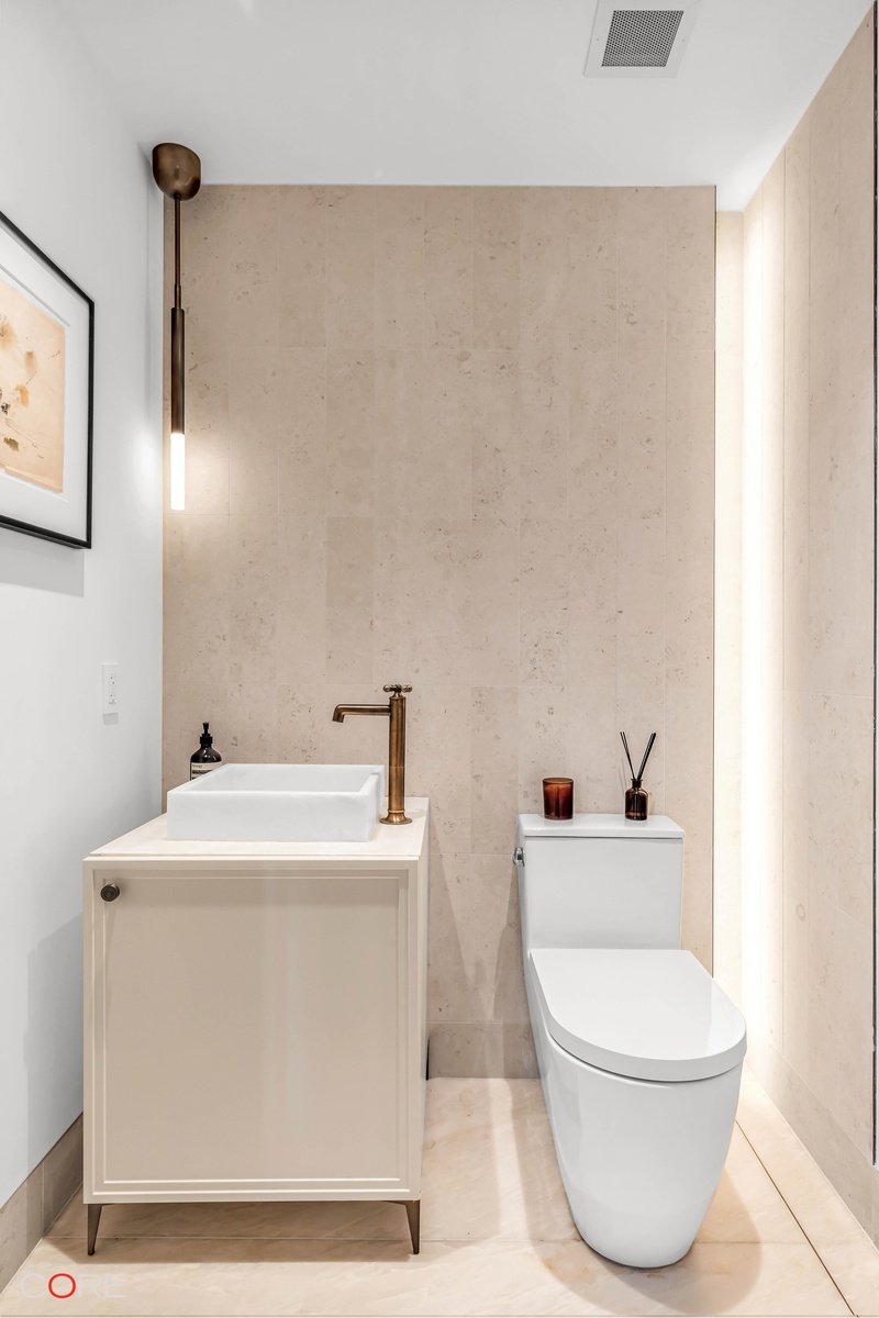 The corner primary bedroom is perfectly positioned to frame north and west city views. The en-suite bathroom is a sanctuary of refinement, enveloped in Crema Luna limestone complemented by a Namibia white marble double vanity. Radiant heated floors and high-end plumbing fittings from WaterWorks elevate the luxurious experience. Each of the secondary bedrooms is equipped with its own private en-suite bathroom. Additional features of this apartment include a separate powder room, white oak flooring, solid core wood doors with Valli & Valli hardware, a side-by-side washer and dryer, and a high-efficiency central VRF system for heating and cooling.
