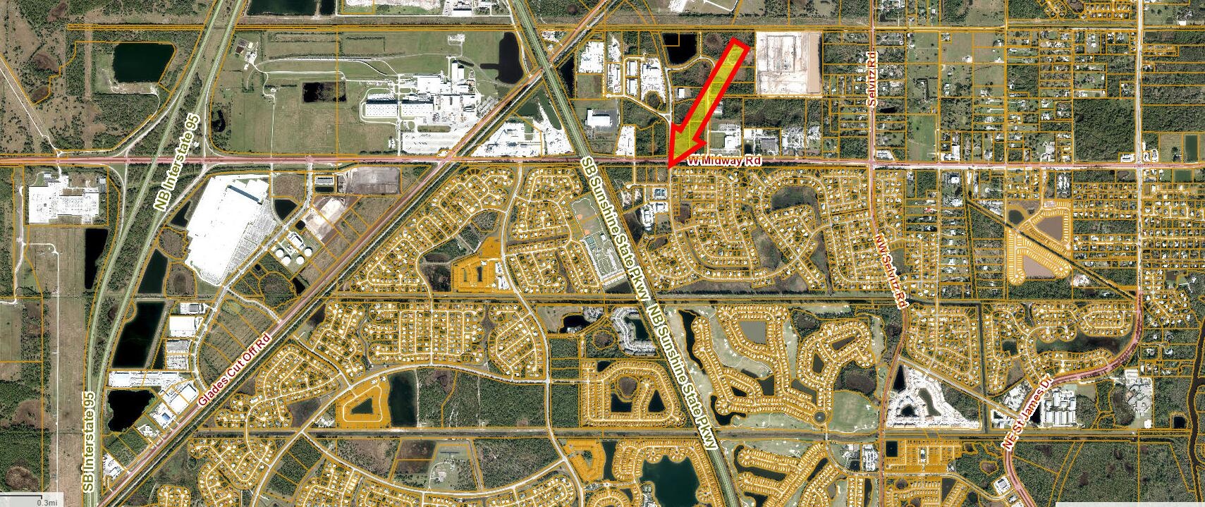 Prime Commercial Intersection Site.1.9 Acres at the Corner of Midway Rd. and Milner Drive(Jenkins Rd).**Midway Rd is becoming one of the main East/West corridors between I-95 and US #1 in St Lucie County.**Florida Turnpike has plans for a new interchange just West of this site. See DOT map in documents tabIdeal for major oil, hotel(adjacent land available up to 5 acres), and many other commercial uses. See more information under supplement tab