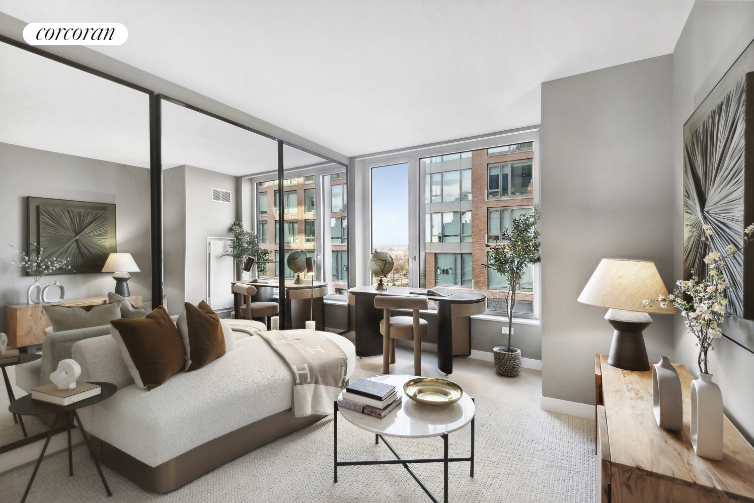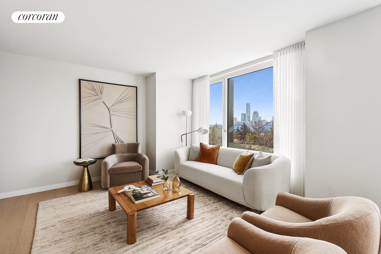 DIRECT HUDSON RIVER VIEWS set a magical tone for RESIDENCE 211, with views of the Hudson River Park treetops and stunning sunsets every day. On the building's northwest corner, the sunny layout includes a large great room, open kitchen and primary bedroom with pretty views of historic Tribeca architecture.