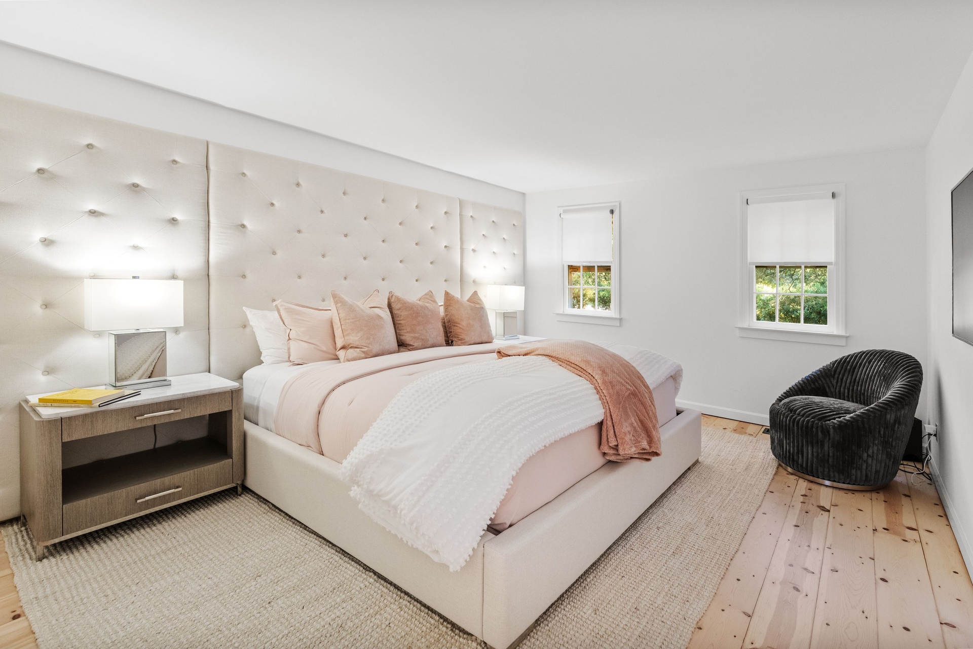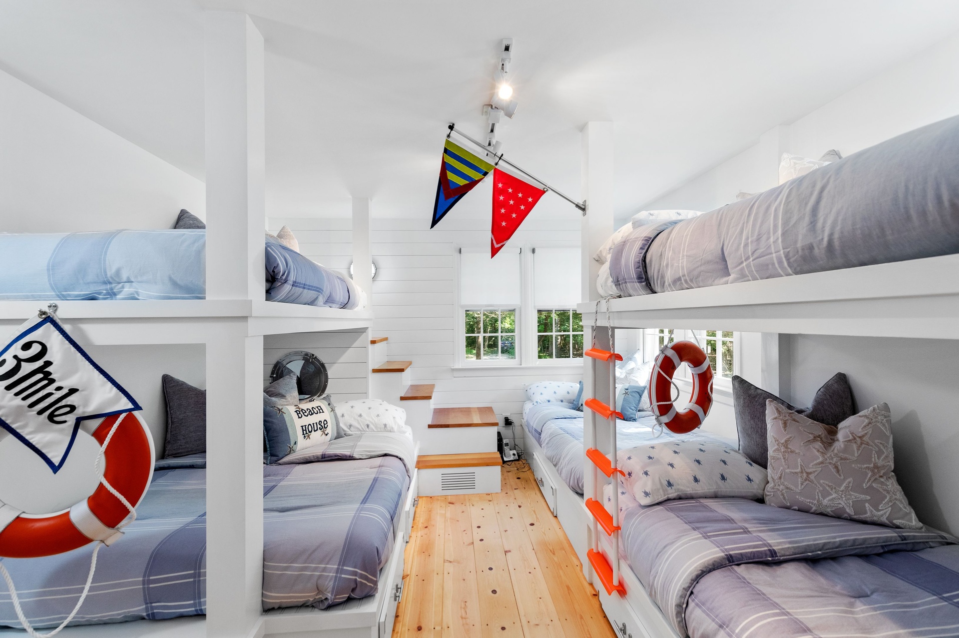 The eat-in kitchen provides a warm, inviting space for casual meals, complemented by a nearby laundry room for added convenience. The oversized ensuite primary bedroom creates a peaceful retreat. The second bedroom is generously sized and furnished with a king-size bed, while the third bedroom is ideal for children or guests, featuring two bunk beds and a full-size bed—plenty of space for the whole family.