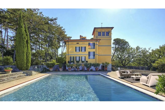 Spacious reception rooms, such as the billiard room, the antique library and the dining room, enrich the interior of the villa, while outside there are a lush flower garden, a large pine forest and hilly terrain with centuries-old olive trees.