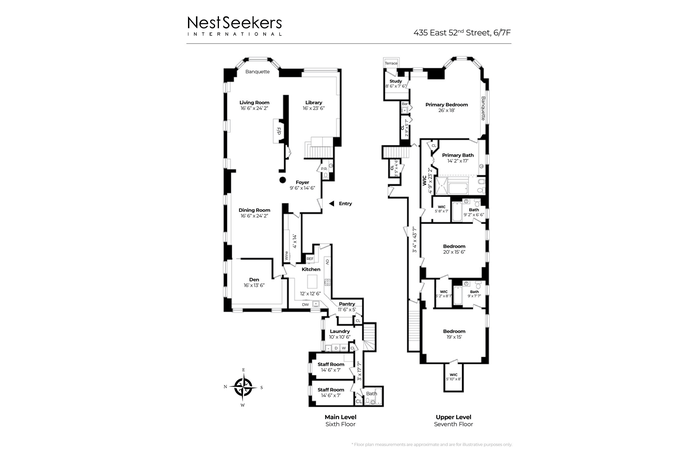 Designed by Benjamin Noriega-Ortiz, what makes duplex Residence 6/7F unique in all of legendary River House is its ethereal nature. Nearly 70 feet of unencumbered space is dedicated to main living and entertaining on the first floor, while 70+ feet of river frontage on two floors feature sweeping bridge, river and City views to the east and south. Four exposures and high ceilings throughout provide ample volume and air, which imbue the home with a certain loftiness and luminosity not usually associated with a classical Art Deco flat. The entertaining floor features a corner living room with bay window and fireplace, an expansive dining space, a gracious foyer, a library/den, an office, a guest powder room, a windowed eat-in kitchen, two graciously sized staff rooms, laundry area, and a full staff bathroom. On the second floor are three grand bedrooms–all with bathrooms en-suite–and each with large walk-in closets. The master bedroom suite encompasses the full width of the second floor. It has gorgeous direct river and City views to the east and south, an attached alcove study, a balcony, a large master bath, and bountiful closet/dressing space. The building’s elevators are accessible from both the 6th and 7th floors levels.