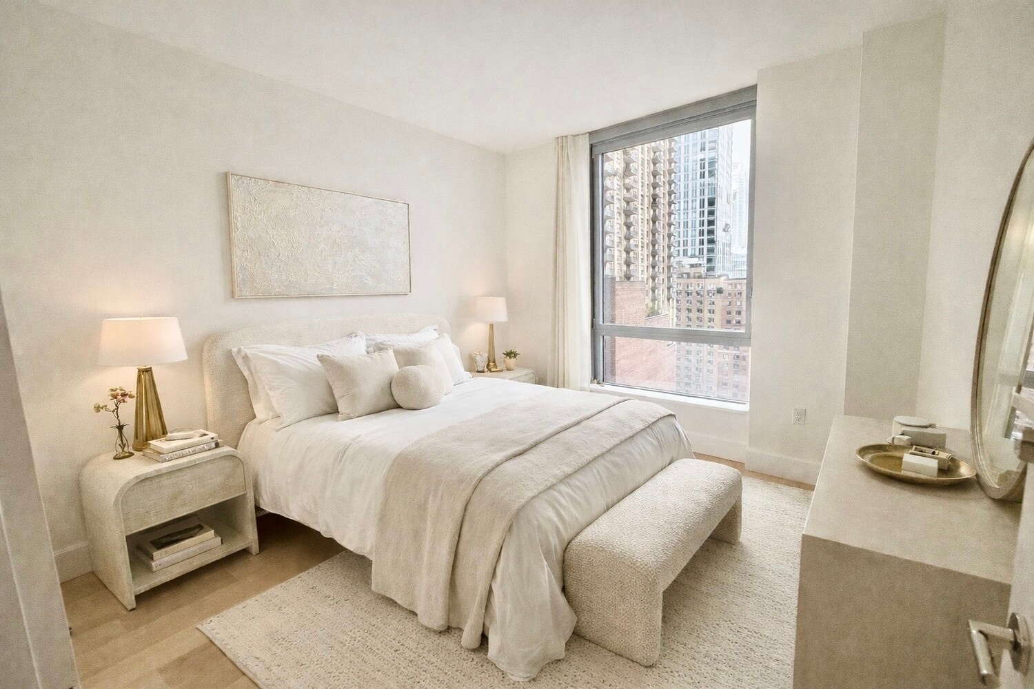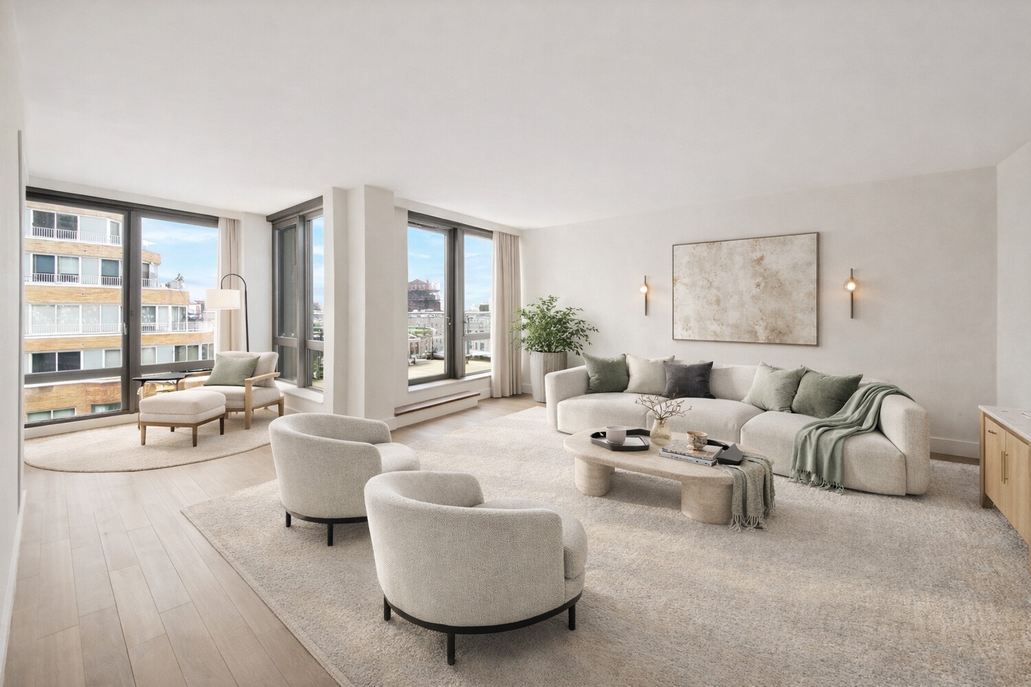 A dramatic white oak entry door opens to a gracious entry gallery with 5" plank white oak floors. Natural light bathes the entire residences from expansive windows facing south, north, and east. The living room provides ample space for entertainment and there is a separate formal dining area conveniently adjacent to the kitchen. The custom CetraRuddy-designed eat-in kitchen features white matte lacquer cabinetry, honed quartzite slab countertops and backsplash, and a full suite of integrated Miele appliances, including a wine refrigerator.