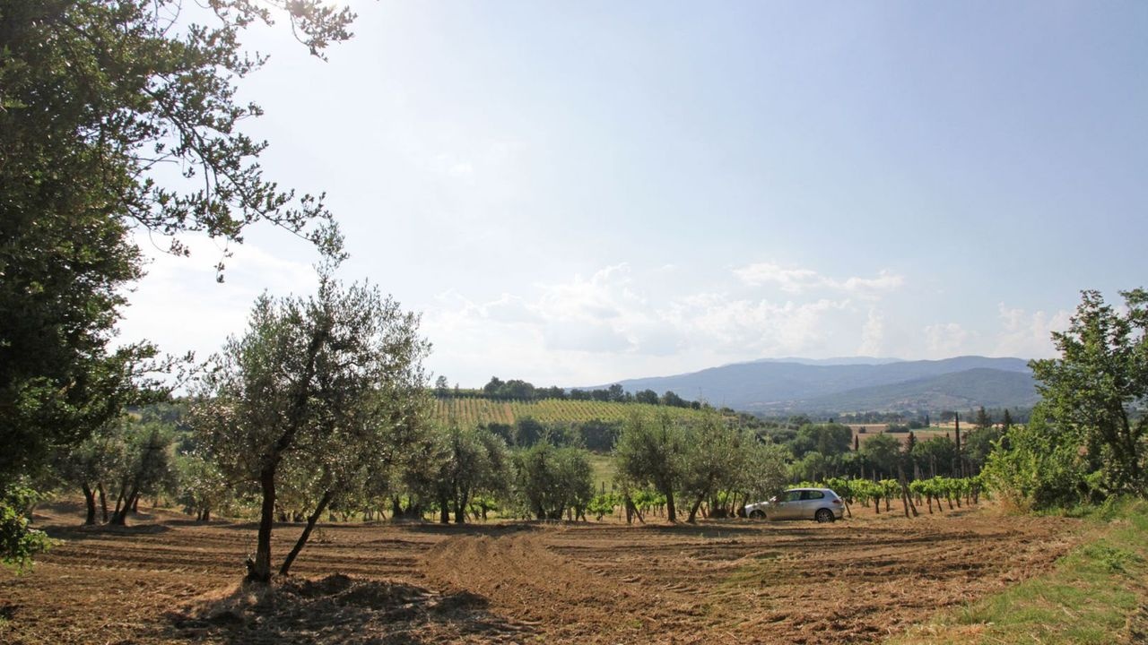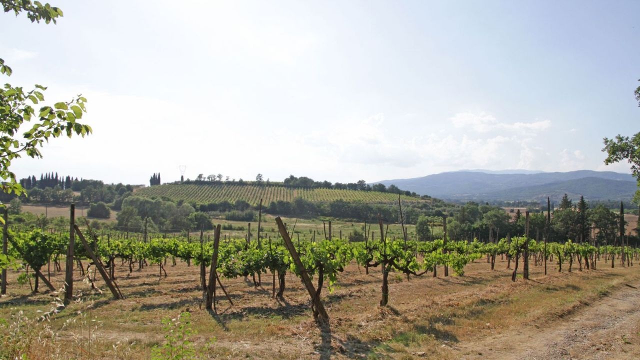 For sale near Arezzo farm with vineyard, olive grove, wood and old Leopoldino-style farmhouse with annexes. Beautiful views of the Tuscan countryside