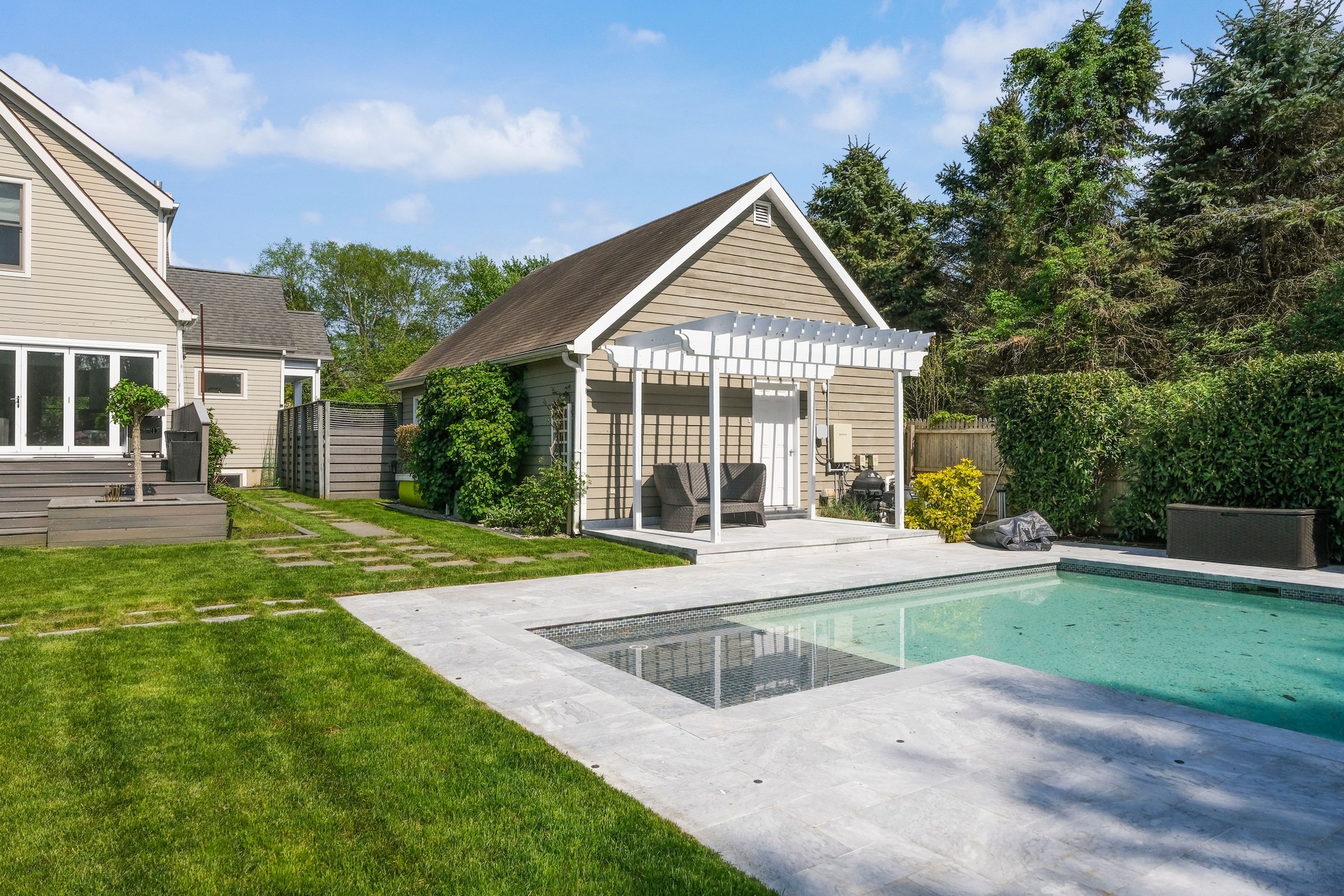 Nestled amid the tranquil countryside of Water Mill, this enchanting four-bedroom home, complete with a finished basement, presents an ideal retreat. Impeccably renovated in 2022, this sunlit abode graces a peaceful dead-end street and beckons with an open living room, where expansive wall-to-wall bifold glass doors seamlessly merge the indoors with the lush private backyard. The generously sized Trex deck awaits your entertaining aspirations. The main floor impresses with a chef's kitchen, an elegant wet bar area, an inviting dining space, an en-suite guest bedroom, a functional mudroom, and a convenient powder room. Upstairs, the primary en-suite sanctuary boasts vaulted ceilings, a walk-in closet, and a marble-clad bathroom with a tranquil soaking tub. Completing the upper level is a full laundry room and two guest bedrooms that share a well-appointed bathroom. The lower level offers a world of entertainment possibilities with its game room, media room, second laundry station, full bathroom, adaptable office/gym space, and a handy kitchenette. An additional room, graced with two ample closets, sliding glass doors, and direct backyard access, provides versatility. Bask in the sun-drenched backyard oasis, complete with a heated gunite pool featuring bubblers and LED lights, all amidst meticulously landscaped surroundings. This exceptional property is crowned by a detached two-car garage with a storage attic above.