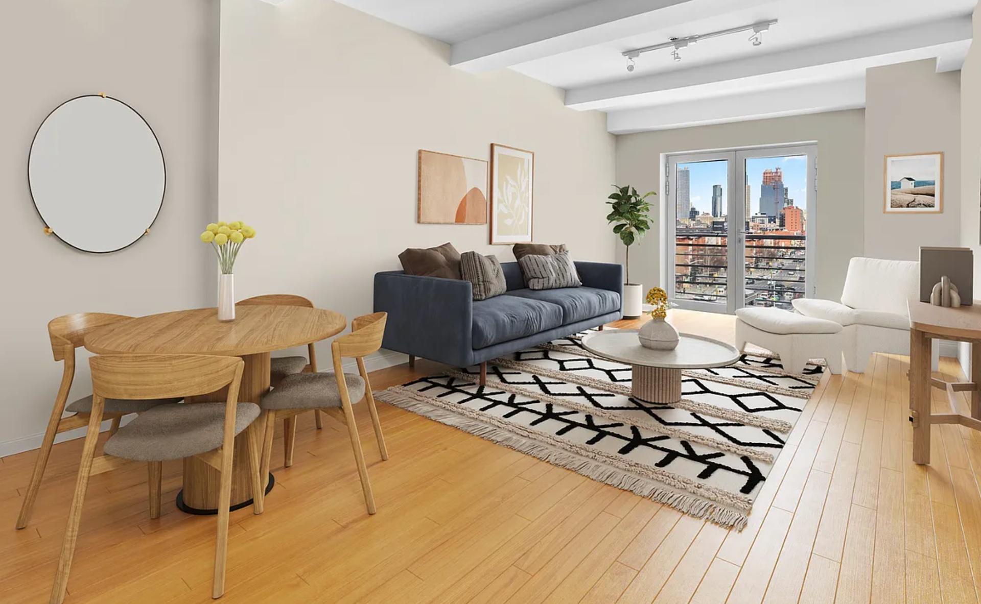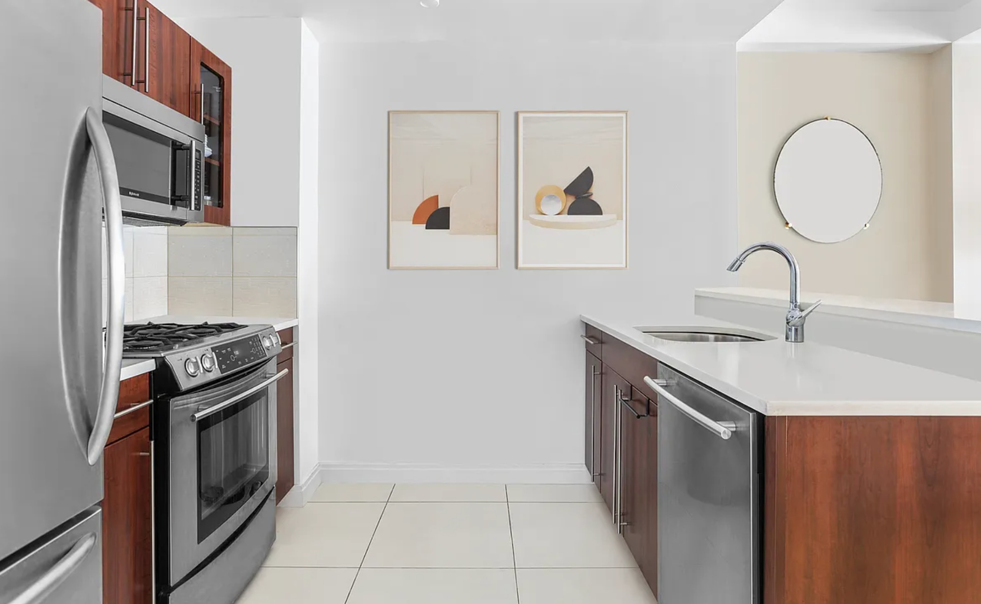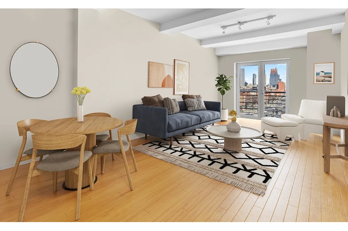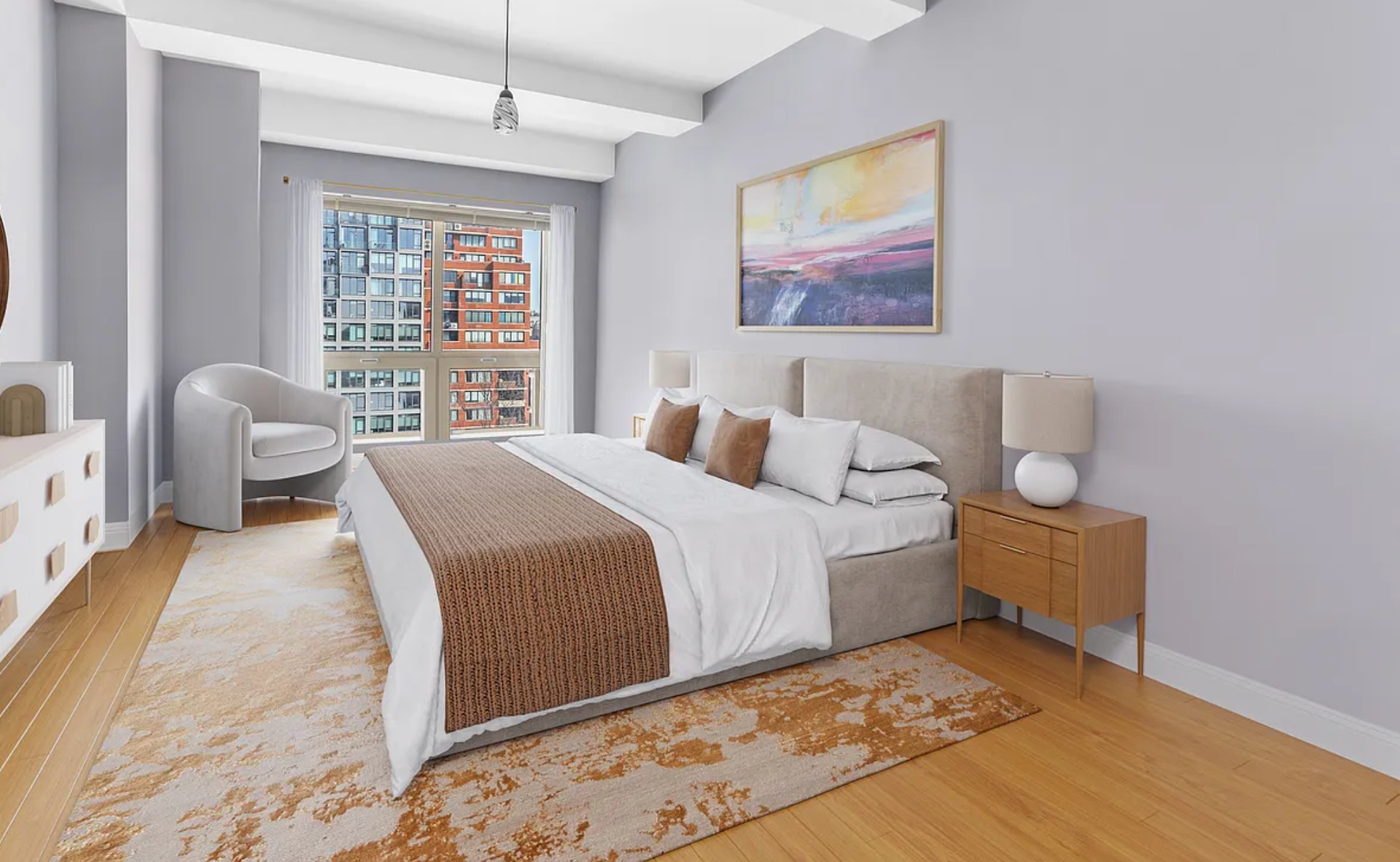 Enjoy relaxing & entertaining in the open kitchen / dining / living room that boasts french doors opening to a Juliet balcony that offers partial Manhattan & Brooklyn views . The Chef’s kitchen is outfitted with a peninsula with room for seating and is perfect for food prep. Stainless steel appliances including a dishwasher & microwave, cherry cabinets and caesarstone countertops complete the space.