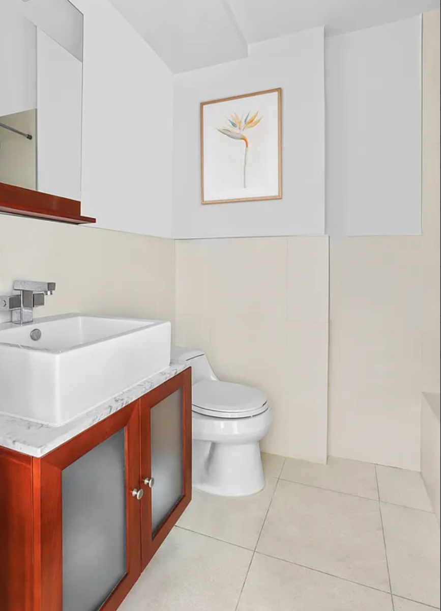 The HUGE bedroom can easily accommodate a king size bed, plus a work from home station and room to spare. In addition there are floor to ceiling windows offering great natural sunlight and an ample closet for storage. The bathroom is outfitted with limestone tiles & a deep soaking tub.