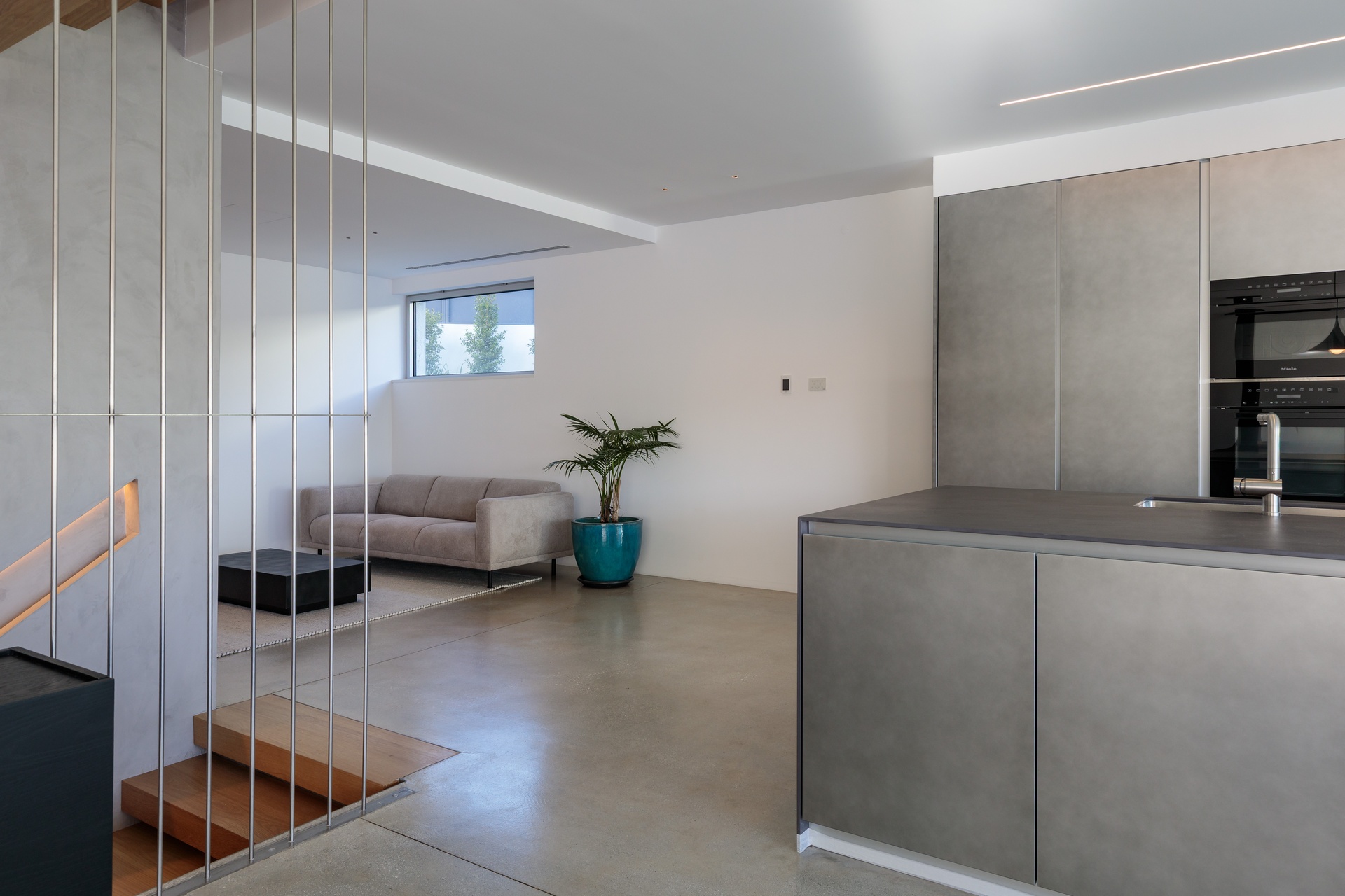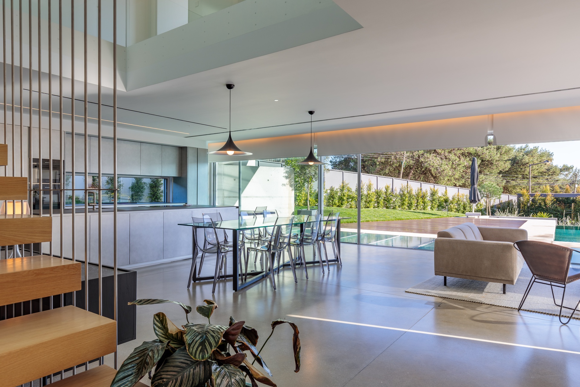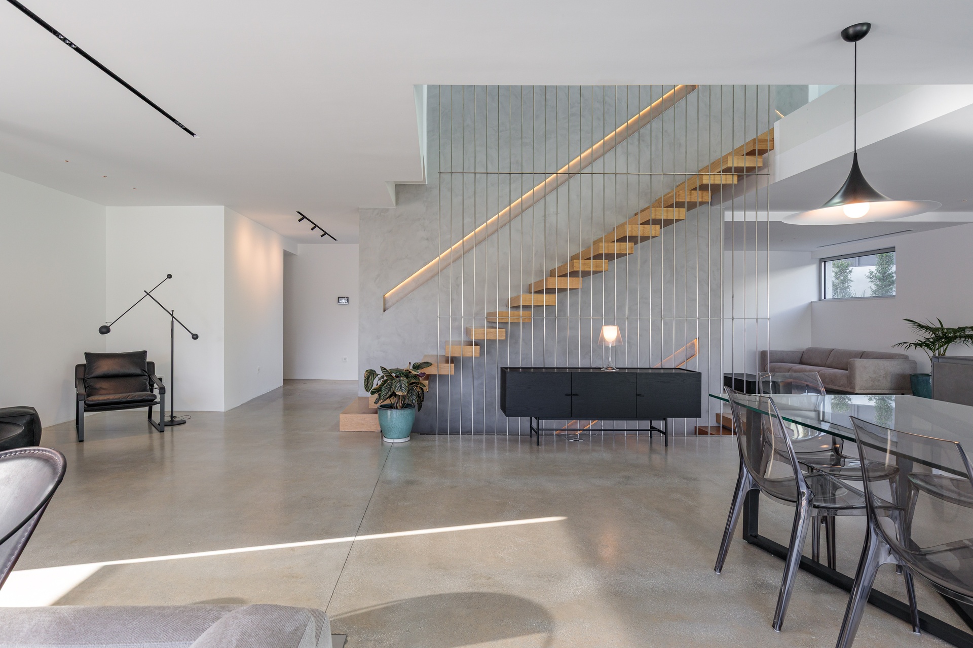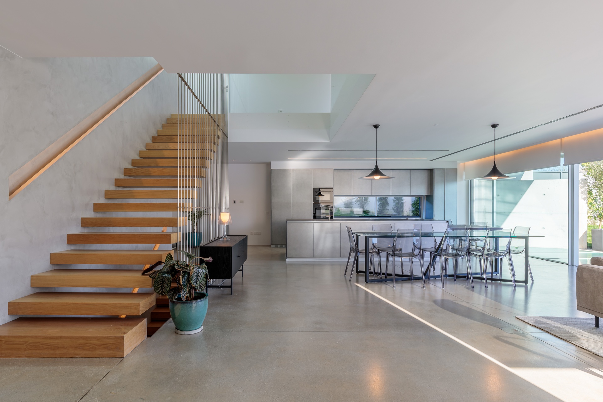The ground floor hosts an expansive open-plan area with a fully integrated kitchen equipped with high-end appliances and a versatile living space suitable for both entertainment and work, be it a TV room or an office.