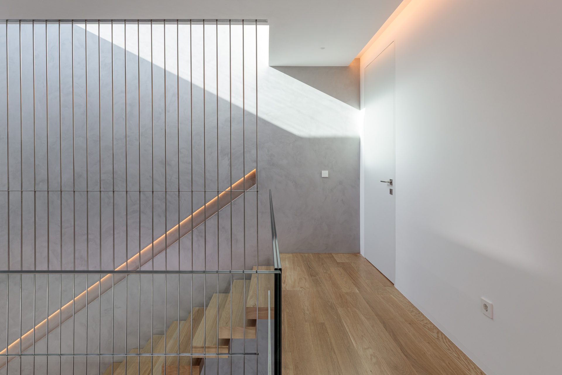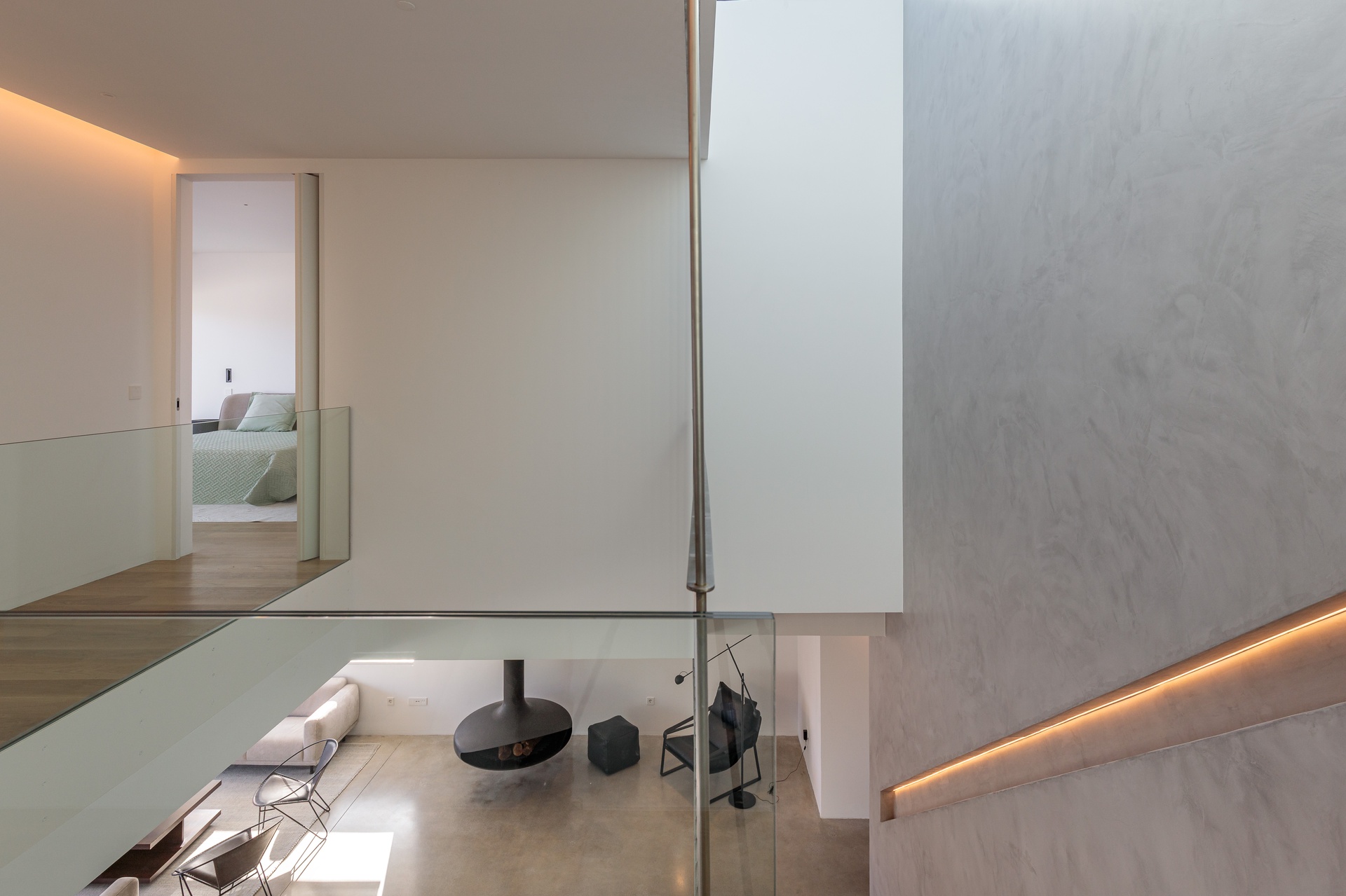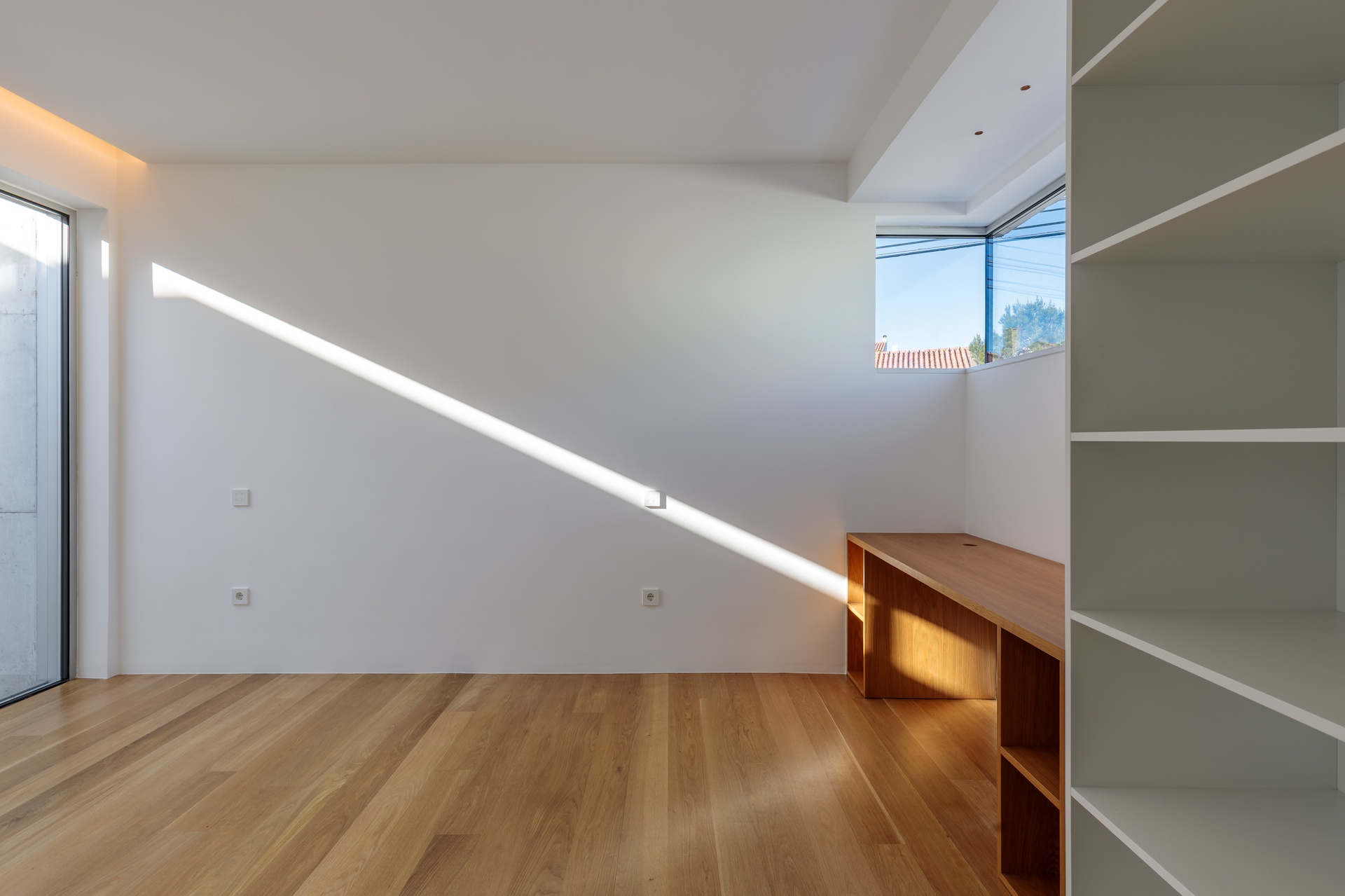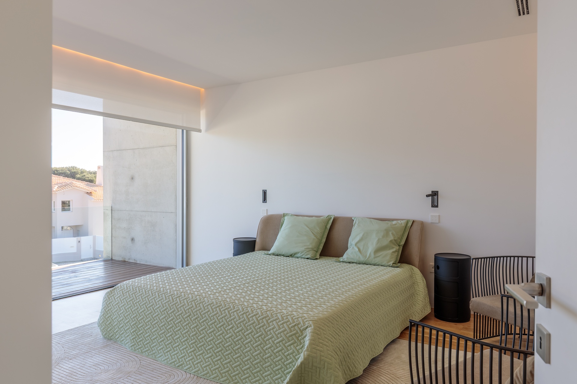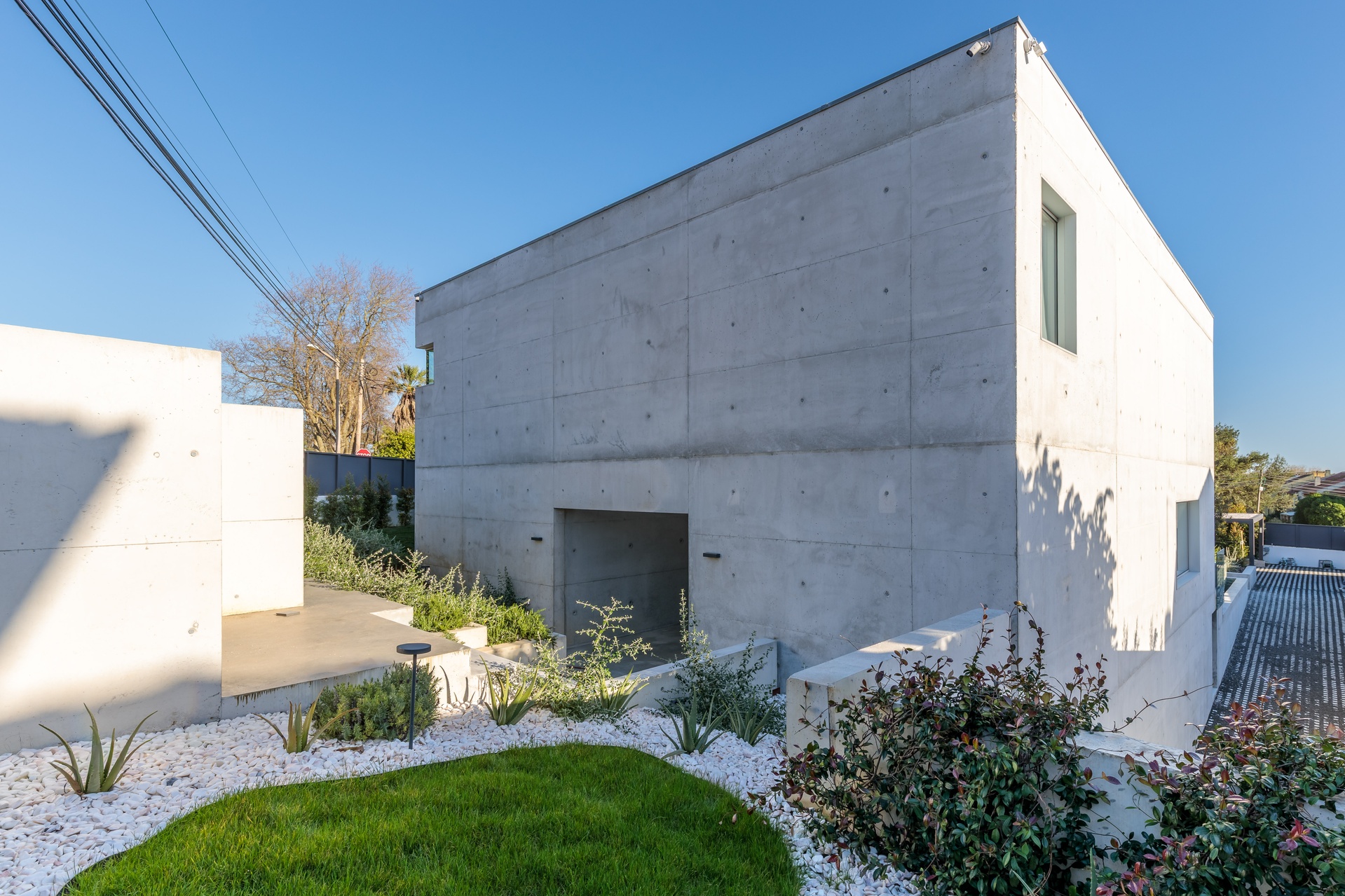 Sun exposure has been optimised to provide an abundance of natural light and privacy throughout the day. Timeless concrete plays a central role in the design, shaping both the exterior and interior spaces with its unique aesthetic. The interior exhibits a blend of white walls and wooden bedroom floors, maintaining a strong minimalist presence that aligns with the architectural design.