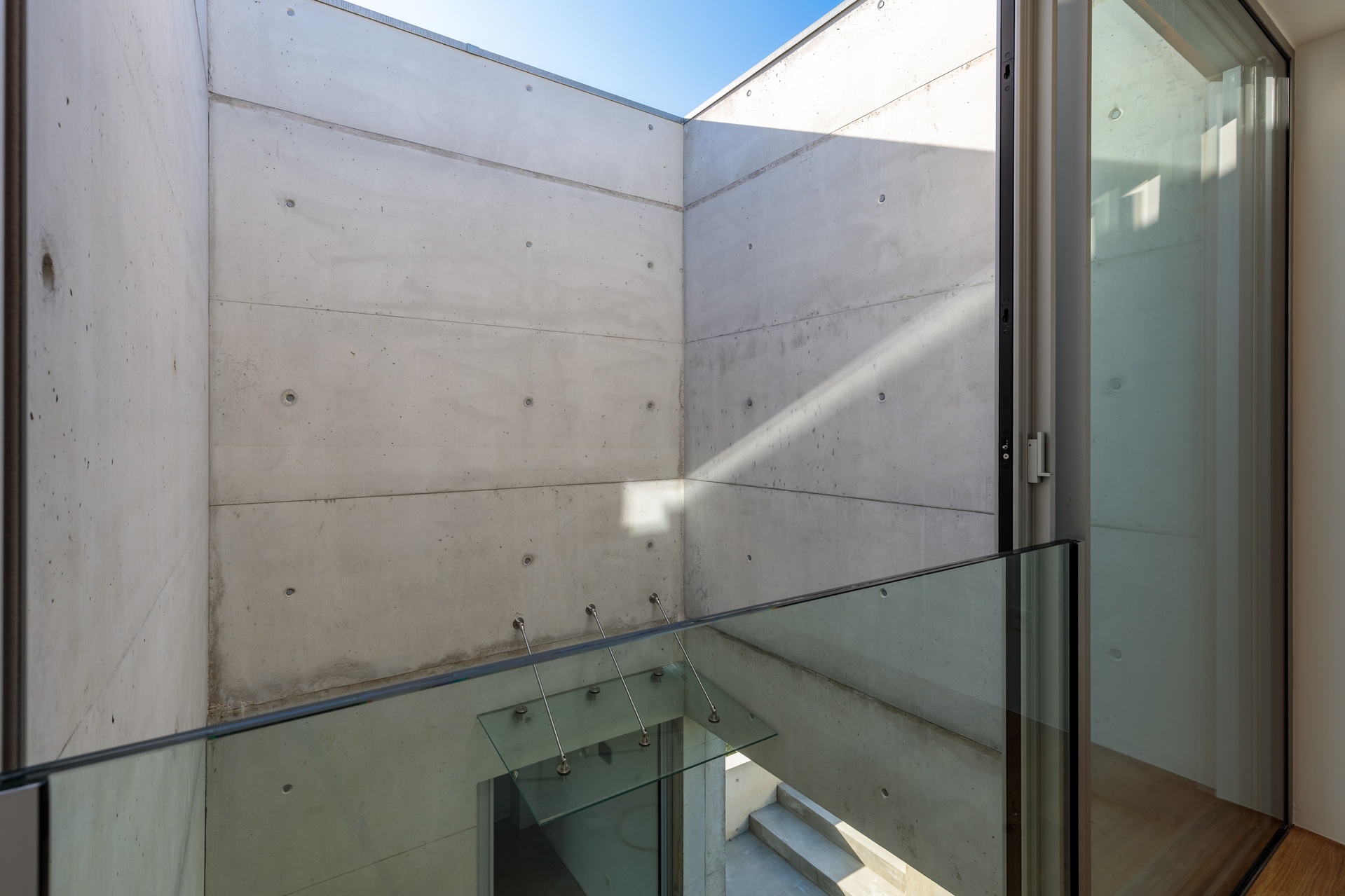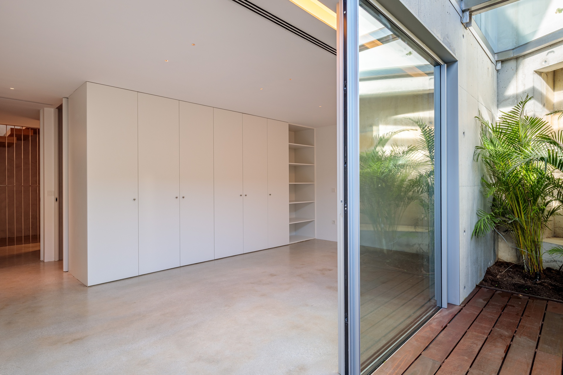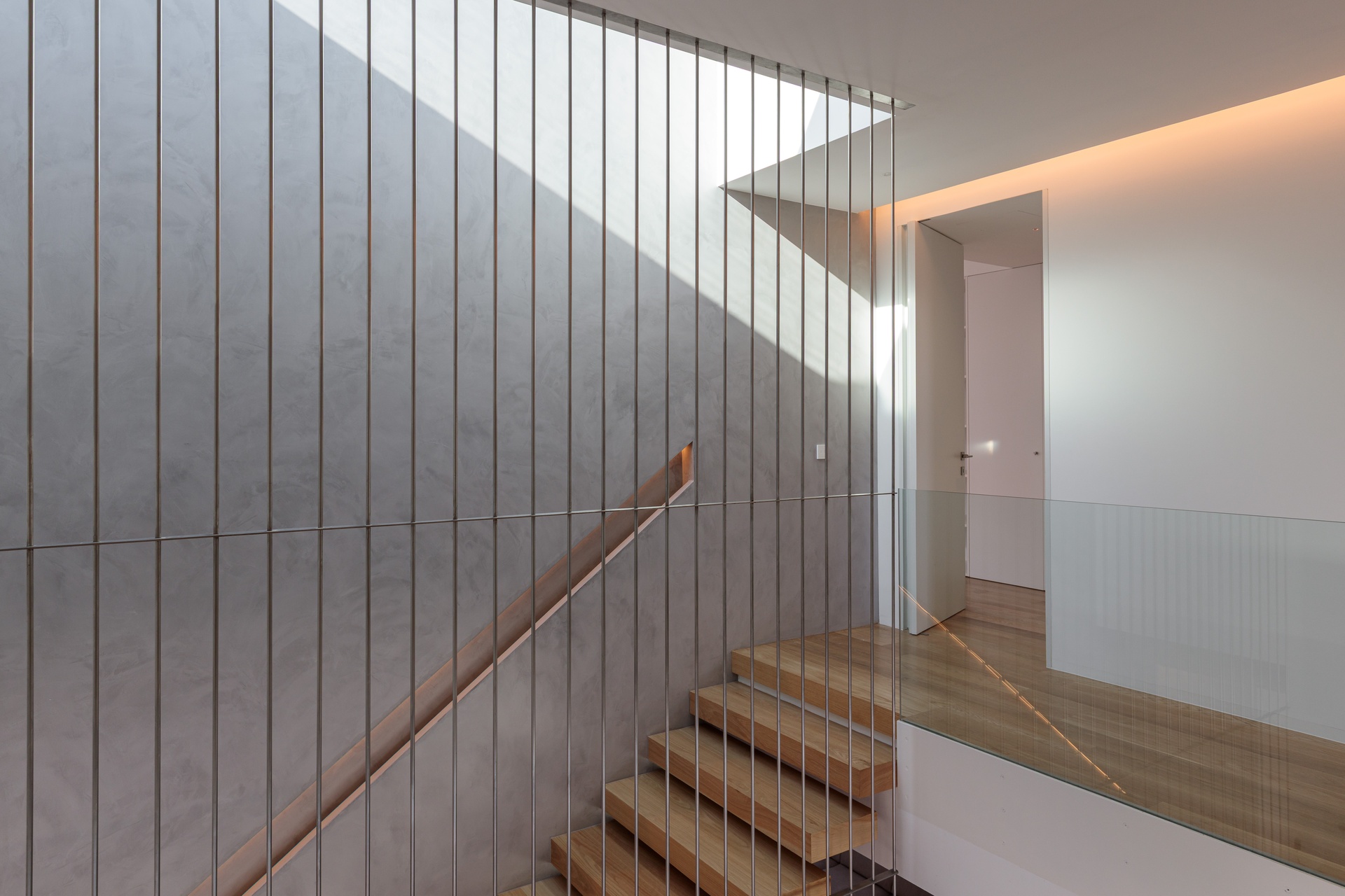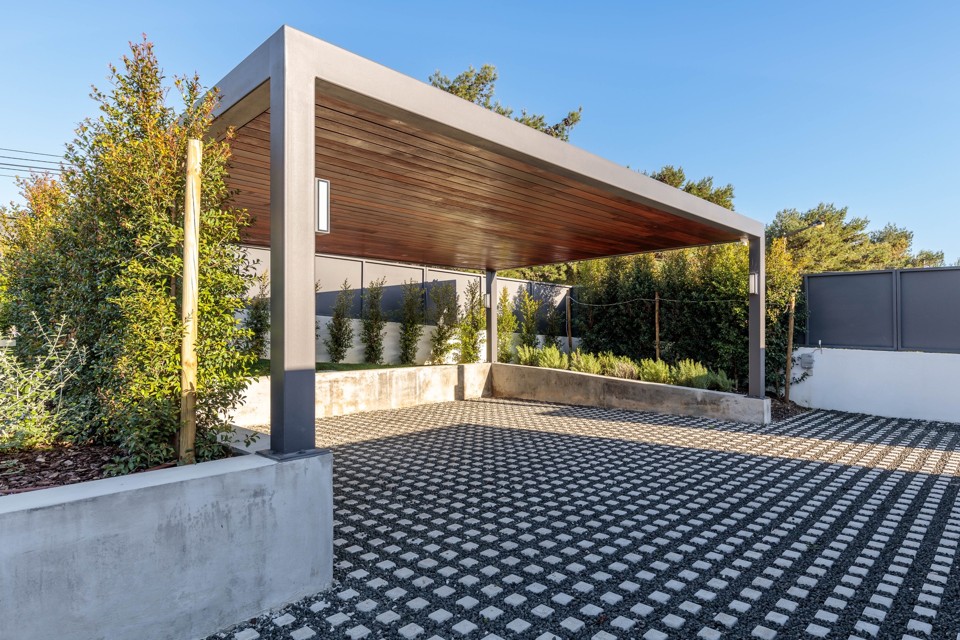 Sun exposure has been optimised to provide an abundance of natural light and privacy throughout the day. Timeless concrete plays a central role in the design, shaping both the exterior and interior spaces with its unique aesthetic. The interior exhibits a blend of white walls and wooden bedroom floors, maintaining a strong minimalist presence that aligns with the architectural design.