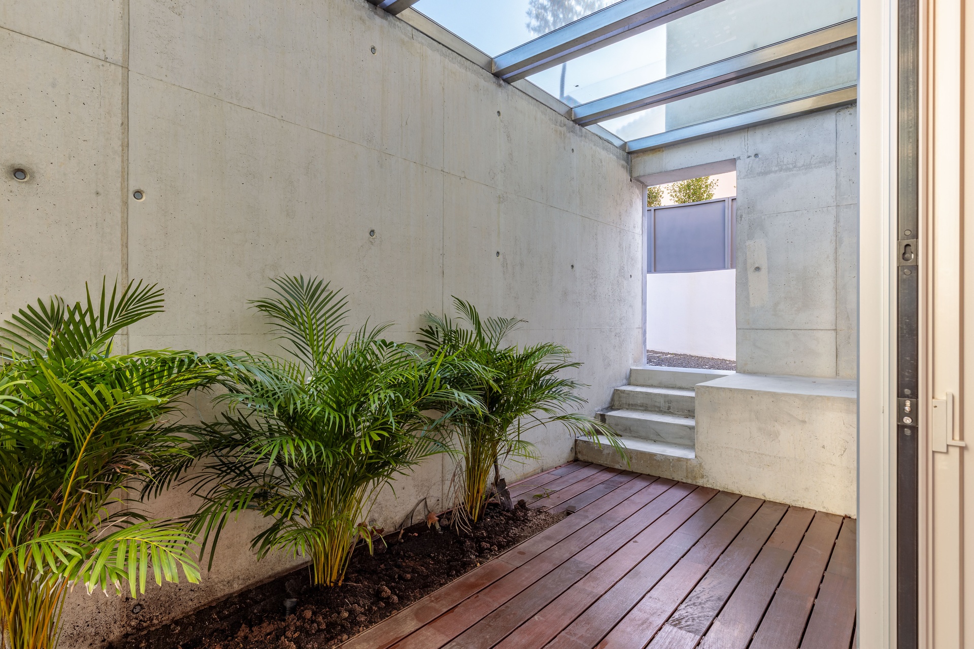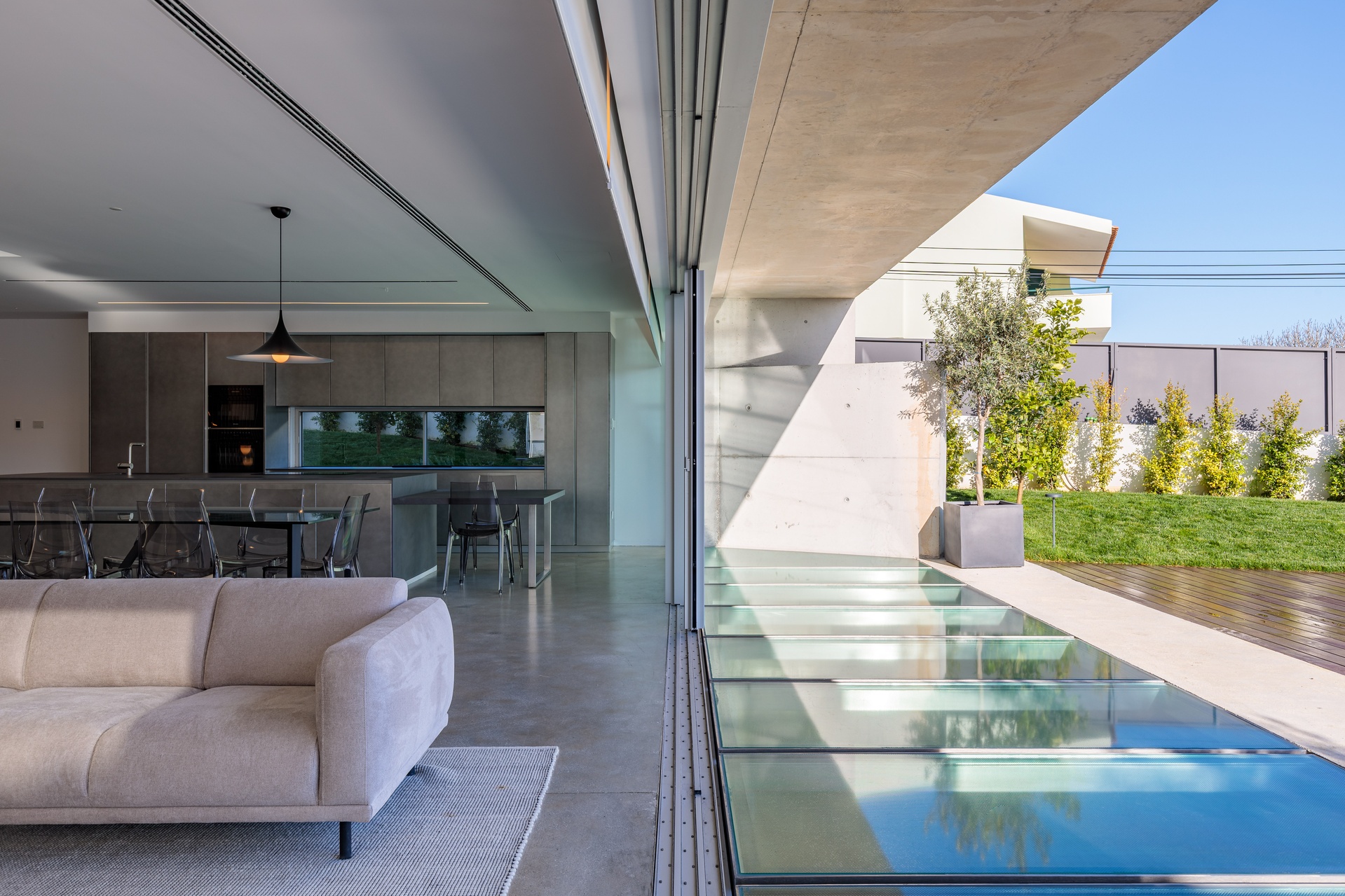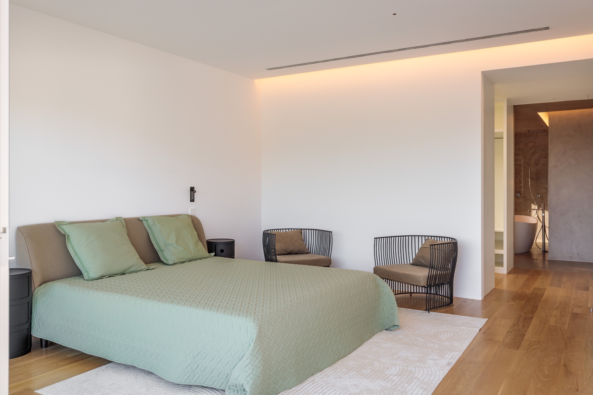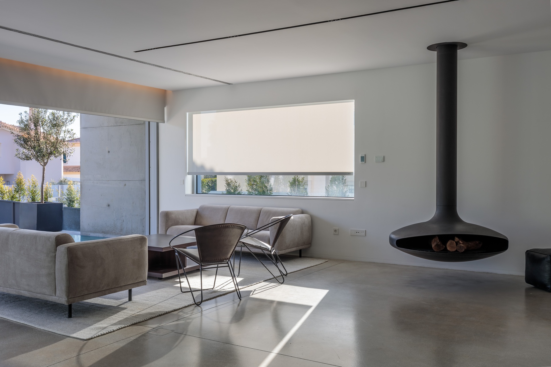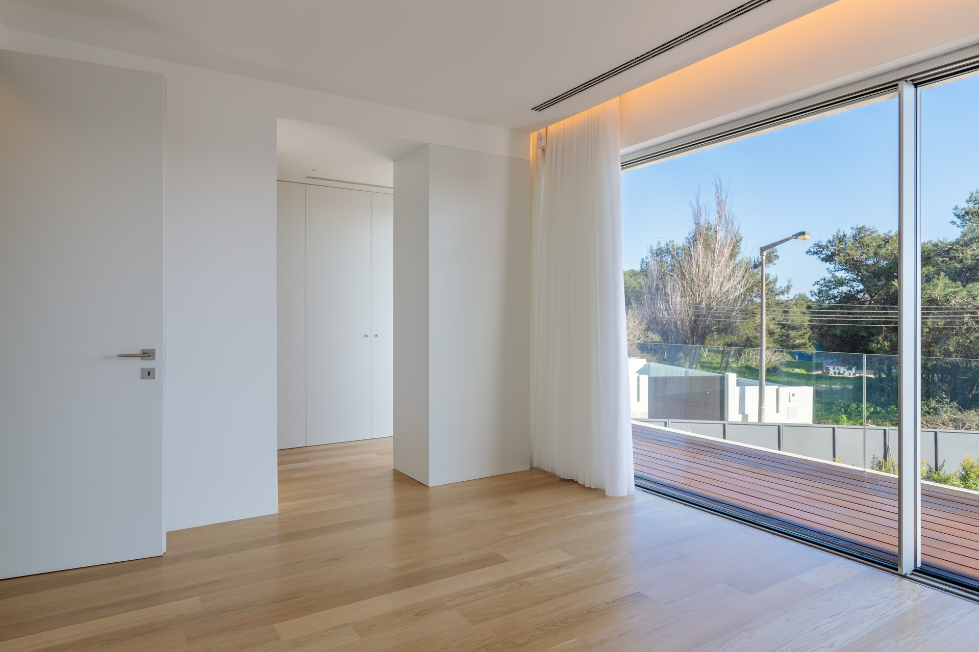 Sun exposure has been optimised to provide an abundance of natural light and privacy throughout the day. Timeless concrete plays a central role in the design, shaping both the exterior and interior spaces with its unique aesthetic. The interior exhibits a blend of white walls and wooden bedroom floors, maintaining a strong minimalist presence that aligns with the architectural design.