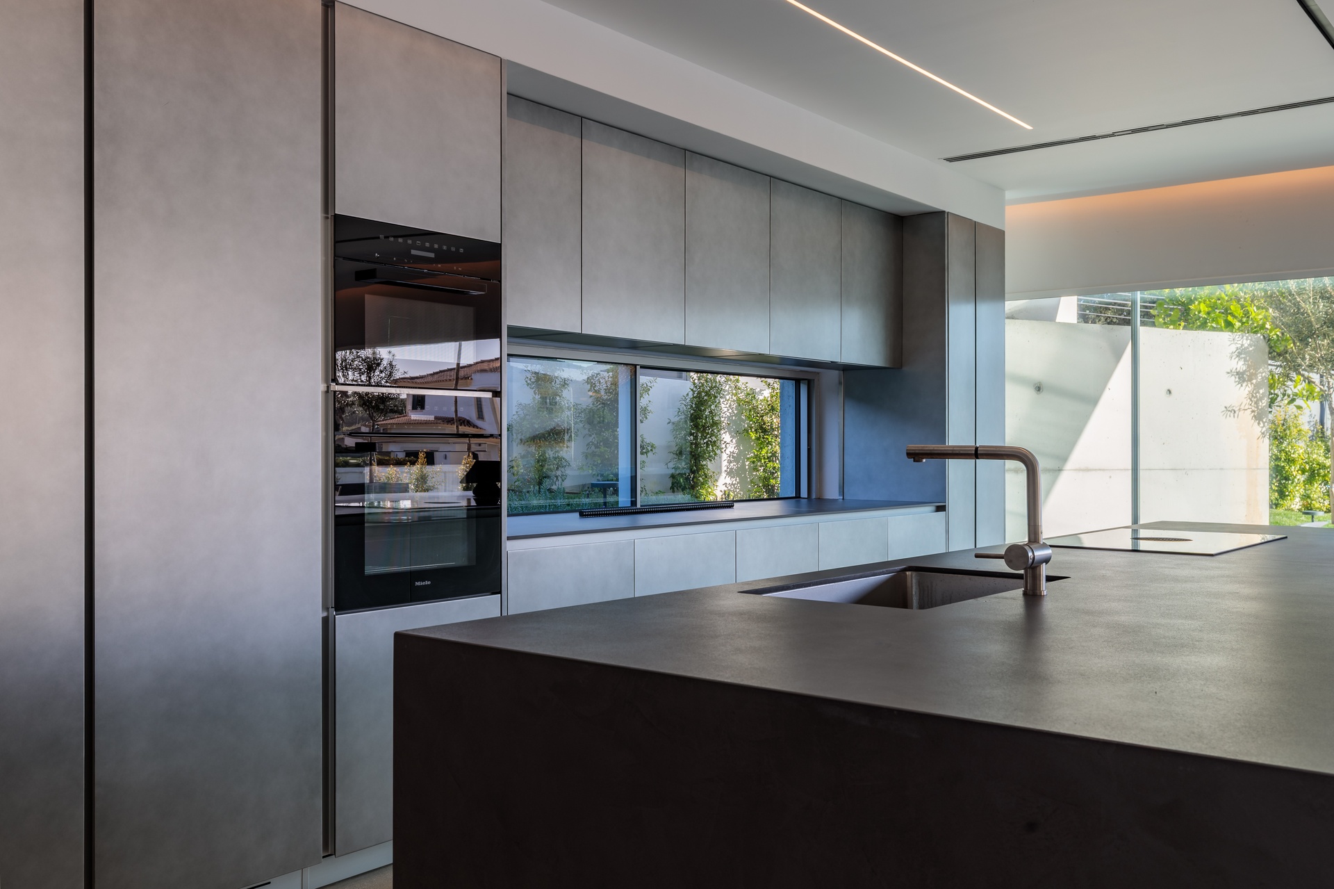The garden seamlessly integrates with the architecture, creating a harmonious unity. Energy efficiency and ecological sustainability were central considerations in the creation of this exceptional residence. The efficient garden features low-maintenance plants that thrive in the Atlantic climate, perfectly complementing the minimalist architectural tone. The garden and natural light seamlessly flow into the lower floor, infusing life and light into the space.
