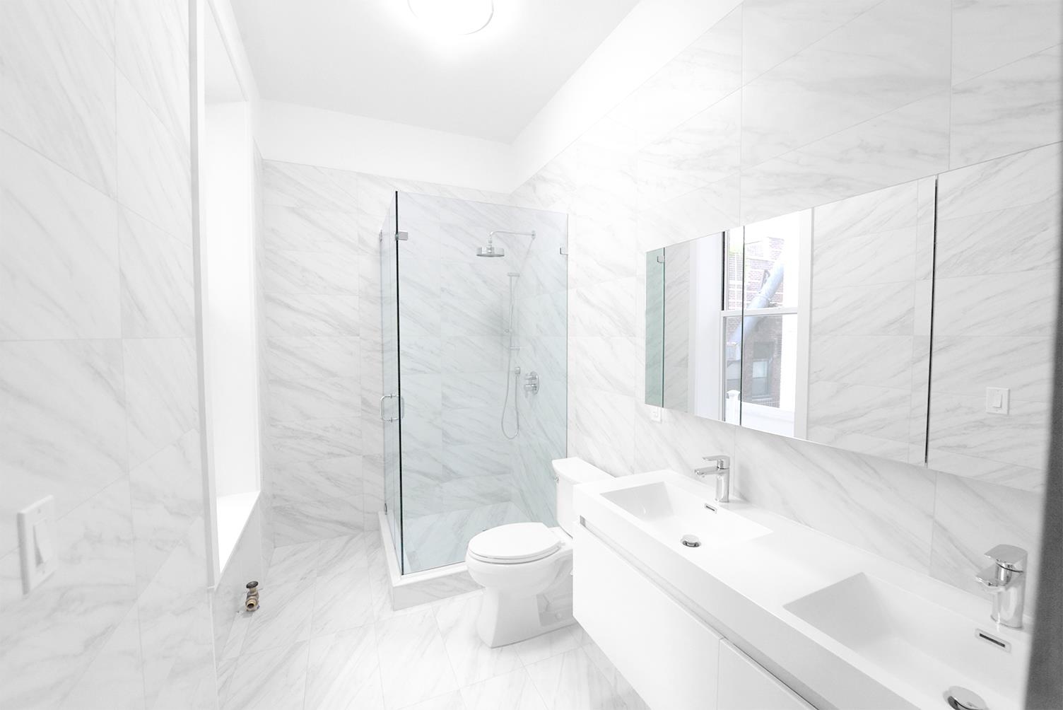 The kitchen features white lacquer cabinets, stainless steel appliances, and a sleek countertop and backsplash. Up a flight of floating stairs and nestled between a brace of outdoor decks, the rooftop bedroom comes with its own closet space and a full bathroom with clean, white-tiled walls and a double vanity sink. While both can be considered typical of city living, each roof deck has a unique atmosphere. With a surround of rising buildings, the north- facing deck confers upon its dwellers a courtyard-like feeling. Given the extra buffer the street and a low-lying neighbor, the south-facing deck enjoys an open view of other rooftops and the local skyline. Rented for $9,750.