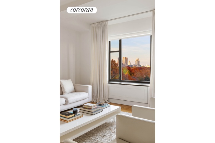 The expansive living/dining room, with a picturesque view of Central Park, invites you to indulge in the ever-changing colors of the seasons through generous 29-foot picture windows.