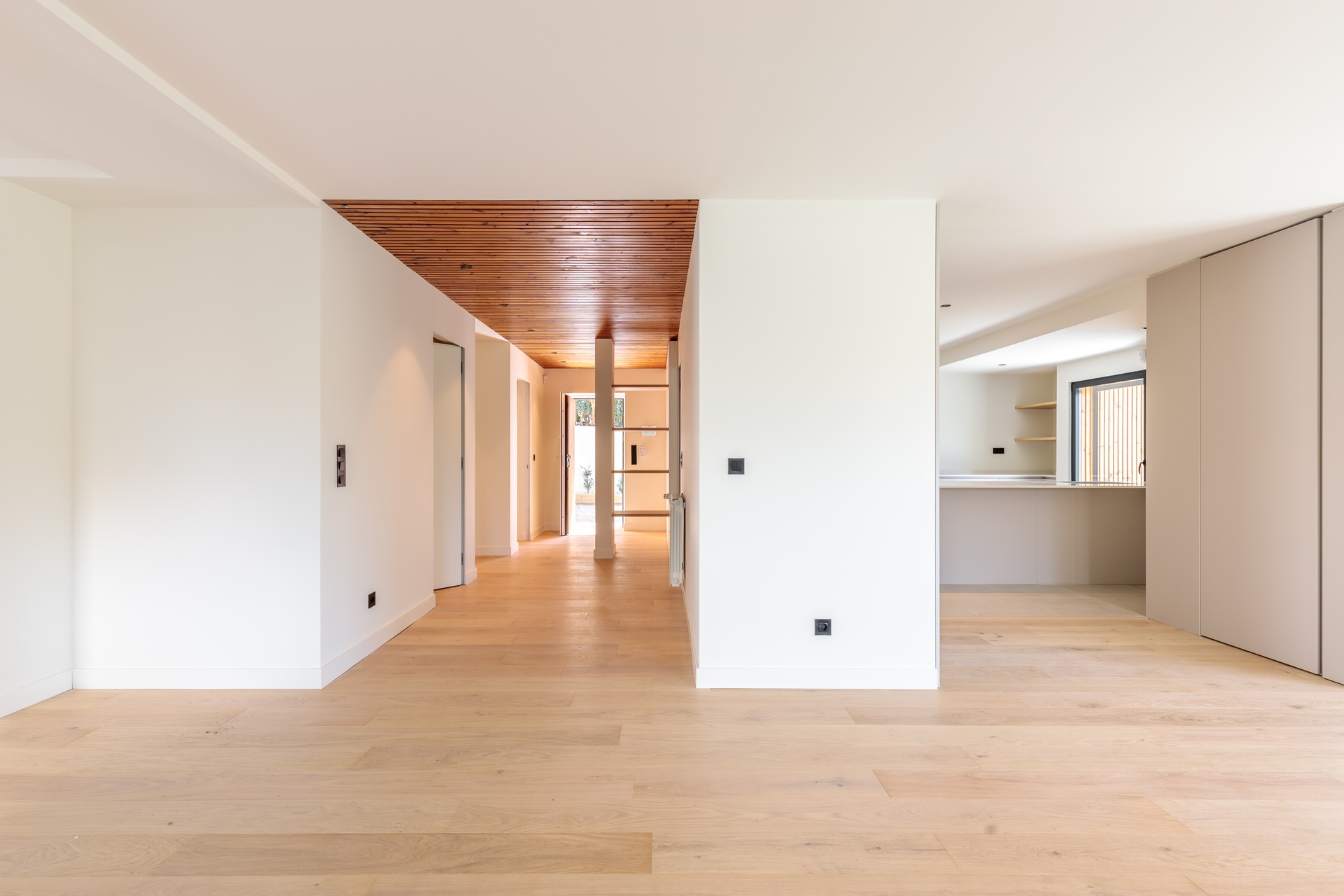 The ground floor is designed with functionality and flow in mind. It features a bright and spacious living room that connects to a dining room, perfect for entertaining or cozy family evenings. The modern kitchen is open towards the dining area, fully equipped and offers plenty of space for cooking and storage.