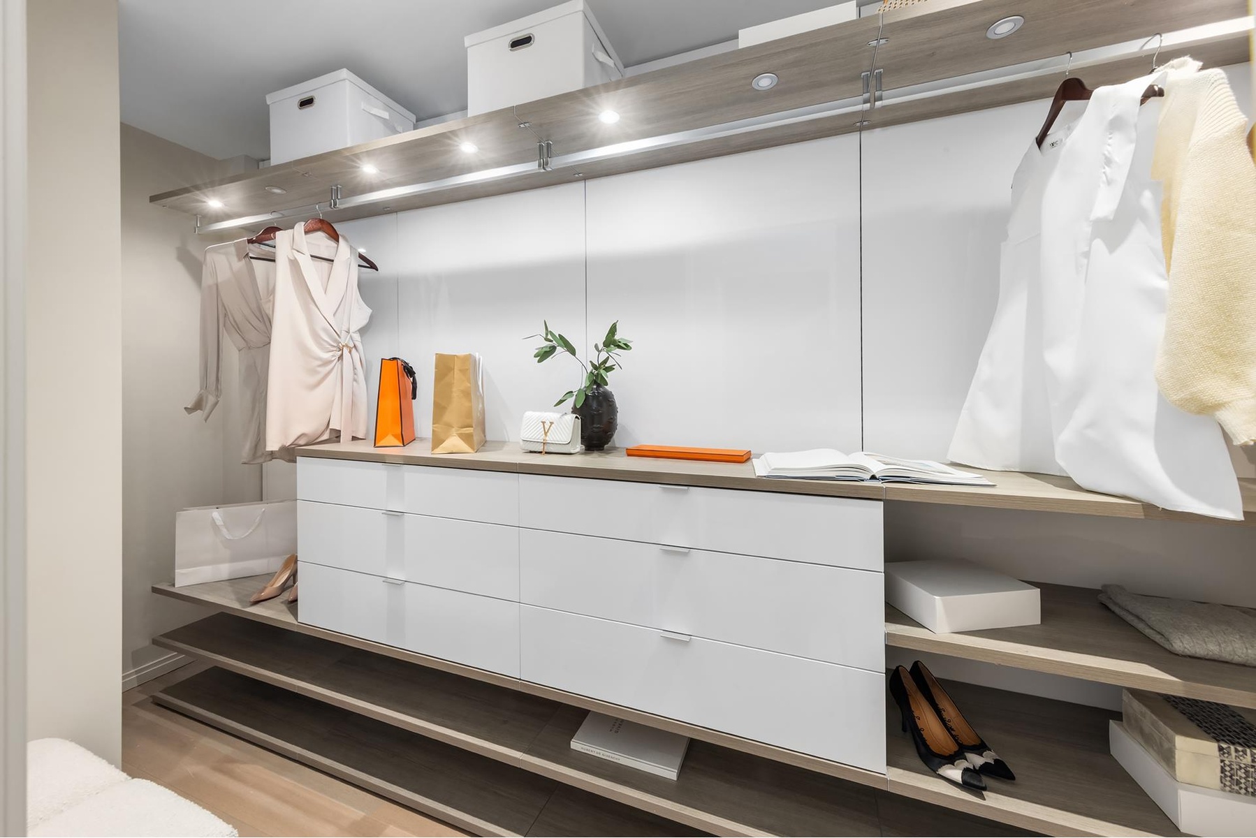 The secondary bedrooms are provided with ample closet space, and each features an en-suite bathroom with heated flooring and a custom walnut vanity with Bianco Dolomiti marble slab countertop and waterfall sides. A laundry closet with Bosch washer/dryer provides additional convenience.