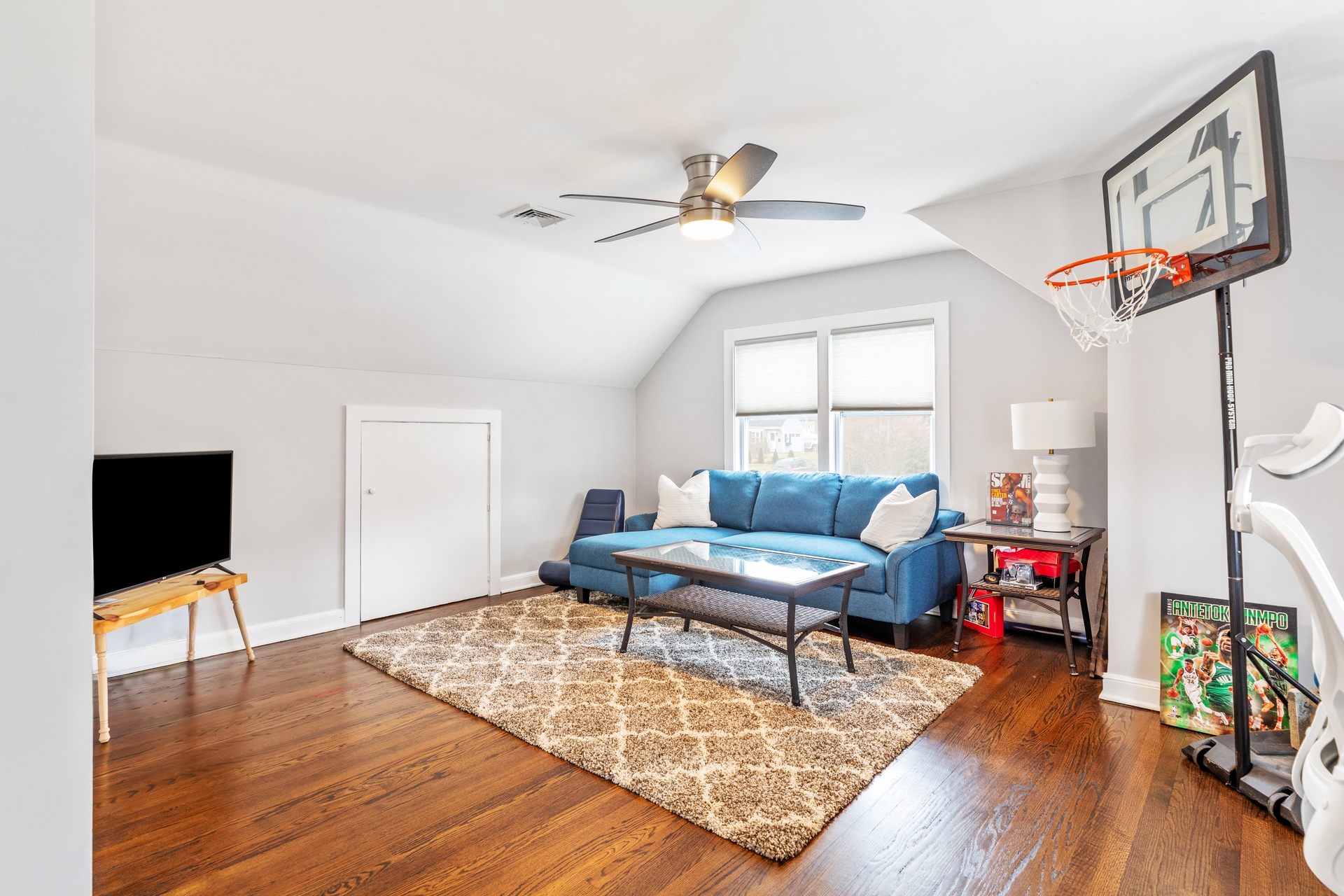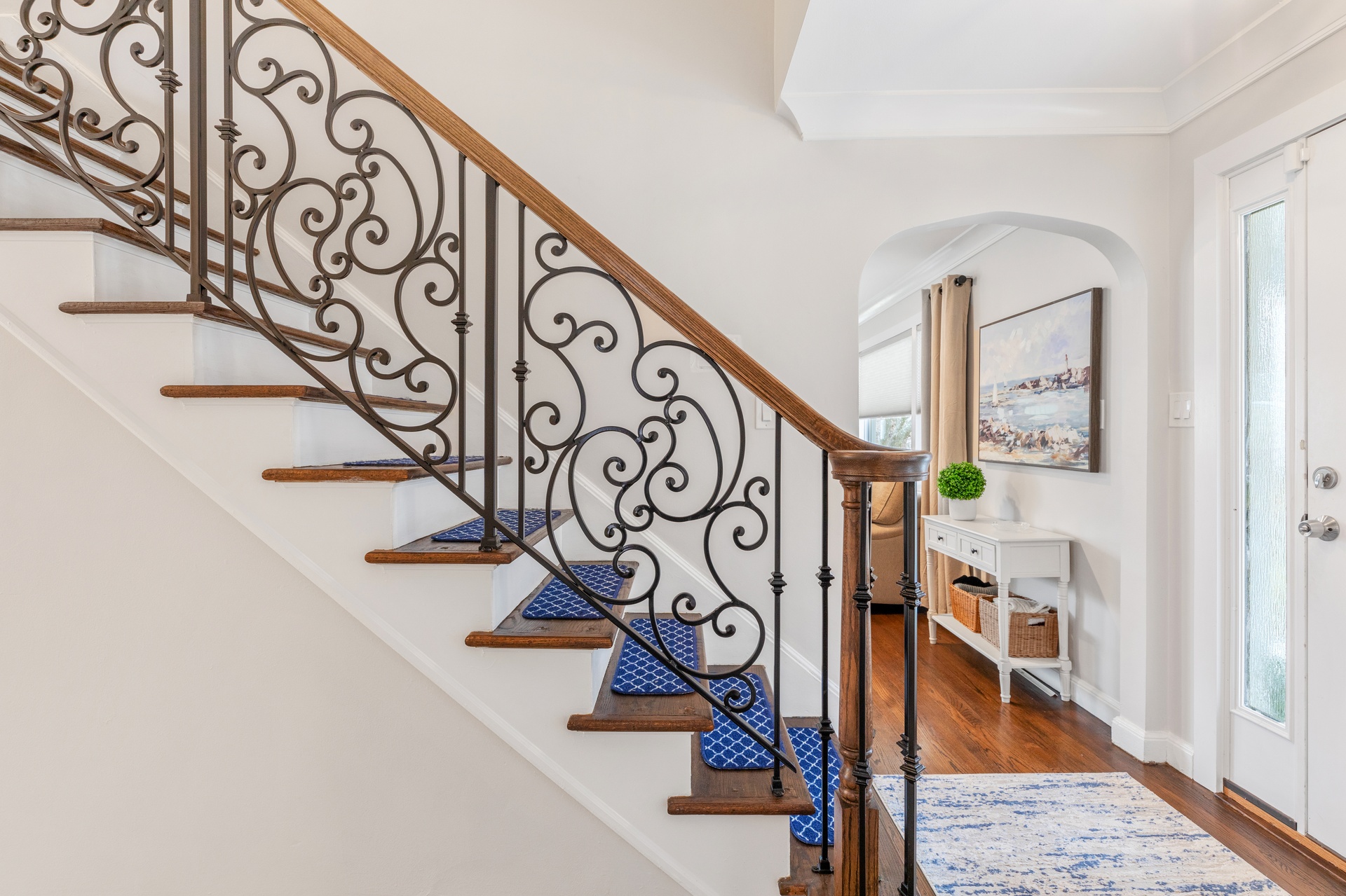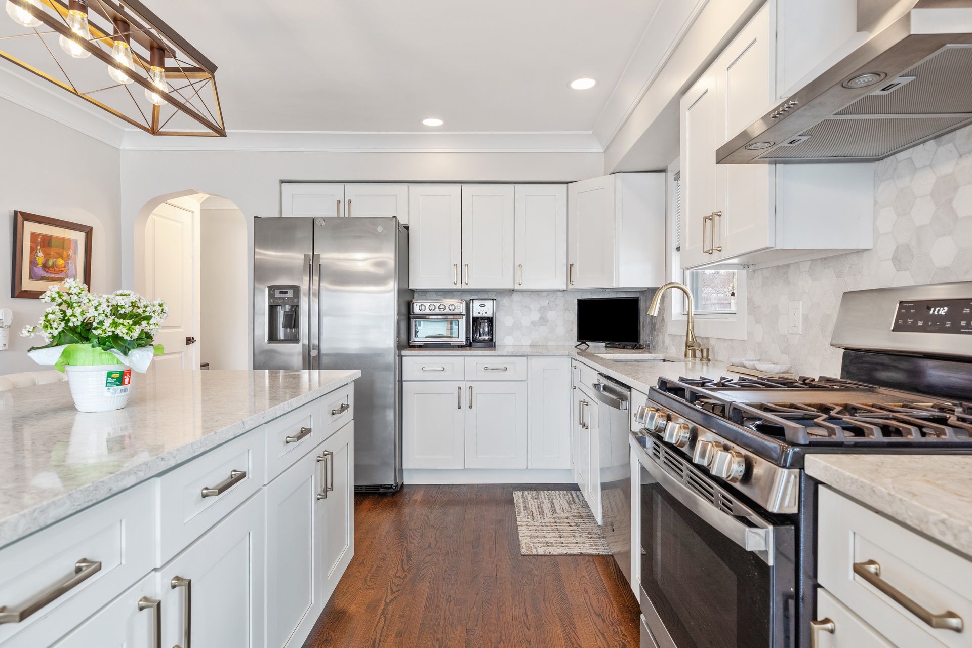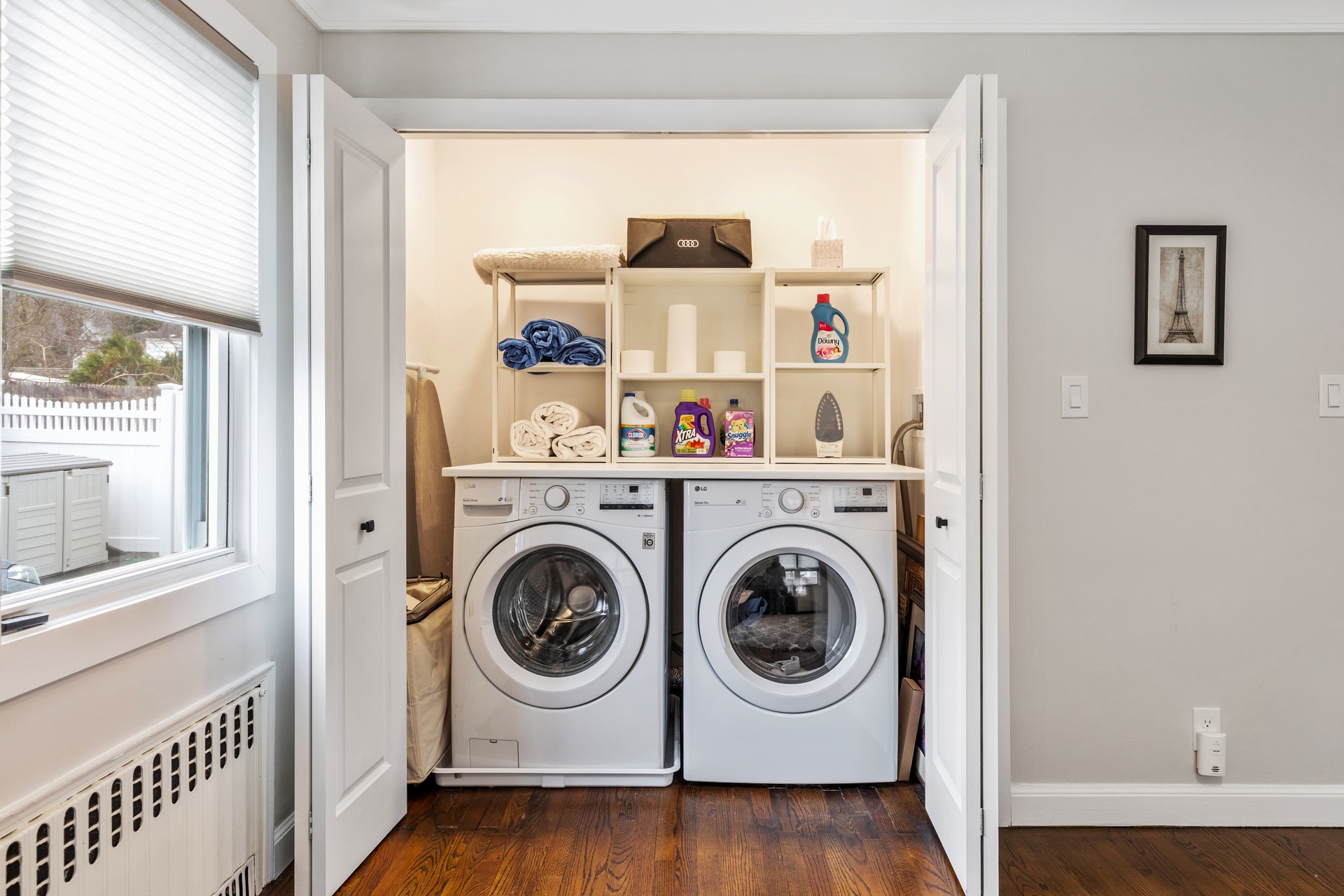 Upon entering, the attention to detail is captivating, The first floor boasts crown molding throughout, creating an air of sophistication. An open plan kitchen, dining, and living room provide a seamless flow, enhanced by expansive sliding doors that offer breathtaking views of the lush yard. The chef-inspired kitchen features quartz countertops, a gas stove with a hood, and updated stainless steel appliances. Warmth and comfort envelop the living room, where a wood-burning fireplace with an electric insert adds charm. Gleaming hardwood floors grace the entire first and second floors. The master bedroom, located on the first floor, boasts an en-suite bath and a walk-in closet with custom shelving. Additionally, a versatile second bedroom, a spacious laundry closet with ample storage, and a tastefully remodeled guest bathroom complete the main level.