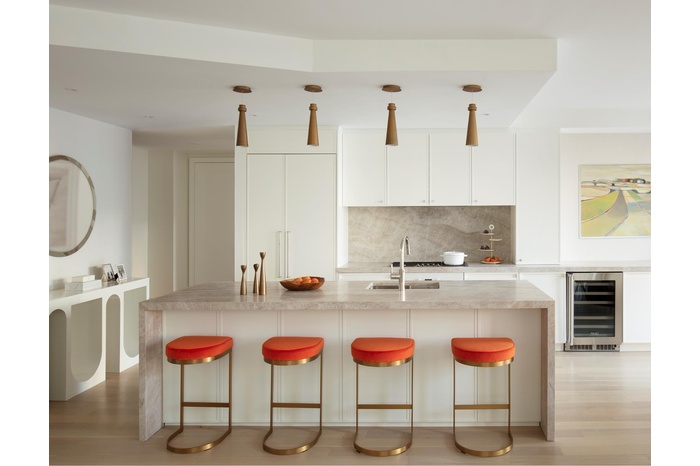 The custom CetraRuddy-designed open kitchen is outfitted with white matte lacquer cabinetry, honed quartzite slab countertop and backsplash, and a full suite of Miele appliances. The oversized kitchen island features a quartzite countertop and waterfall edge that provides ample seating space.