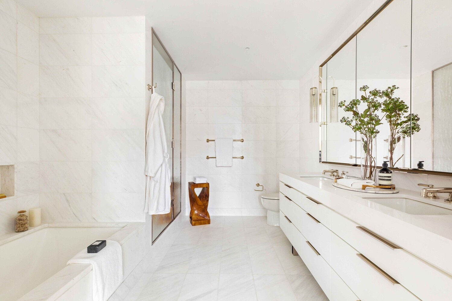 The primary bedroom features an expansive walk-in closet and a thoughtfully appointed ensuite bathroom with Venus White marble tile floors and walls, millwork vanity clad in a leathered textile, custom designed medicine cabinets and wall sconces, and polished nickel fixtures by Waterworks.