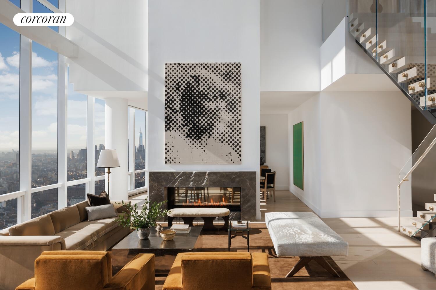 The 88th floor features a dramatic 670 SF great room with 26’ ceilings, a double-sided black slate fireplace, a Bulthaup eat-in kitchen with Miele appliances, a formal dining room, and a library/home office or guest suite. A striking white oak floating staircase leads to the 89th floor, where the primary suite offers dual spa-like bathrooms and dual dressing rooms. Three additional en-suite bedrooms, a sitting room overlooking the great room, and a private elevator complete the home.